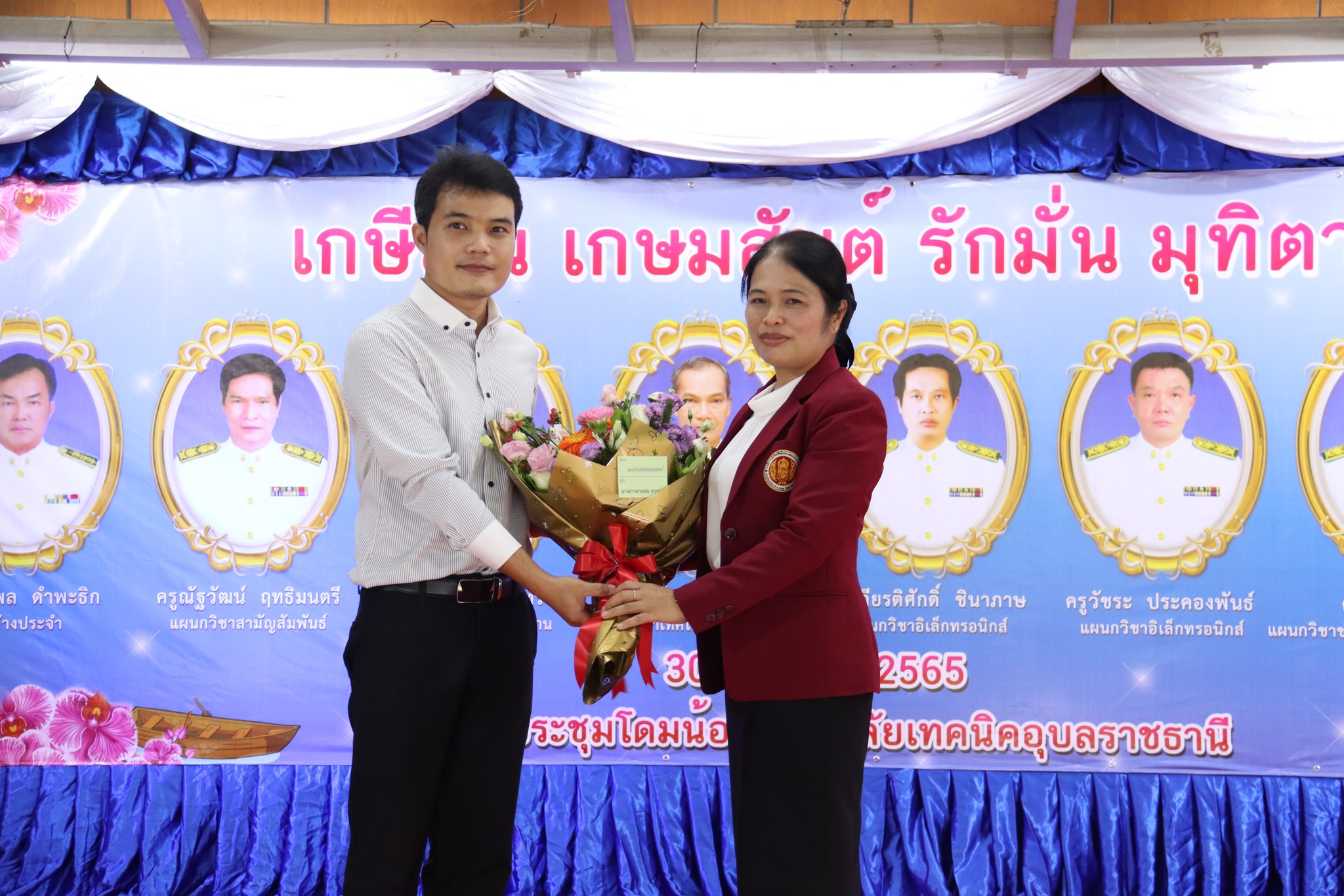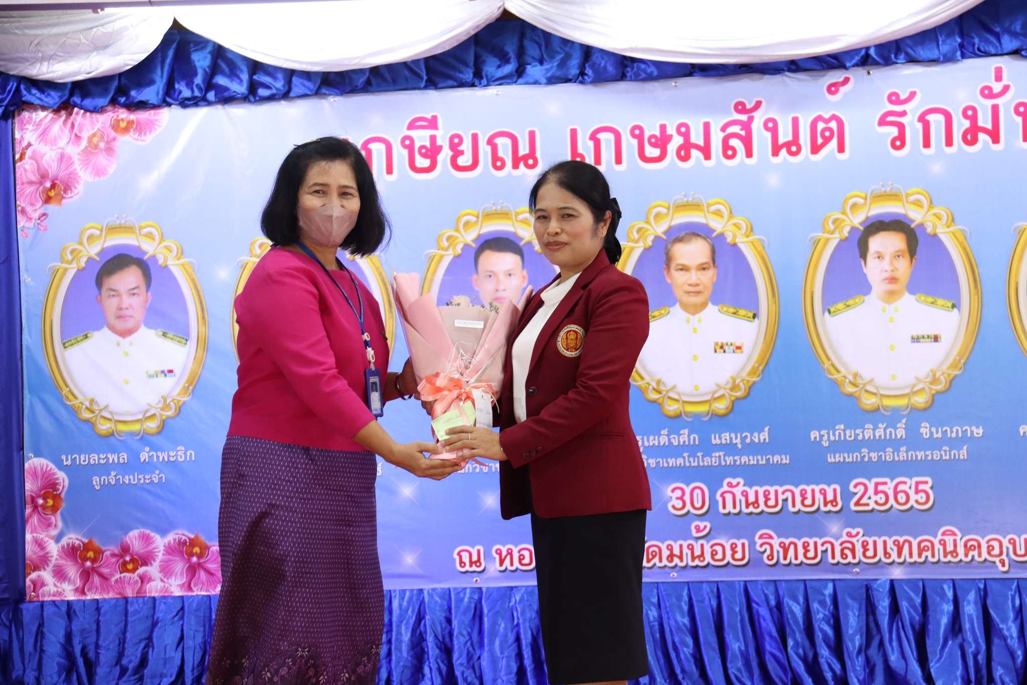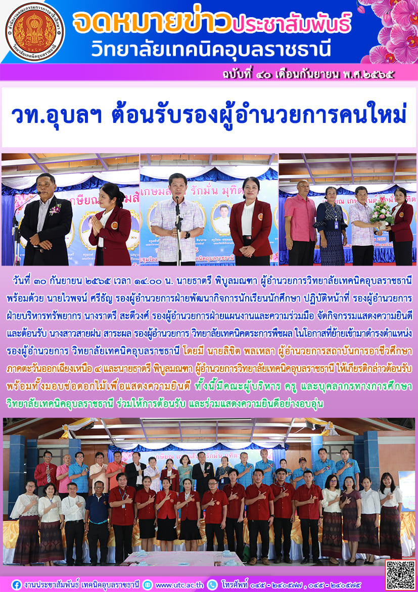 วันที่ ๓๐ กันยายน ๒๕๖๕ เวลา ๑๔.๐๐ น. นายธาตรี พิบูลมณฑา ผู้อำนวยการวิทยาลัยเทคนิคอุบลราชธานี พร้อมด้วย นายไวพจน์ ศรีธัญ รองผู้อำนวยการฝ่ายพัฒนากิจการนักเรียนนักศึกษา ปฏิบัติหน้าที่ รองผู้อำนวยการฝ่ายบริหารทรัพยากร นางราตรี สะดีวงศ์ รองผู้อำนวยการฝ่ายแผนงานและความร่วมมือ จัดกิจกรรมแสดงความยินดี และต้อนรับ นางสาวสายฝน สาระผล รองผู้อำนวยการ วิทยาลัยเทคนิคตระการพืชผล ในโอกาสที่ย้ายเข้ามาดำรงตำแหน่ง รองผู้อำนวยการ วิทยาลัยเทคนิคอุบลราชธานี โดยมี นายลิขิต พลเหลา ผู้อำนวยการสถาบันการอาชีวศึกษาภาคตะวันออกเฉียงเหนือ ๔ และนายธาตรี พิบูลมณฑา ผู้อำนวยการวิทยาลัยเทคนิคอุบลราชธานี ให้เกียรติกล่าวต้อนรับ พร้อมทั้งมอบช่อดอกไม้เพื่อแสดงความยินดี ทั้งนี้มีคณะผู้บริหาร ครู และบุคลากรทางการศึกษา วิทยาลัยเทคนิคอุบลราชธานี ร่วมให้การต้อนรับ และร่วมแสดงความยินดีอย่างอบอุ่น