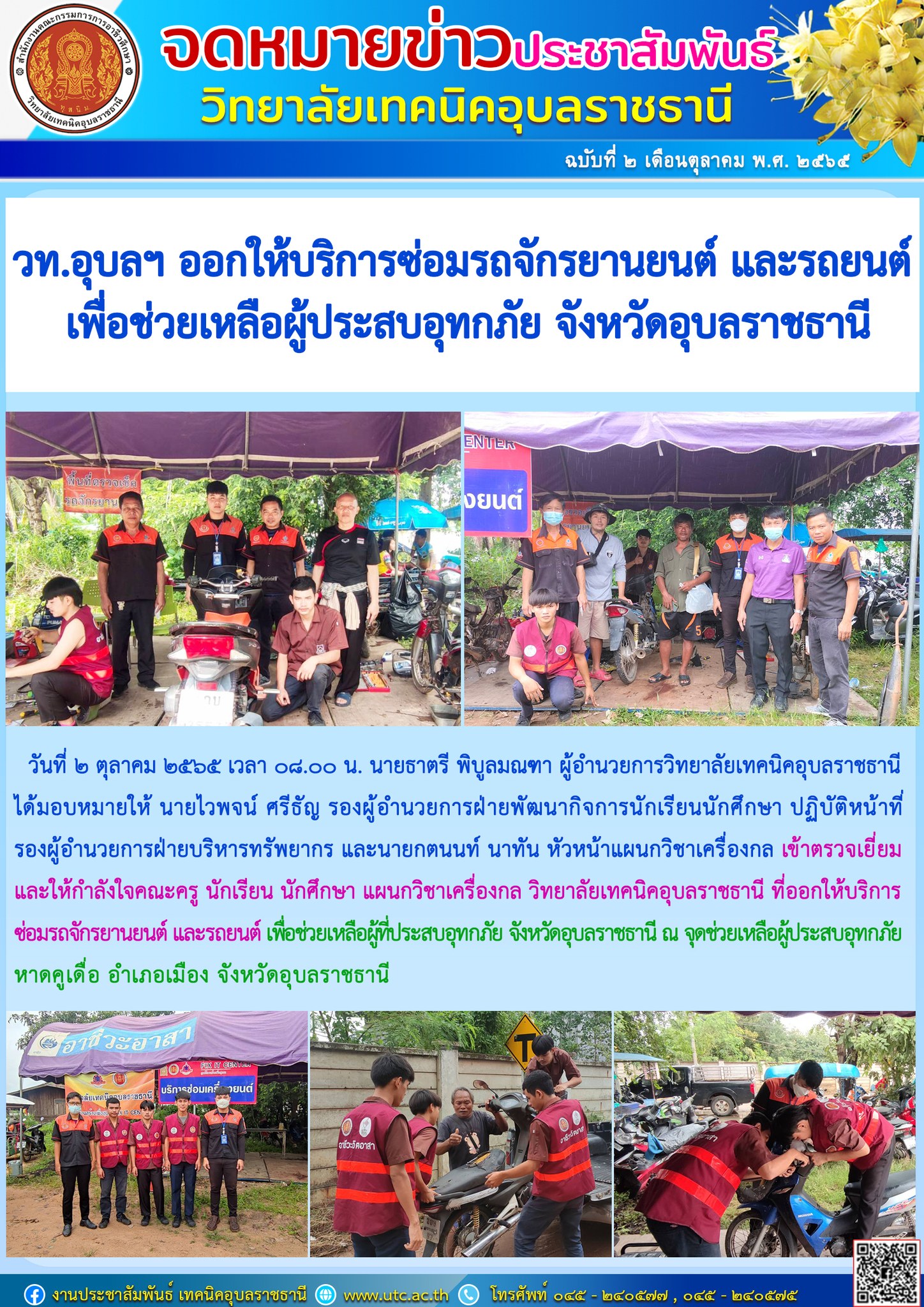 วันที่ ๒ ตุลาคม๒๕๖๕ เวลา ๐๘.๐๐ น. นายธาตรี พิบูลมณฑา ผู้อำนวยการวิทยาลัยเทคนิคอุบลราชธานี ได้มอบหมายให้ นายไวพจน์ ศรีธัญ รองผู้อำนวยการฝ่ายพัฒนากิจการนักเรียนนักศึกษา ปฏิบัติหน้าที่ รองผู้อำนวยการฝ่ายบริหารทรัพยากร และนายกตนนท์ นาทัน หัวหน้าแผนกวิชาเครื่องกล เข้าตรวจเยี่ยมและให้กำลังใจคณะครู นักเรียน นักศึกษา แผนกวิชาเครื่องกล วิทยาลัยเทคนิคอุบลราชธานี ที่ออกให้บริการซ่อมรถจักรยานยนต์ และรถยนต์ เพื่อช่วยเหลือผู้ที่ประสบอุทกภัย จังหวัดอุบลราชธานี ณ จุดช่วยเหลือผู้ประสบอุทกภัยหาดคูเดื่อ อำเภอเมือง จังหวัดอุบลราชธานี