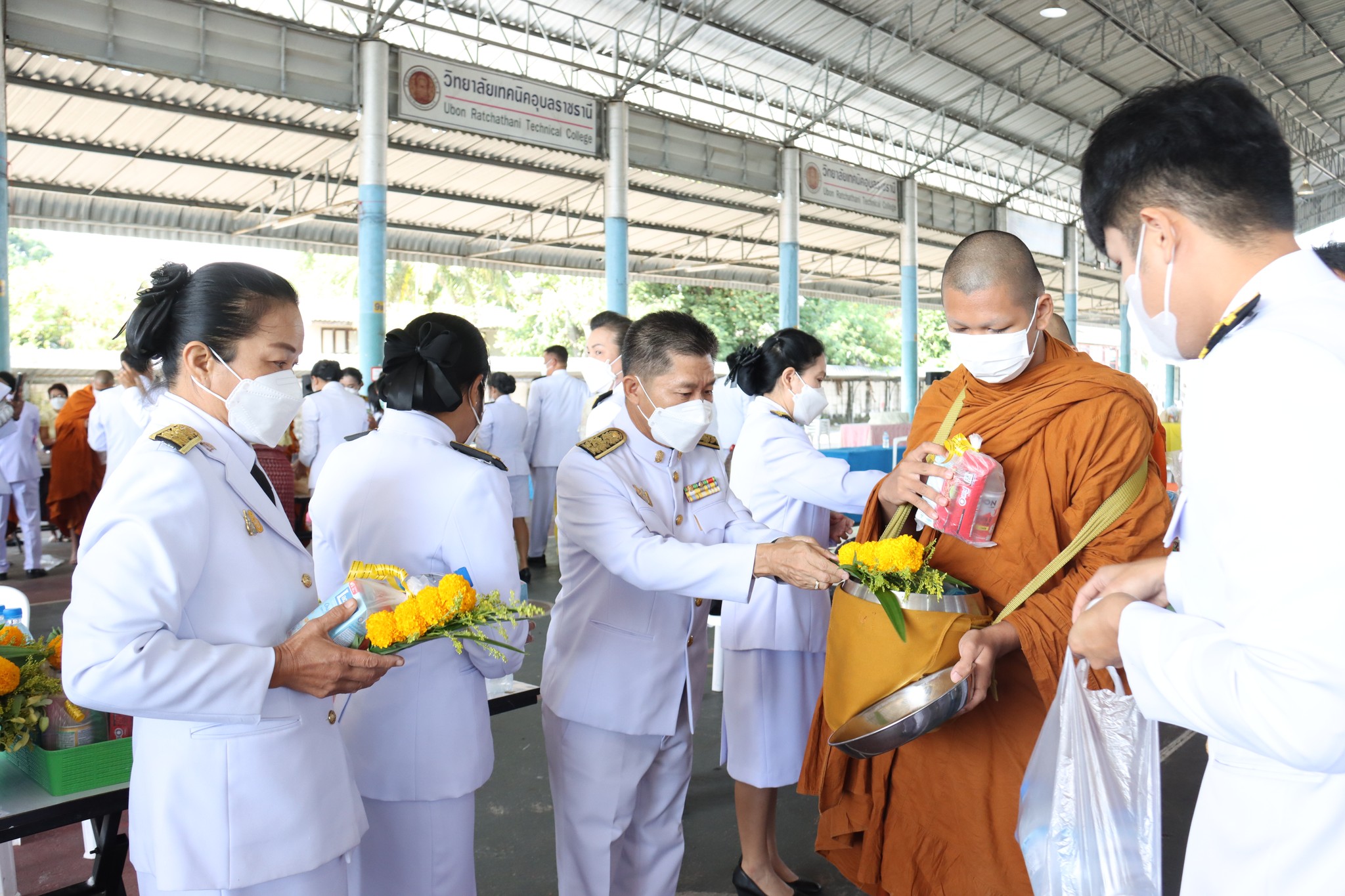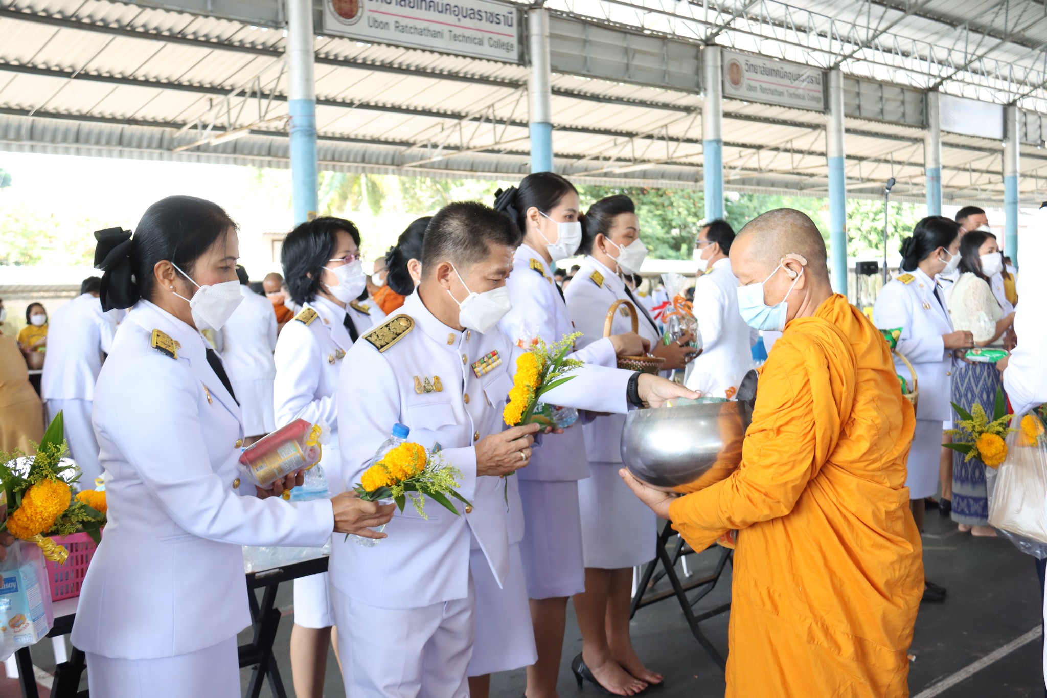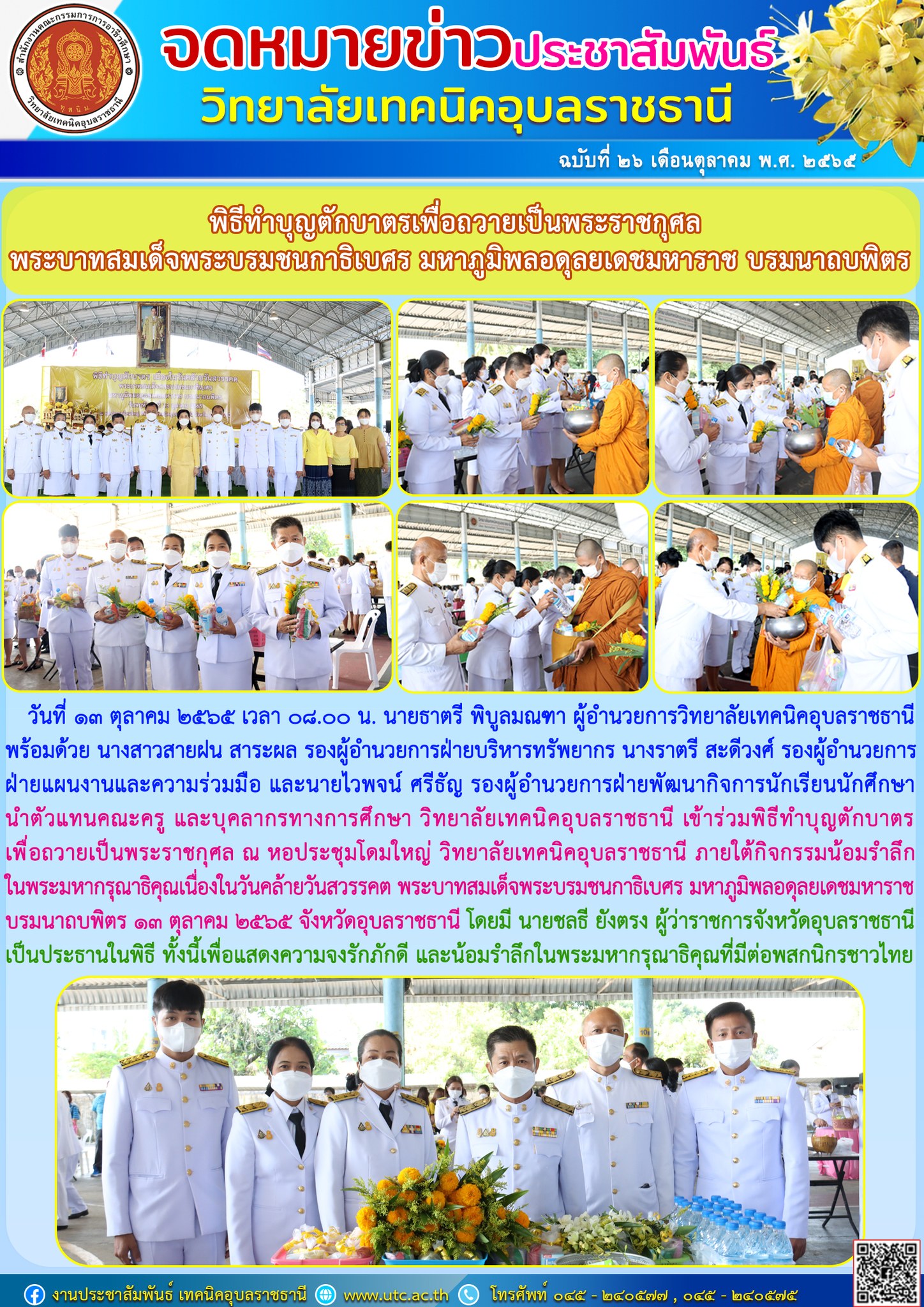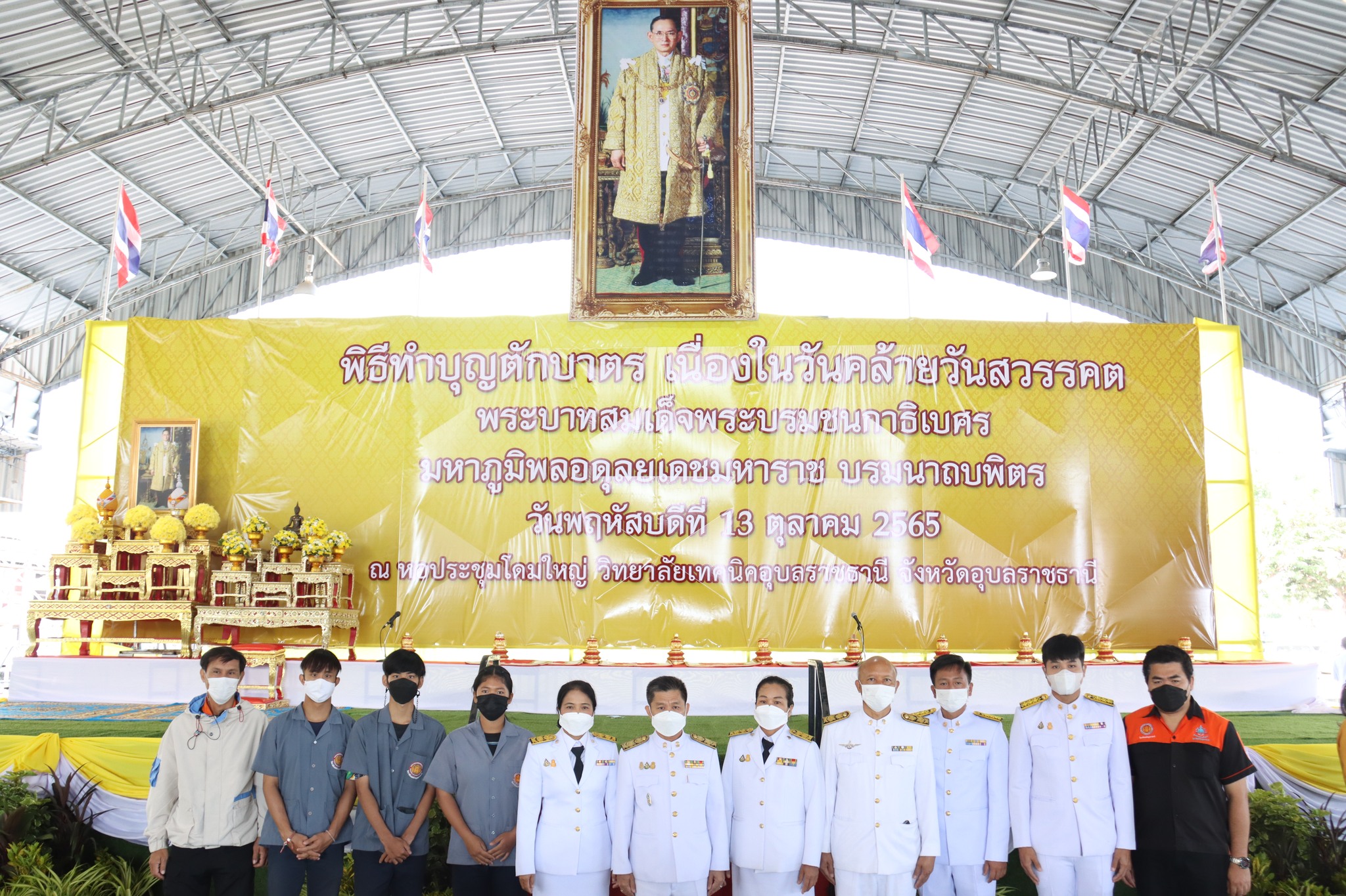 วันที่ ๑๓ ตุลาคม ๒๕๖๕ เวลา ๐๘.๐๐ น. นายธาตรี พิบูลมณฑาผู้อำนวยการวิทยาลัยเทคนิคอุบลราชธานี พร้อมด้วย นางสาวสายฝน สาระผล รองผู้อำนวยการฝ่ายบริหารทรัพยากร นางราตรี สะดีวงศ์ รองผู้อำนวยการ ฝ่ายแผนงานและความร่วมมือ และนายไวพจน์ ศรีธัญ รองผู้อำนวยการฝ่ายพัฒนากิจการนักเรียนนักศึกษา นำตัวแทนคณะครู และบุคลากรทางการศึกษา วิทยาลัยเทคนิคอุบลราชธานี เข้าร่วมพิธีทำบุญตักบาตร เพื่อถวายเป็นพระราชกุศล ณ หอประชุมโดมใหญ่ วิทยาลัยเทคนิคอุบลราชธานี ภายใต้กิจกรรมน้อมรำลึก ในพระมหากรุณาธิคุณเนื่องในวันคล้ายวันสวรรคต พระบาทสมเด็จพระบรมชนกาธิเบศร มหาภูมิพลอดุลยเดชมหาราช บรมนาถบพิตร ๑๓ ตุลาคม ๒๕๖๕ จังหวัดอุบลราชธานี โดยมี นายชลธี ยังตรง ผู้ว่าราชการจังหวัดอุบลราชธานี เป็นประธานในพิธี ทั้งนี้เพื่อแสดงความจงรักภักดี และน้อมรำลึกในพระมหากรุณาธิคุณที่มีต่อพสกนิกรชาวไทย