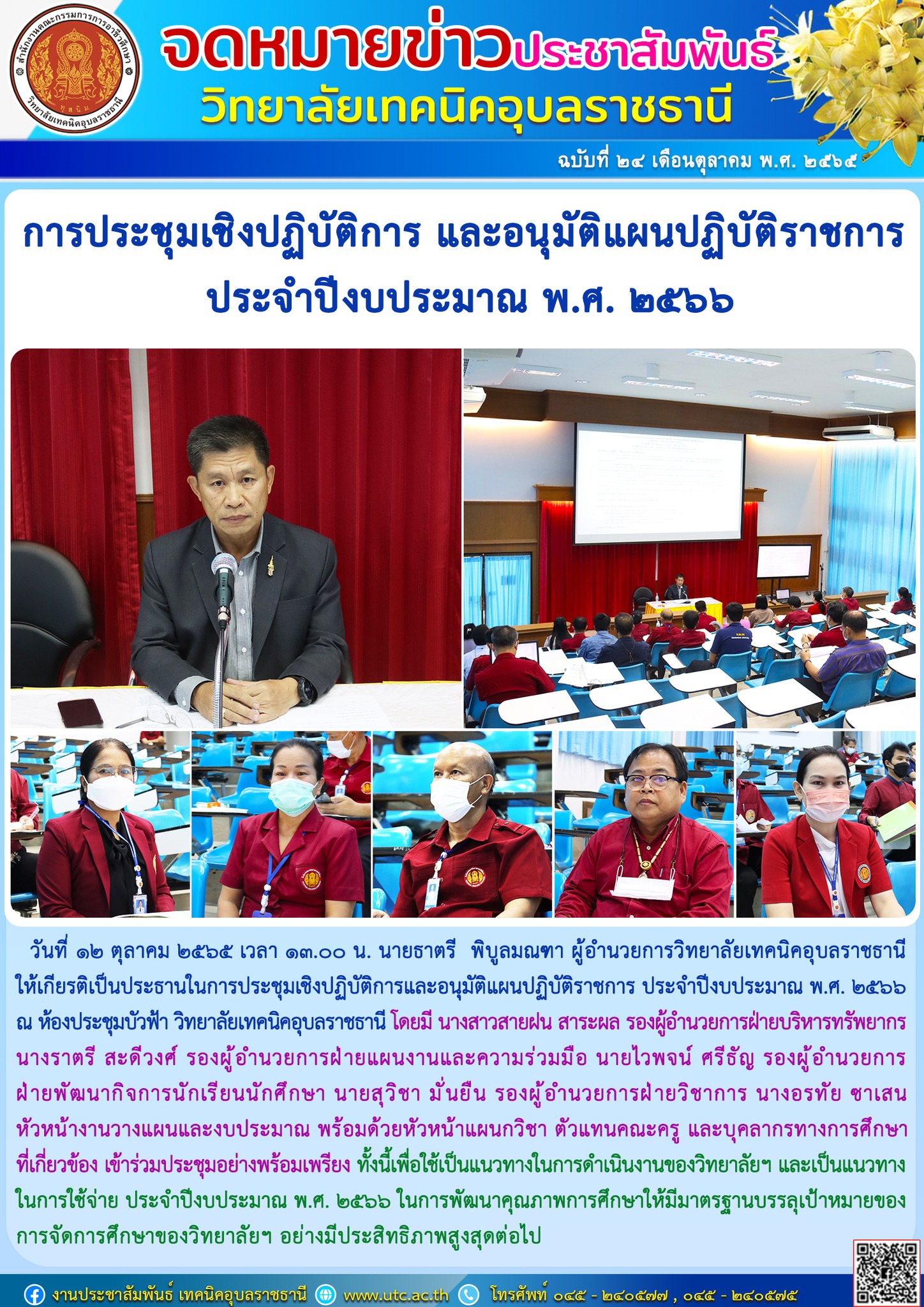 วันที่ ๑๒ ตุลาคม ๒๕๖๕ เวลา ๑๓.๐๐ น. นายธาตรี พิบูลมณฑา ผู้อำนวยการวิทยาลัยเทคนิคอุบลราชธานี ให้เกียรติเป็นประธานในการประชุมเชิงปฏิบัติการและอนุมัติแผนปฏิบัติราชการ ประจำปีงบประมาณ พ.ศ. ๒๕๖๖ ณ ห้องประชุมบัวฟ้า วิทยาลัยเทคนิคอุบลราชธานี โดยมี นางราตรี สะดีวงศ์ รองผู้อำนวยการฝ่ายแผนงานและความร่วมมือ นางสาวสายฝน สาระผล รองผู้อำนวยการฝ่ายบริหารทรัพยากร นายไวพจน์ ศรีธัญ รองผู้อำนวยการฝ่ายพัฒนากิจการนักเรียนนักศึกษา นายสุวิชา มั่นยืน รองผู้อำนวยการฝ่ายวิชาการ นางอรทัย ซาเสน หัวหน้างานวางแผนและงบประมาณ พร้อมด้วยหัวหน้าแผนกวิชา ตัวแทนคณะครู และบุคลากรทางการศึกษาที่เกี่ยวข้อง เข้าร่วมประชุมอย่างพร้อมเพรียง ทั้งนี้เพื่อใช้เป็นแนวทางในการดำเนินงานของวิทยาลัยฯ และเป็นแนวทางในการใช้จ่าย ประจำปีงบประมาณ พ.ศ. ๒๕๖๖ ในการพัฒนาคุณภาพการศึกษาให้มีมาตรฐานบรรลุเป้าหมายของการจัดการศึกษาของวิทยาลัยฯ อย่างมีประสิทธิภาพสูงสุดต่อไป