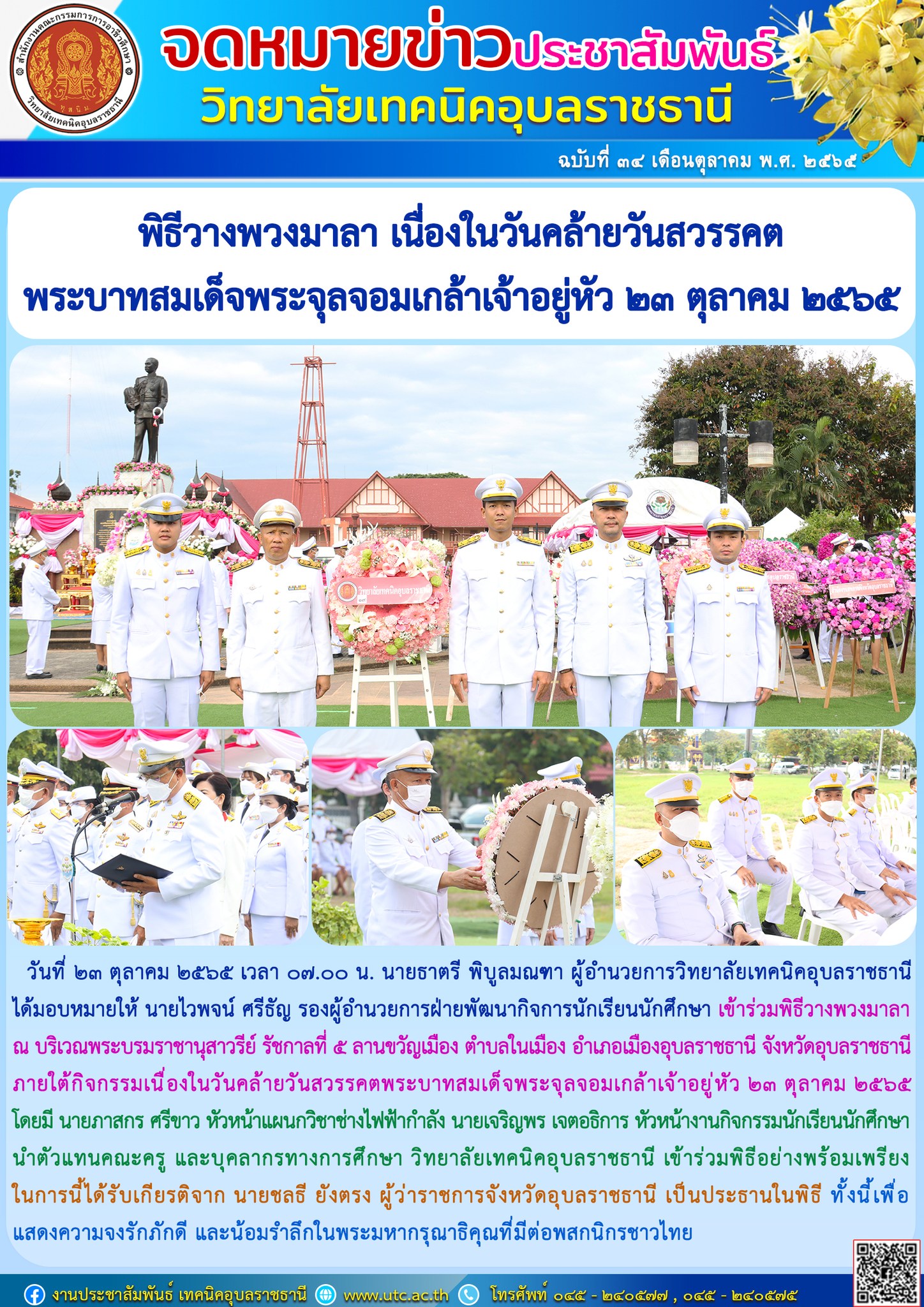 วันที่ ๒๓ ตุลาคม ๒๕๖๕ เวลา ๐๗.๐๐ น. นายธาตรี พิบูลมณฑาผู้อำนวยการวิทยาลัยเทคนิคอุบลราชธานี ได้มอบหมายให้ นายไวพจน์ ศรีธัญ รองผู้อำนวยการฝ่ายพัฒนากิจการนักเรียนนักศึกษา เข้าร่วมพิธีวางพวงมาลา ณ บริเวณพระบรมราชานุสาวรีย์ รัชกาลที่ ๕ ลานขวัญเมือง ตำบลในเมือง อำเภอเมืองอุบลราชธานี จังหวัดอุบลราชธานี ภายใต้กิจกรรมเนื่องในวันคล้ายวันสวรรคตพระบาทสมเด็จพระจุลจอมเกล้าเจ้าอยู่หัว ๒๓ ตุลาคม ๒๕๖๕ โดยมี นายภาสกร ศรีขาว หัวหน้าแผนกวิชาช่างไฟฟ้ากำลัง นายเจริญพร เจตอธิการ หัวหน้างานกิจกรรมนักเรียนนักศึกษานำตัวแทนคณะครู และบุคลากรทางการศึกษา วิทยาลัยเทคนิคอุบลราชธานี เข้าร่วมพิธีอย่างพร้อมเพรียง ในการนี้ได้รับเกียรติจาก นายชลธี ยังตรง ผู้ว่าราชการจังหวัดอุบลราชธานี เป็นประธานในพิธี ทั้งนี้เพื่อแสดงความจงรักภักดี และน้อมรำลึกในพระมหากรุณาธิคุณที่มีต่อพสกนิกรชาวไทย