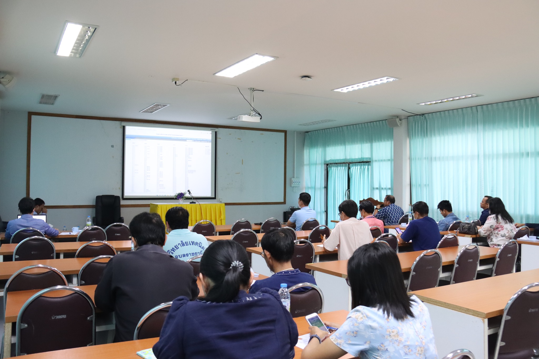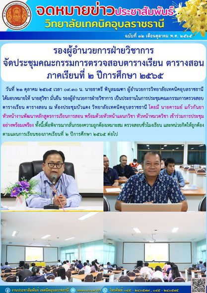 วันที่ ๒๑ ตุลาคม ๒๕๖๕ เวลา ๐๙.๓๐ น. นายธาตรี พิบูลมณฑา ผู้อำนวยการวิทยาลัยเทคนิคอุบลราชธานีได้มอบหมายให้ นายสุวิชา มั่นยืน รองผู้อำนวยการฝ่ายวิชาการ เป็นประธานในการประชุมคณะกรรมการตรวจสอบตารางเรียน ตารางสอน ณ ห้องประชุมบัวแดง วิทยาลัยเทคนิคอุบลราชธานี โดยมี นายคารมย์ แก้วกันยา หัวหน้างานพัฒนาหลักสูตรการเรียนการสอน พร้อมด้วยหัวหน้าแผนกวิชา หัวหน้าหมวดวิชา เข้าร่วมการประชุมอย่างพร้อมเพรียง ทั้งนี้เพื่อพิจารณากลั่นกรองความถูกต้องเหมาะสม ตรวจสอบชั่วโมงเรียน และหน่วยกิตให้ถูกต้อง ตามแผนการเรียนของภาคเรียนที่ ๒ ปีการศึกษา ๒๕๖๕ ต่อไป