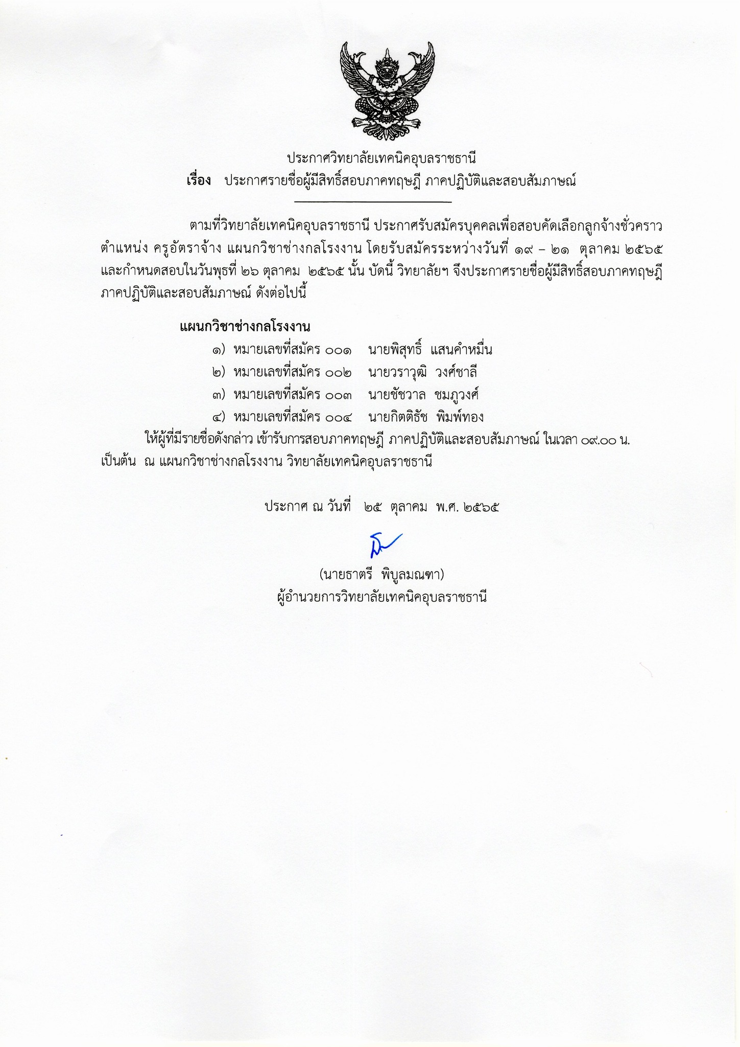 ตามที่วิทยาลัยเทคนิคอุบลราชธานี ประกาศรับสมัครบุคคลเพื่อสอบคัดเลือกลูกจ้างชั่วคราว ตำแหน่ง ครูอัตราจ้าง โดยกำหนดสอบในวันพุธที่ 26 ตุลาคม 2565 นั้น บัดนี้ วิทยาลัยฯ