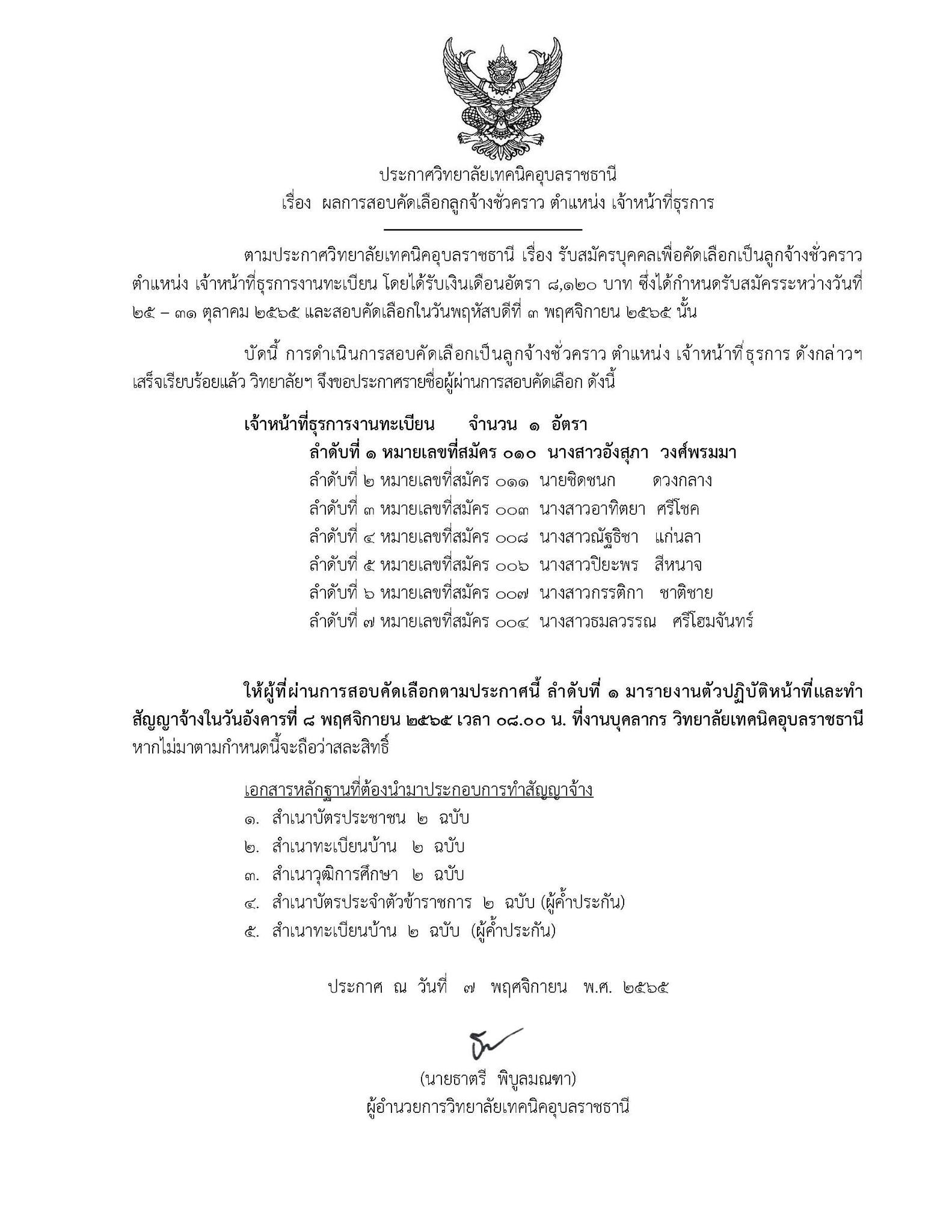 ผู้ที่ผ่านการสอบคัดเลือก ลำดับที่ 1 มารายงานตัวปฏิบัติหน้าที่และทำสัญญาจ้าง