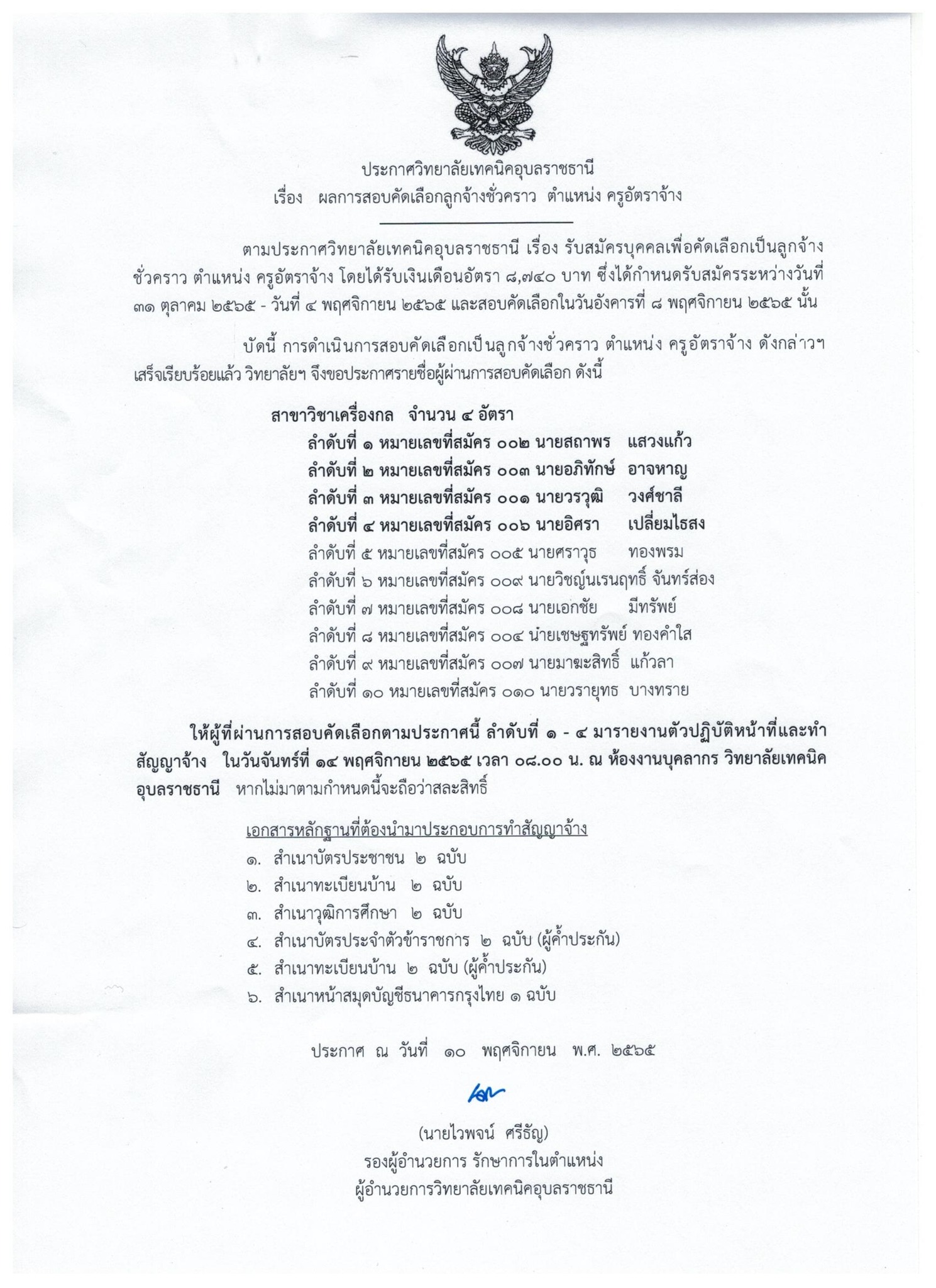ผู้ที่ผ่านการสอบคัดเลือก ลำดับที่ 1 – 4 มารายงานตัวปฏิบัติหน้าที่และทำสัญญาจ้าง