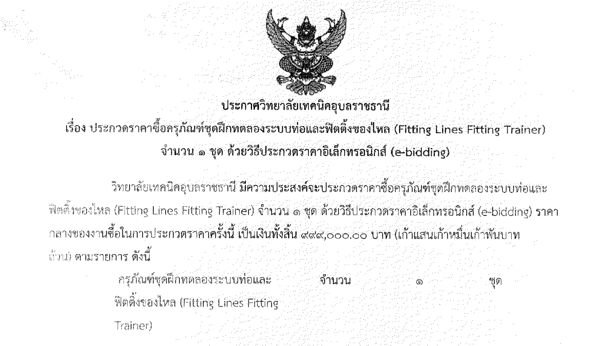 ประกวดราคาซิ้อครุภัณฑ์ชุดฝึกทดลองระบบท่อและฟิตติ้งของไหล (Fitting Lines Fitting Trainer) จำนวน 1 ชุด ด้วยวิธีประกวดราคาอิเล็กทรกนิกส์ (e-bidding)