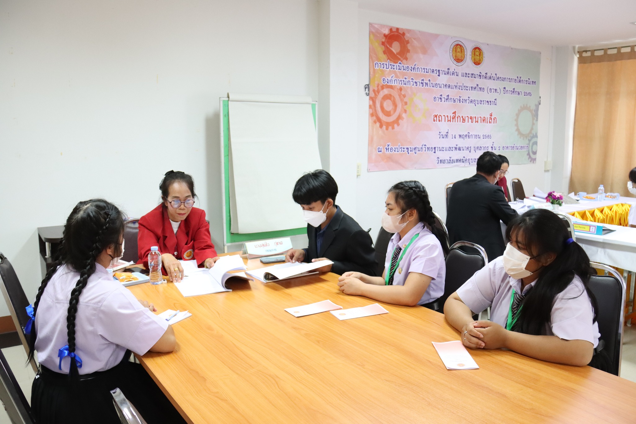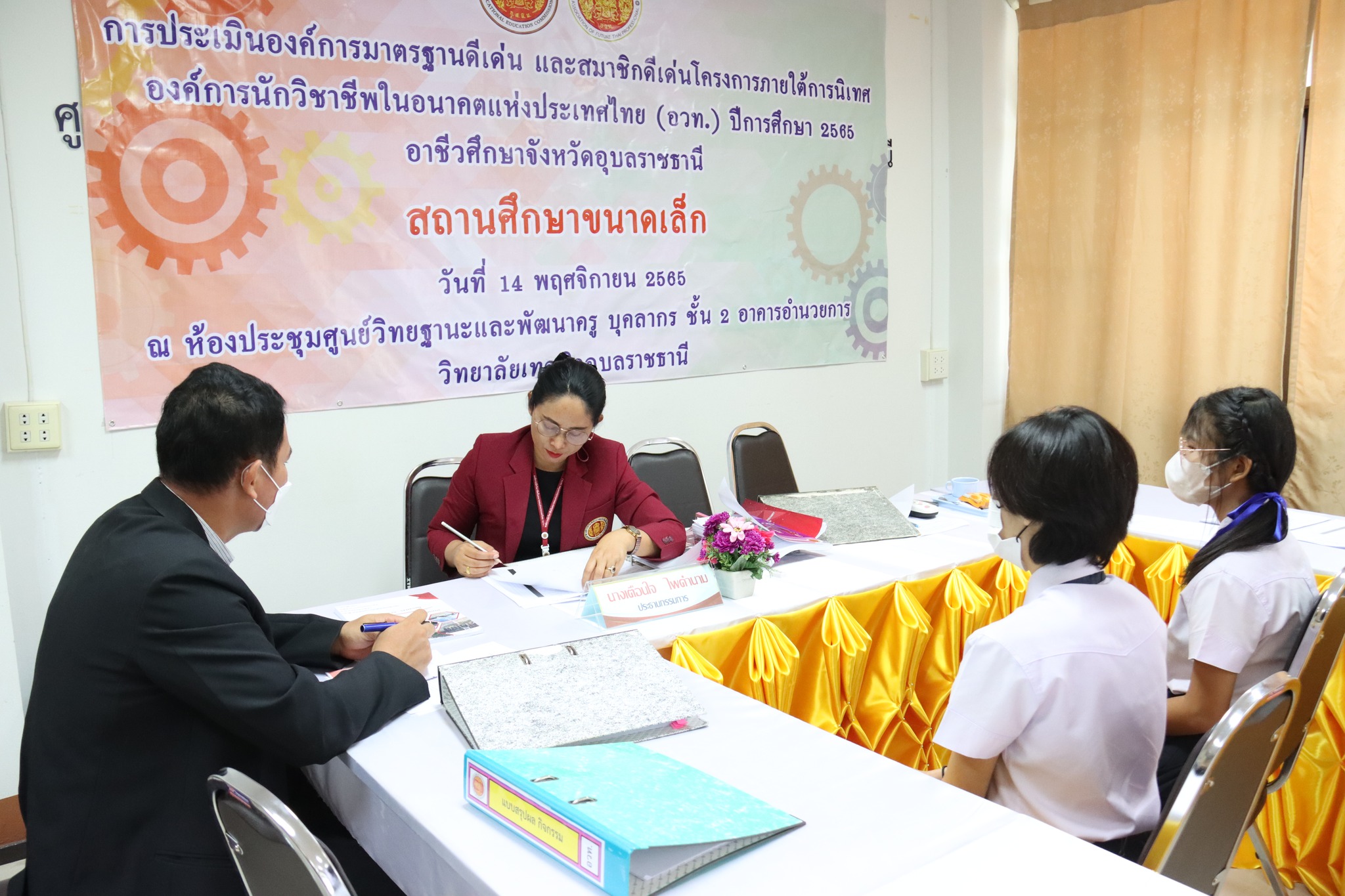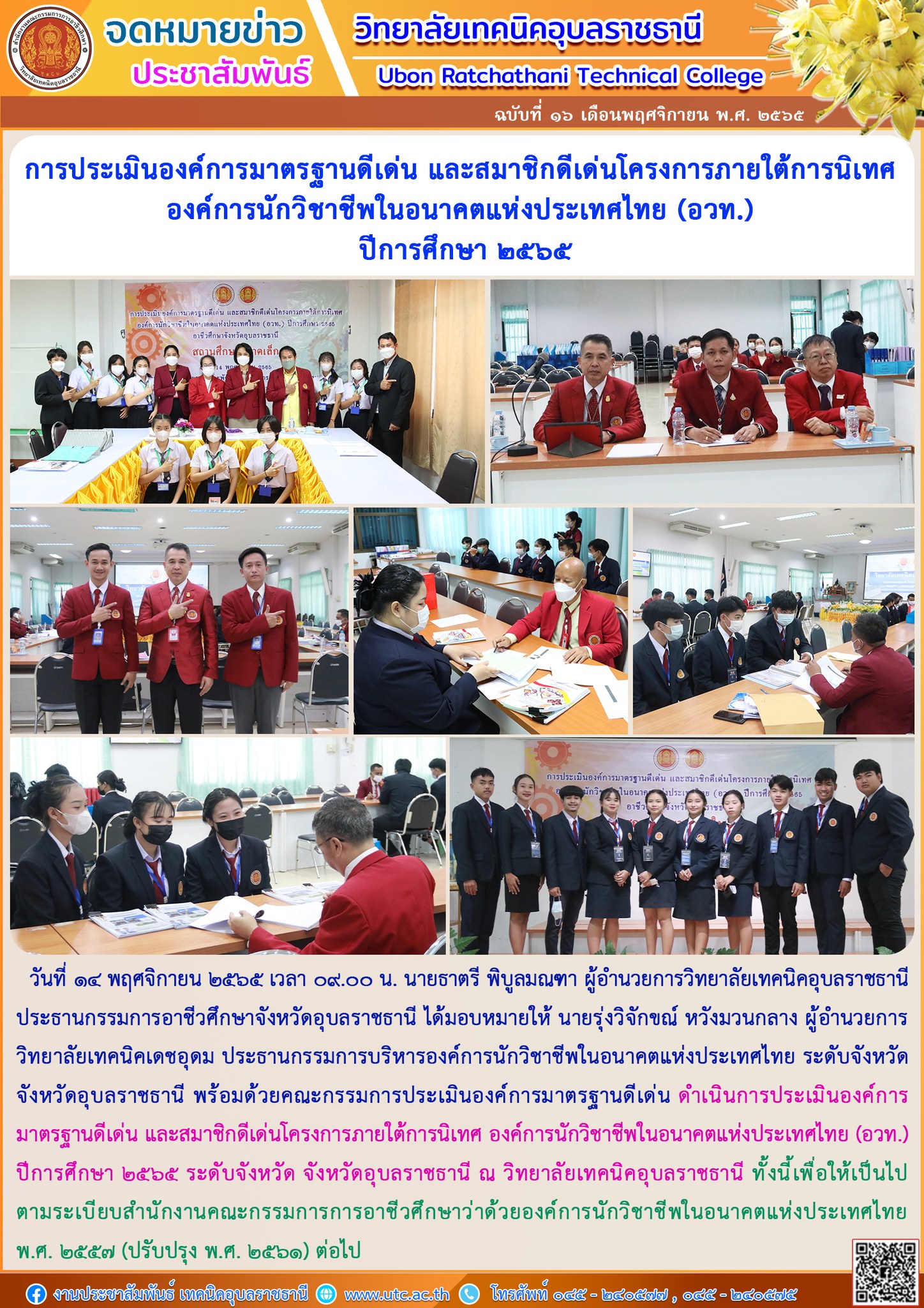วันที่ ๑๔ พฤศจิกายน๒๕๖๕ เวลา ๐๙.๐๐ น. นายธาตรี พิบูลมณฑา ผู้อำนวยการวิทยาลัยเทคนิคอุบลราชธานี ประธานกรรมการอาชีวศึกษาจังหวัดอุบลราชธานี ได้มอบหมายให้ นายรุ่งวิจักขณ์ หวังมวนกลาง ผู้อำนวยการวิทยาลัยเทคนิคเดชอุดม ประธานกรรมการบริหารองค์การนักวิชาชีพในอนาคตแห่งประเทศไทย ระดับจังหวัด จังหวัดอุบลราชธานี พร้อมด้วยคณะกรรมการประเมินองค์การมาตรฐานดีเด่น ดำเนินการประเมินองค์การมาตรฐานดีเด่น และสมาชิกดีเด่นโครงการภายใต้การนิเทศ องค์การนักวิชาชีพในอนาคตแห่งประเทศไทย (อวท.) ปีการศึกษา ๒๕๖๕ ระดับจังหวัด จังหวัดอุบลราชธานี ณ วิทยาลัยเทคนิคอุบลราชธานี ทั้งนี้เพื่อให้เป็นไปตามระเบียบสำนักงานคณะกรรมการการอาชีวศึกษาว่าด้วยองค์การนักวิชาชีพในอนาคตแห่งประเทศไทย พ.ศ. ๒๕๕๗ (ปรับปรุง พ.ศ. ๒๕๖๑) ต่อไป