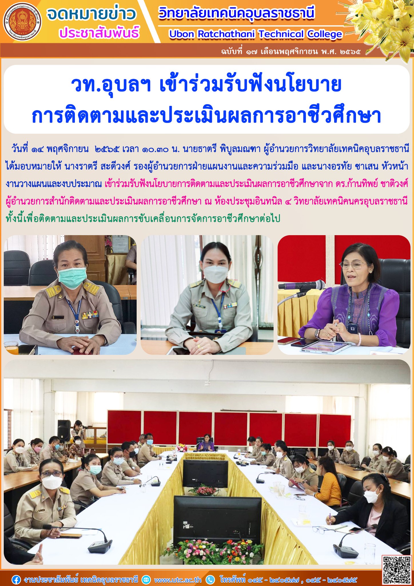 วันที่ ๑๔ พฤศจิกายน ๒๕๖๕ เวลา ๑๐.๓๐ น. นายธาตรี พิบูลมณฑา ผู้อำนวยการวิทยาลัยเทคนิคอุบลราชธานี ได้มอบหมายให้ นางราตรีสะดีวงศ์ รองผู้อำนวยการฝ่ายแผนงานและความร่วมมือ และนางอรทัย ซาเสน หัวหน้างานวางแผนและงบประมาณ เข้าร่วมรับฟังนโยบายการติดตามและประเมินผลการอาชีวศึกษาจาก ดร.ก้านทิพย์ ชาติวงศ์ ผู้อำนวยการสำนักติดตามและประเมินผลการอาชีวศึกษา ณ ห้องประชุมอินทนิล ๔ วิทยาลัยเทคนิคนครอุบลราชธานี ทั้งนี้เพื่อติดตามและประเมินผลการขับเคลื่อนการจัดการอาชีวศึกษาต่อไป