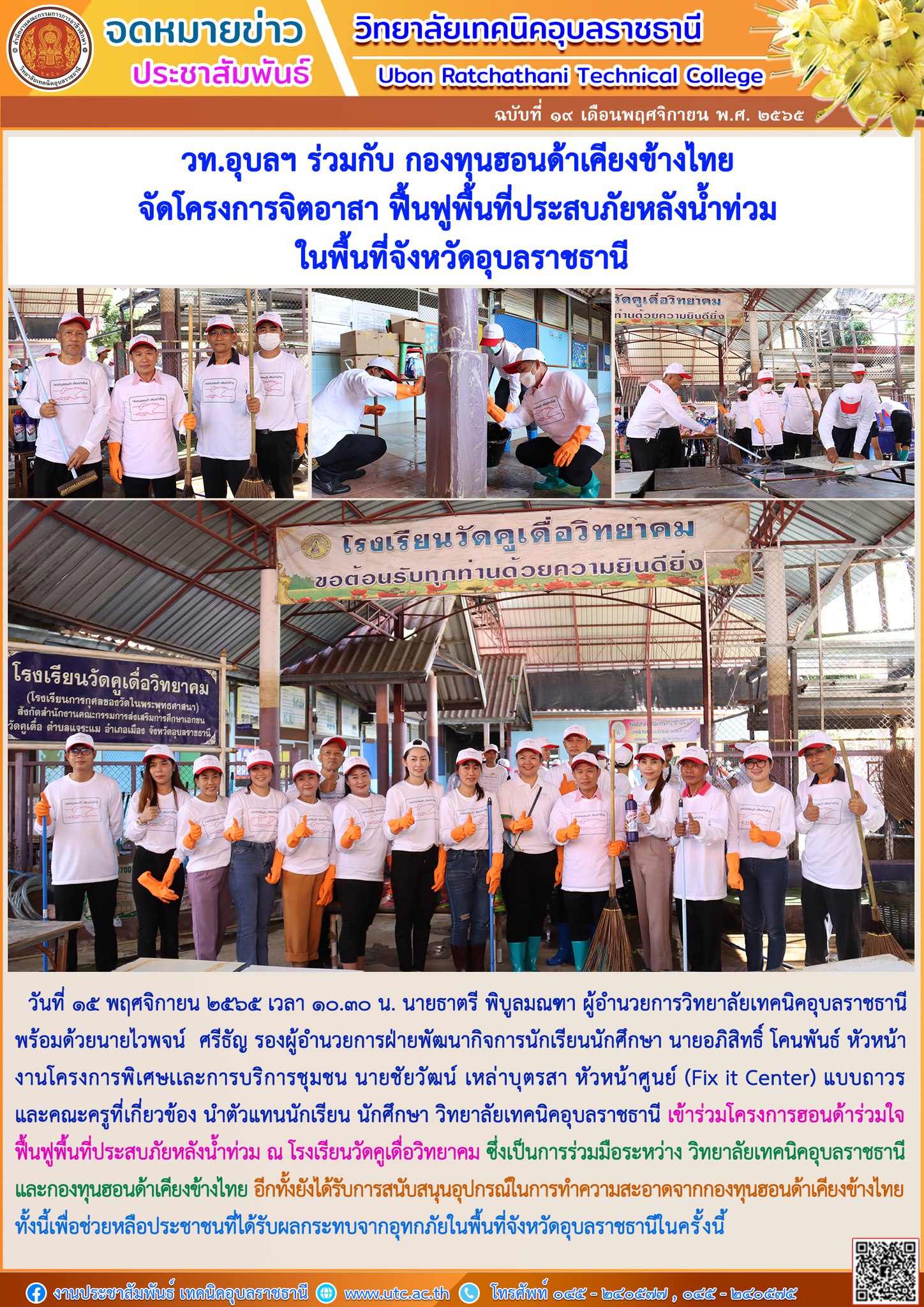 วันที่ ๑๕ พฤศจิกายน๒๕๖๕ เวลา ๑๐.๓๐ น. นายธาตรี พิบูลมณฑา ผู้อำนวยการวิทยาลัยเทคนิคอุบลราชธานี พร้อมด้วยนายไวพจน์ ศรีธัญ รองผู้อำนวยการฝ่ายพัฒนากิจการนักเรียนนักศึกษา นายอภิสิทธิ์ โคนพันธ์ หัวหน้างานโครงการพิเศษเเละการบริการชุมชน นายชัยวัฒน์ เหล่าบุตรสา หัวหน้าศูนย์ (Fix it Center) แบบถาวร และคณะครูที่เกี่ยวข้อง นำตัวแทนนักเรียน นักศึกษา วิทยาลัยเทคนิคอุบลราชธานี เข้าร่วมโครงการฮอนด้าร่วมใจ ฟื้นฟูพื้นที่ประสบภัยหลังน้ำท่วม ณ โรงเรียนวัดคูเดื่อวิทยาคม ซึ่งเป็นการร่วมมือระหว่าง วิทยาลัยเทคนิคอุบลราชธานี และกองทุนฮอนด้าเคียงข้างไทย อีกทั้งยังได้รับการสนับสนุนอุปกรณ์ในการทำความสะอาดจากกองทุนฮอนด้าเคียงข้างไทย ทั้งนี้เพื่อช่วยหลือประชาชนที่ได้รับผลกระทบจากอุทกภัยในพื้นที่จังหวัดอุบลราชธานีในครั้งนี้