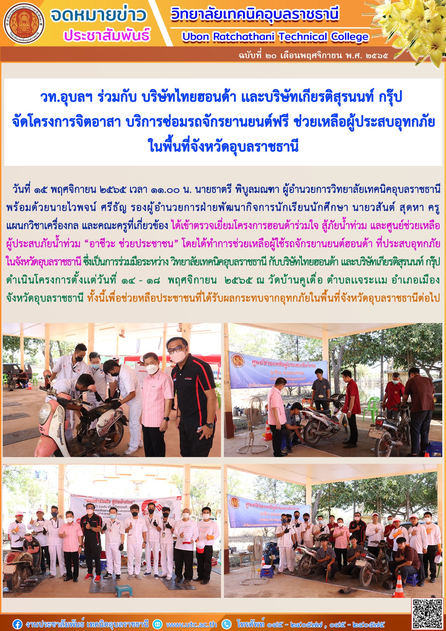 วันที่ ๑๕ พฤศจิกายน๒๕๖๕ เวลา ๑๑.๐๐ น. นายธาตรี พิบูลมณฑา ผู้อำนวยการวิทยาลัยเทคนิคอุบลราชธานี พร้อมด้วยนายไวพจน์ ศรีธัญ รองผู้อำนวยการฝ่ายพัฒนากิจการนักเรียนนักศึกษา นายวสันต์ สุดหา ครูแผนกวิชาเครื่องกล และคณะครูที่เกี่ยวข้อง ได้เข้าตรวจเยี่ยมโครงการฮอนด้าร่วมใจ สู้ภัยน้ำท่วม และศูนย์ช่วยเหลือ ผู้ประสบภัยน้ำท่วม “อาชีวะ ช่วยประชาชน” โดยได้ทำการช่วยเหลือผู้ใช้รถจักรยานยนต์ฮอนด้า ที่ประสบอุทกภัยในจังหวัดอุบลราชธานี ซึ่งเป็นการร่วมมือระหว่าง วิทยาลัยเทคนิคอุบลราชธานี กับบริษัทไทยฮอนด้า เเละบริษัทเกียรติสรนนท์ กรุ๊ป ดำเนินโครงการตั้งเเต่วันที่ ๑๔ – ๑๘ พฤศจิกายน ๒๕๖๕ ณ วัดบ้านคูเดื่อ ตำบลเเจระเเม อำเภอเมือง จังหวัดอุบลราชธานี ทั้งนี้เพื่อช่วยหลือประชาชนที่ได้รับผลกระทบจากอุทกภัยในพื้นที่จังหวัดอุบลราชธานีต่อไป