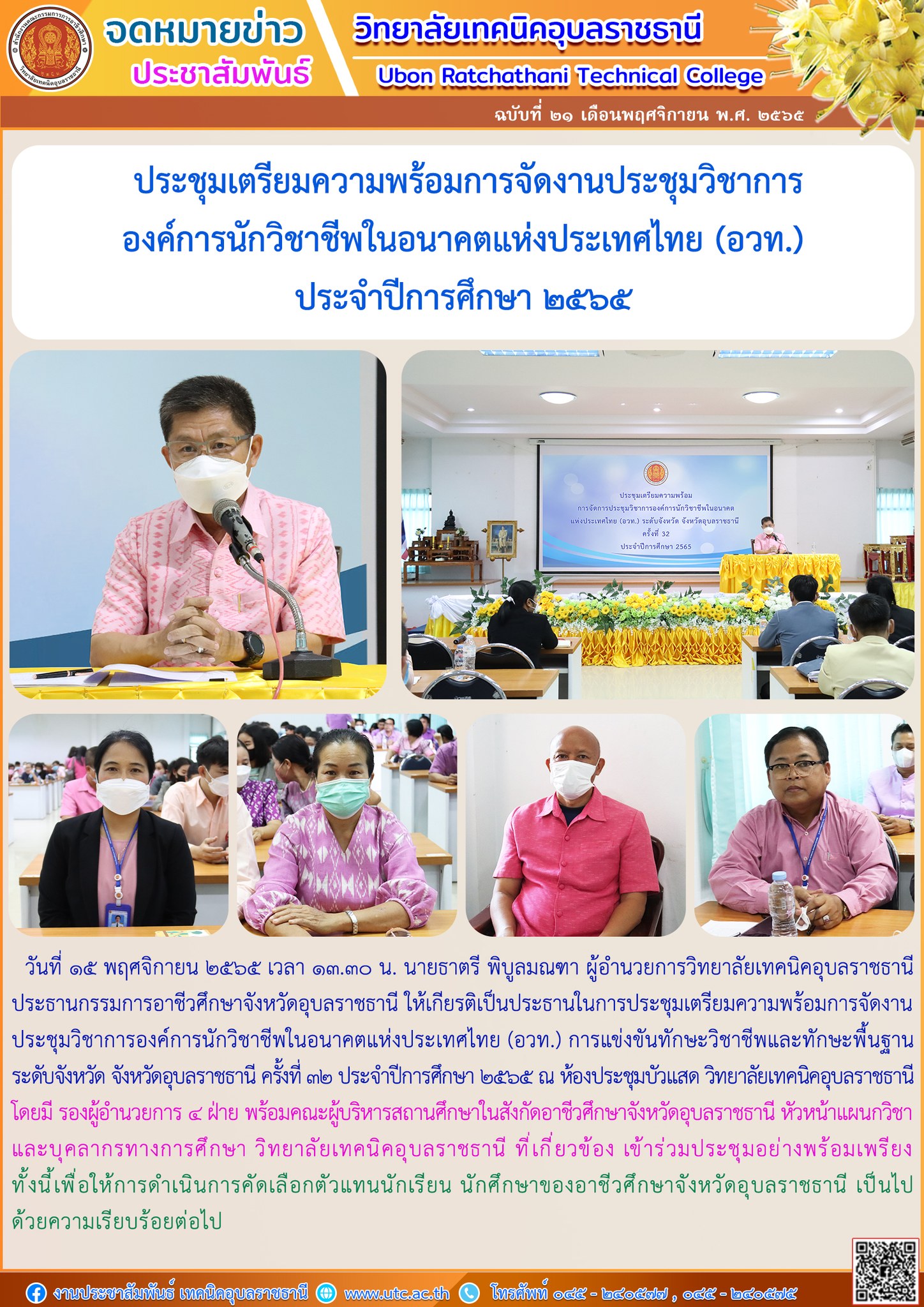 วันที่ ๑๕ พฤศจิกายน ๒๕๖๕ เวลา ๑๓.๓๐ น. นายธาตรีพิบูลมณฑา ผู้อำนวยการวิทยาลัยเทคนิคอุบลราชธานี ประธานกรรมการอาชีวศึกษาจังหวัดอุบลราชธานี ให้เกียรติเป็นประธานในการประชุมเตรียมความพร้อมการจัดงานประชุมวิชาการองค์การนักวิชาชีพในอนาคตแห่งประเทศไทย (อวท.) การแข่งขันทักษะวิชาชีพและทักษะพื้นฐาน ระดับจังหวัด จังหวัดอุบลราชธานี ครั้งที่ ๓๒ ประจำปีการศึกษา ๒๕๖๕ ณ ห้องประชุมบัวแสด วิทยาลัยเทคนิคอุบลราชธานี โดยมี รองผู้อำนวยการ ๔ ฝ่าย พร้อมคณะผู้บริหารสถานศึกษาในสังกัดอาชีวศึกษาจังหวัดอุบลราชธานี หัวหน้าแผนกวิชา และบุคลากรทางการศึกษา วิทยาลัยเทคนิคอุบลราชธานี ที่เกี่ยวข้อง เข้าร่วมประชุมอย่างพร้อมเพรียง ทั้งนี้เพื่อให้การดำเนินการคัดเลือกตัวแทนนักเรียน นักศึกษาของอาชีวศึกษาจังหวัดอุบลราชธานี เป็นไปด้วยความเรียบร้อยต่อไป