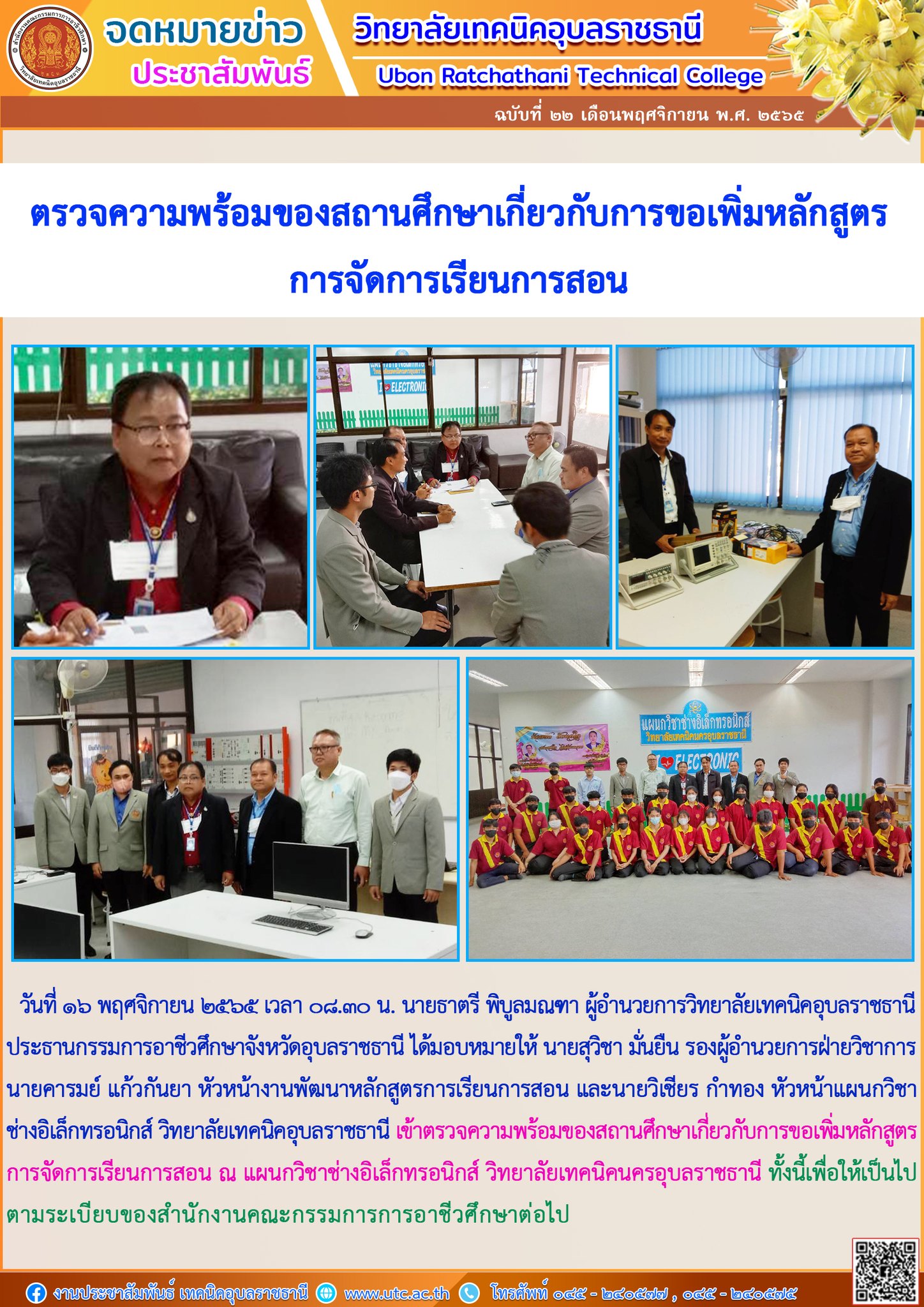 วันที่ ๑๖ พฤศจิกายน ๒๕๖๕ เวลา ๐๘.๓๐ น. นายธาตรี พิบูลมณฑา ผู้อำนวยการวิทยาลัยเทคนิคอุบลราชธานี ประธานกรรมการอาชีวศึกษาจังหวัดอุบลราชธานี ได้มอบหมายให้ นายสุวิชา มั่นยืน รองผู้อำนวยการฝ่ายวิชาการ นายคารมย์ แก้วกันยา หัวหน้างานพัฒนาหลักสูตรการเรียนการสอน และนายวิเชียร กำทอง หัวหน้าแผนกวิชาช่างอิเล็กทรอนิกส์ วิทยาลัยเทคนิคอุบลราชธานี เข้าตรวจความพร้อมของสถานศึกษาเกี่ยวกับการขอเพิ่มหลักสูตรการจัดการเรียนการสอน ณ แผนกวิชาช่างอิเล็กทรอนิกส์ วิทยาลัยเทคนิคนครอุบลราชธานี ทั้งนี้เพื่อให้เป็นไปตามระเบียบของสำนักงานคณะกรรมการการอาชีวศึกษาต่อไป