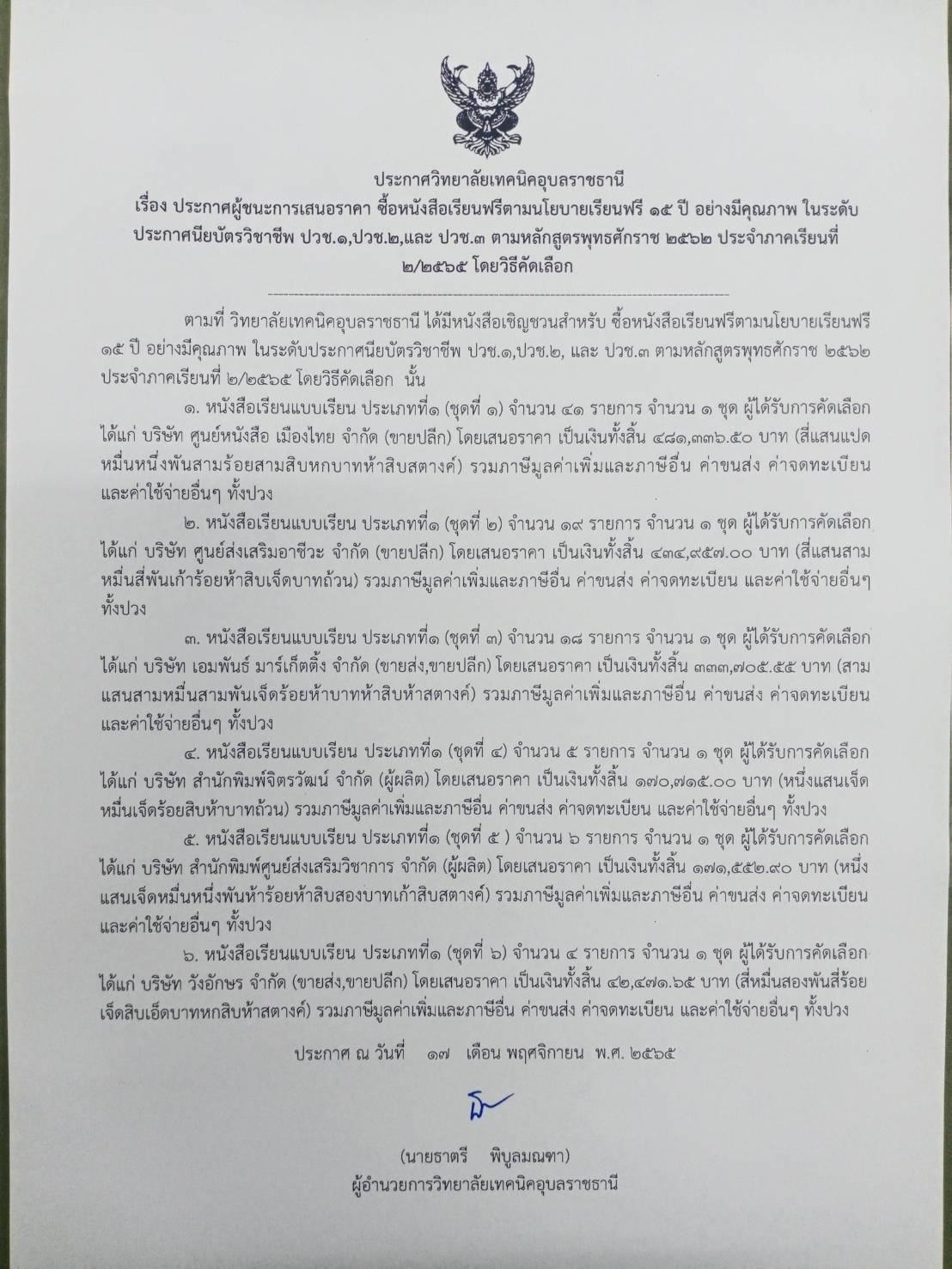 ประกาศผู้ชนะการเสอนราคา ซื้อหนังสือเรียนฟรีตามนโยบายเรียนฟรี 15 ปี อย่างมีคุณภาพ ในระดับประกาศนียบัตรวิชาชีพ ปวช.1มปวช.2มและ ปวช.3 ตามหลักสูตรพุทธศักราช 2562 ประจำภาคเรียนที่ 2/2565 โดยวิธีคิดเลือก