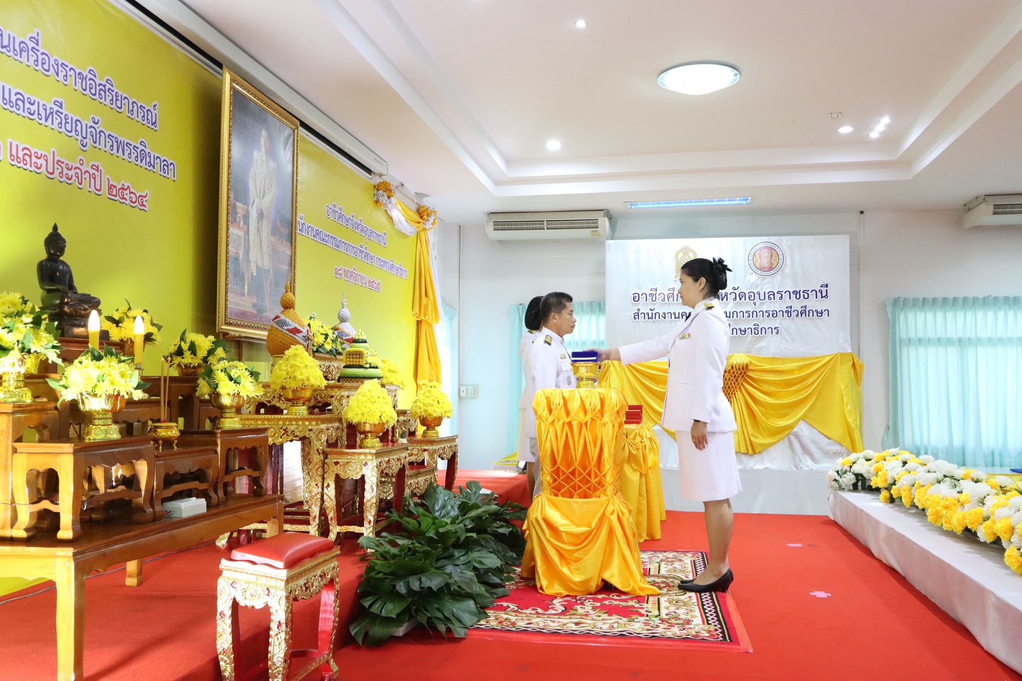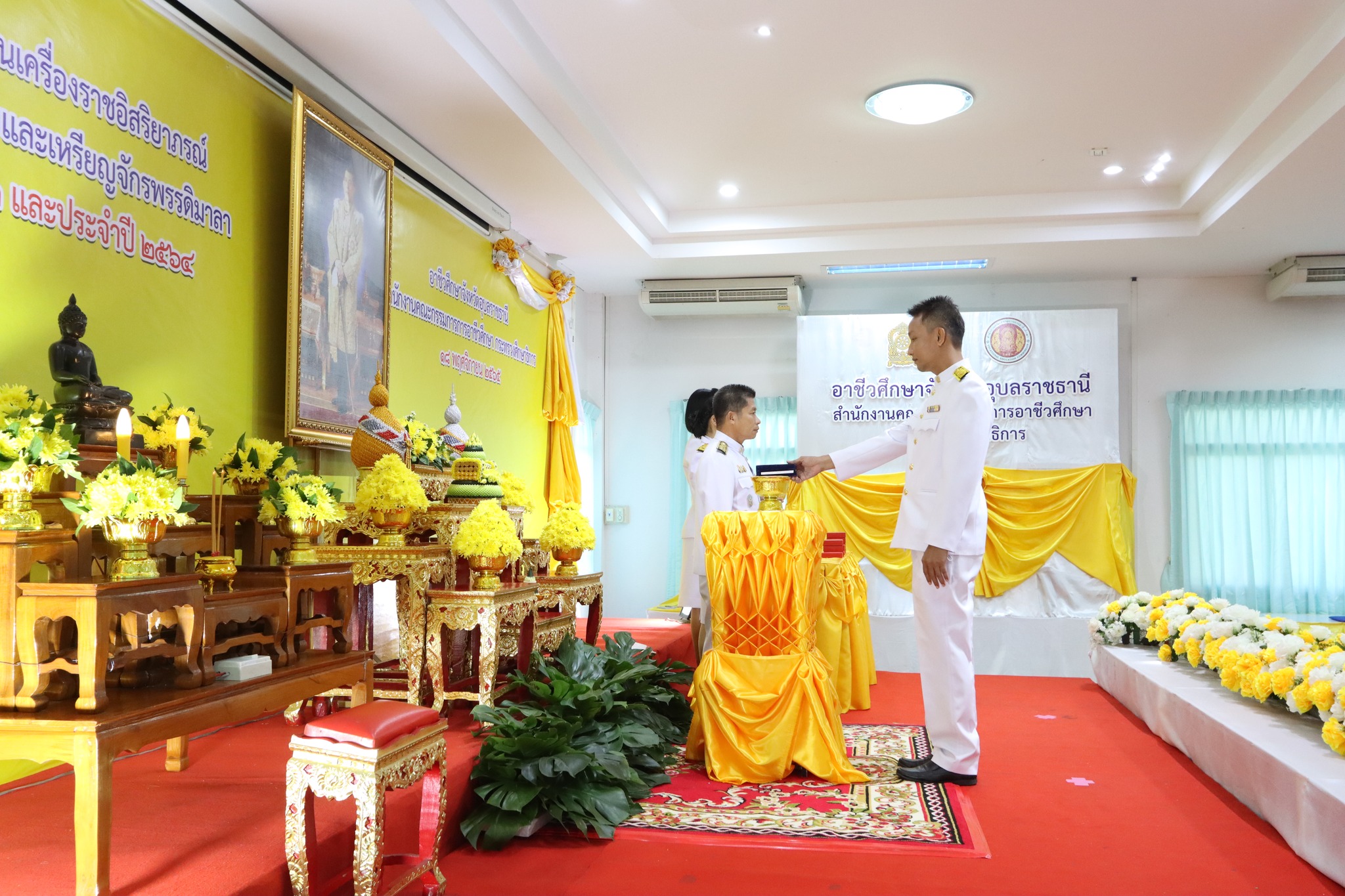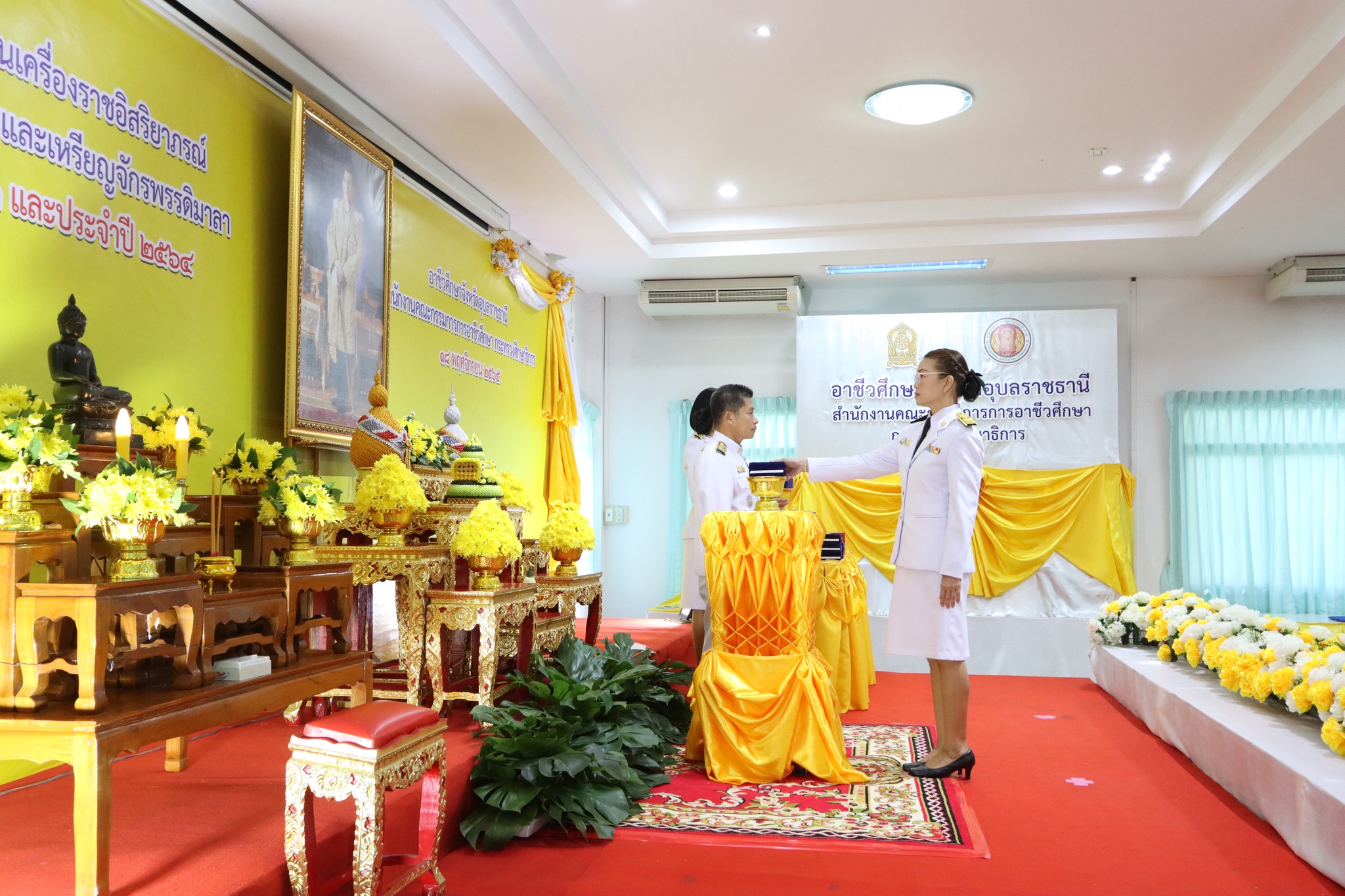 วันที่ ๑๘ พฤศจิกายน ๒๕๖๕ เวลา ๑๐.๐๐ น. นายธาตรีพิบูลมณฑา ผู้อำนวยการวิทยาลัยเทคนิคอุบลราชธานี ประธานกรรมการอาชีวศึกษาจังหวัดอุบลราชธานี ให้เกียรติเป็นประธานในพิธีรับพระราชทานเครื่องราชอิสริยาภรณ์ชั้นต่ำกว่าสายสะพายและเหรียญจักรพรรดิมาลา ประจำปี ๒๕๖๓ และประจำปี ๒๕๖๔ เบื้องหน้าพระบรมฉายาลักษณ์พระบาทสมเด็จพระปรเมนทรรามาธิบดีศรีสินทรมหาวชิราลงกรณ พระวชิรเกล้าเจ้าอยู่หัว รัชกาลที่ ๑๐ ณ ห้องประชุมบัวแสด วิทยาลัยเทคนิคอุบลราชธานี โดยมี นางราตรี สะดีวงศ์ รองผู้อำนวยการฝ่ายแผนงานและความร่วมมือ/เลขานุการอาชีวศึกษาจังหวัดอุบลราชธานี กล่าวรายงานในพิธี ในการนี้มีข้าราชการครู ลูกจ้างประจำ และพนักงานราชการ สังกัดอาชีวศึกษาจังหวัดอุบลราชธานี ได้รับพระราชทานเครื่องราชอิสริยาภรณ์ชั้นต่ำกว่าสายสะพายและเหรียญจักรพรรดิมาลาจำนวน ๑๒๔ ราย ดังนี้ ชั้นที่ ๒ ทวีติยาภรณ์ช้างเผือก จำนวน ๒๐ ราย ชั้นที่ ๒ ทวีติยาภรณ์มงกุฎไทย จำนวน ๒๐ ราย ชั้นที่ ๓ ตริตาภรณ์มงกุฏไทย จำนวน ๑๕ ราย ชั้นที่ ๔ จัตุรถาภรณ์ช้างเผือก จำนวน ๒ ราย ชั้นที่ ๔ จัตุรถาภรณ์มงกุฏไทย จำนวน ๕ ราย ชั้นที่ ๕ เบ็ญจมาภรณ์ช้างเผือก จำนวน ๓ ราย และเหรียญจักรพรรดิมาลา จำนวน ๕๙ ราย ทั้งนี้เพื่อเป็นการยกย่อง เชิดชูเกียรติ ให้แก่ข้าราชการที่มีความประพฤติดีงาม มีความอุตสาหะ ซื่อสัตย์ และเอาใจใส่ต่อหน้าที่ราชการอย่างดียิ่ง