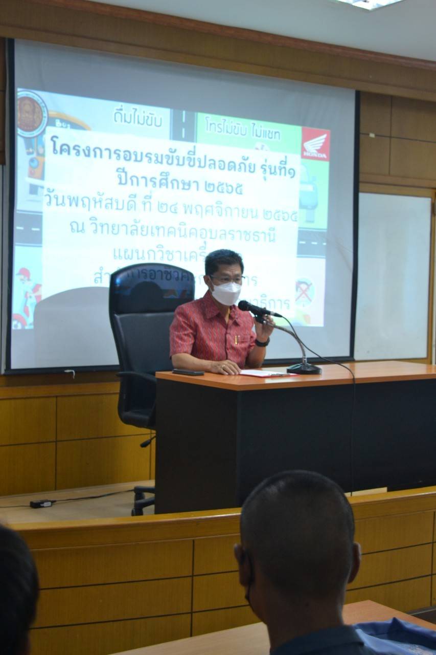 วันที่ ๒๔ พฤศจิกายน ๒๕๖๕ เวลา ๐๙.๓๐ น. นายธาตรี พิบูลมณฑา ผู้อำนวยการวิทยาลัยเทคนิคอุบลราชธานี ให้เกียรติเป็นประธานในพิธีเปิดโครงการอบรมการขับขี่ปลอดภัย ประจำปีการศึกษา ๒๕๖๕ ณ แผนกวิชาเครื่องกล วิทยาลัยเทคนิคอุบลราชธานี โดยมี นายสุวิชา มั่นยืน รองผู้อำนวยการฝ่ายวิชาการ นายกตนนท์ นาทัน หัวหน้าแผนกวิชาเครื่องกล พร้อมด้วยคณะครู แผนกวิชาเครื่องกล นำนักเรียน นักศึกษา เข้าร่วมการอบรมอย่างพร้อมเพรียง ทั้งนี้เพื่อส่งเสริมกิจกรรมด้านการขับขี่ปลอดภัยในสถานศึกษาต่อไป