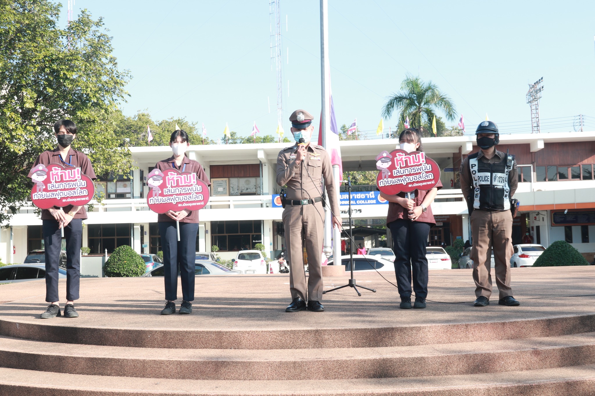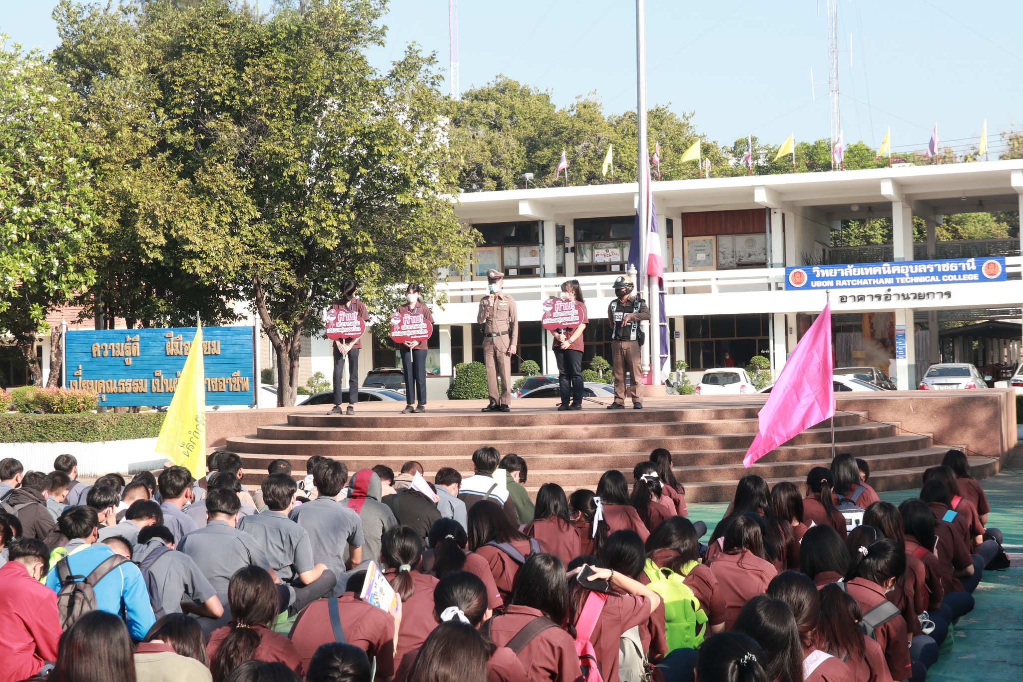 วันที่ ๓๐ พฤศจิกายน ๒๕๖๕ เวลา ๐๗.๓๐ น. นายธาตรี พิบูลมณฑา ผู้อำนวยการวิทยาลัยเทคนิคอุบลราชธานี พร้อมด้วย นางสาวสายฝนสาระผล รองผู้อำนวยการฝ่ายบริหารทรัพยากร นางราตรี สะดีวงศ์ รองผู้อำนวยการฝ่ายแผนงานและความร่วมมือ นำคณะครู บุคลากรทางการศึกษาที่เกี่ยวข้อง และนักเรียน นักศึกษา เข้าร่วมกิจกรรมหน้าเสาธงอย่างพร้อมเพรียง ในการนี้ได้รับเกียรติจาก พันตำรวจโทสุริยันต์ คำสอน สารวัตรงานปราบปราม จากสถานีตำรวจภูธรเมืองอุบลราชธานี มาให้ความรู้นักเรียน นักศึกษา วิทยาลัยเทคนิคอุบลราชธานี เรื่องข้อเสียของการพนันในช่วงบอลโลก กฎหมายเกี่ยวกับบุหรี่ไฟฟ้า กฎหมายเกี่ยวกับการแต่งรถจักรยานยนต์ และข้อควรระวังของการเดินทางคนเดียวในเวลากลางคืนอีกด้วย