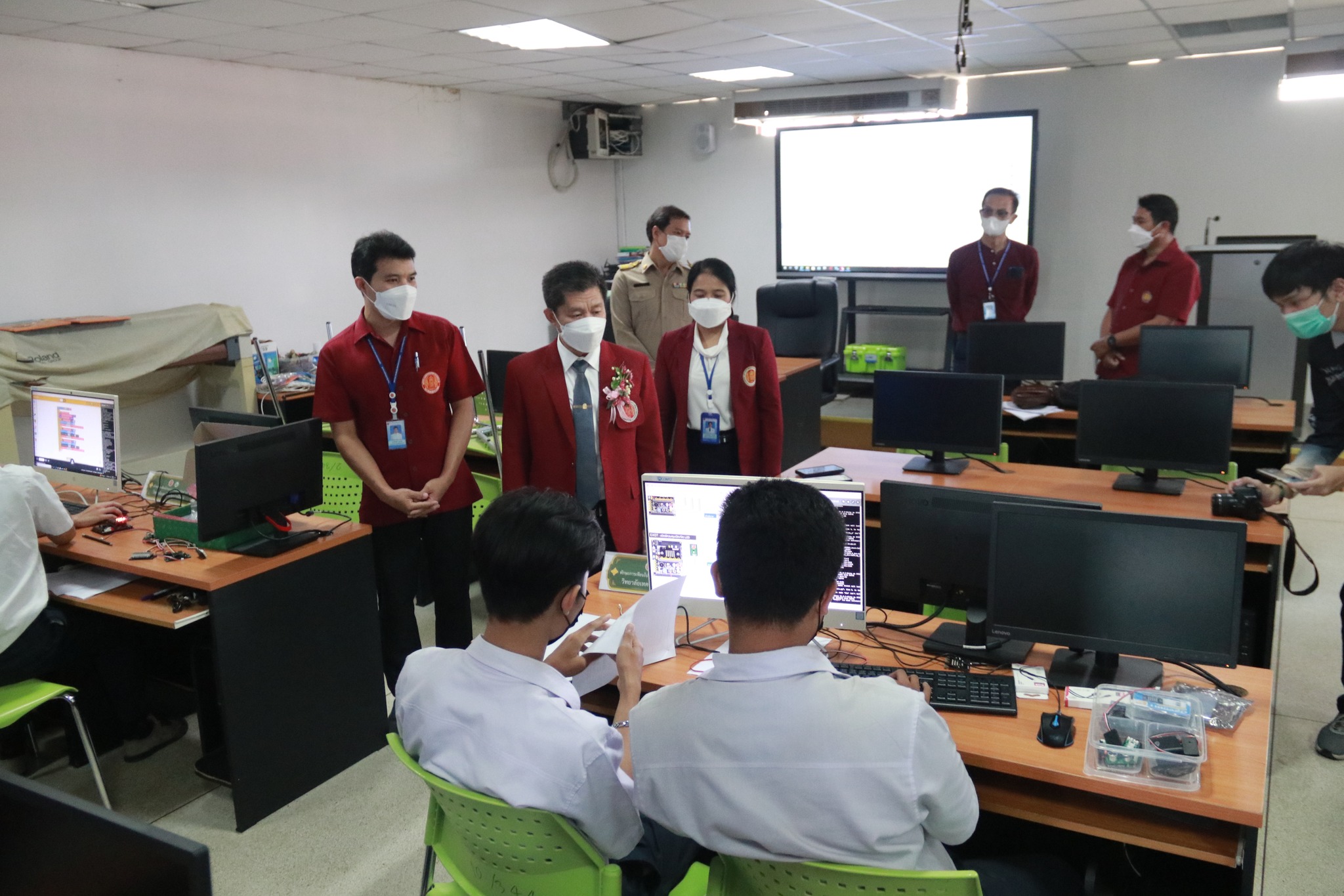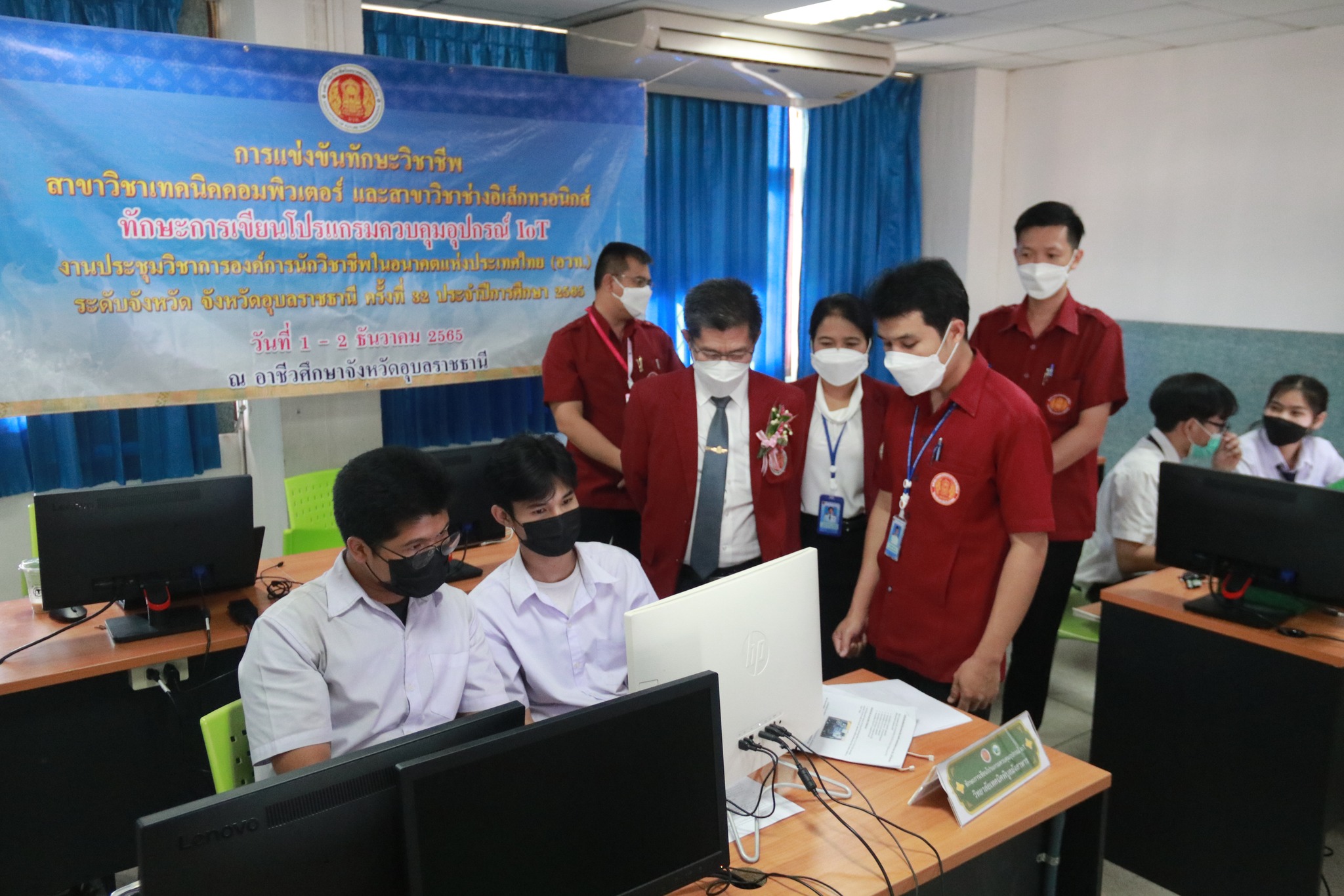 วันที่ ๑ ธันวาคม ๒๕๖๕ เวลา ๑๔.๐๐ น. นายธาตรี พิบูลมณฑา ผู้อำนวยการวิทยาลัยเทคนิคอุบลราชธานี ประธานกรรมการอาชีวศึกษาจังหวัดอุบลราชธานี พร้อมด้วย นางสุวนิจ สุริยพันตรี ผู้อำนวยการวิทยาลัยการอาชีพวารินชำราบ นางสาวสายฝน สาระผล รองผู้อำนวยการฝ่ายบริหารทรัพยากร เข้าเยี่ยมชมการแข่งขันทักษะวิชาชีพ และทักษะพื้นฐาน ระดับจังหวัด จังหวัดอุบลราชธานี เพื่อให้กำลังใจนักเรียน นักศึกษา ตลอดจนคณะกรรมการดำเนินงานจัดการแข่งขัน ครูผู้ควบคุม ได้แก่ การประกวดการพูดสาธิตเป็นภาษาอังกฤษ ณ ห้องประชุมบัวฟ้า , การประกวดเล่านิทานพื้นบ้าน ณ อาคาร ๕ ต่อมา เวลา ๑๔.๒๐ น. ได้เยี่ยมชมการแข่งขันทักษะการพัฒนาสื่อประชาสัมพันธ์ โมชั่นกราฟิก , ทักษะงานบริการอาหารและเครื่องดื่ม , การประกวดทักษะกลยุทธ์การตลาดเชิงสร้างสรรค์ “Creative Marketing Strategy” การแข่งขันทักษะการใช้คอมพิวเตอร์ในงานบัญชี (ปวช.) , การแข่งขันทักษะโปรแกรมสำเร็จรูปเพื่องานบัญชี (ปวส.) ณ วิทยาลัยอาชีวศึกษาอุบลราชธานี โดยมี นางลฎาภา แสวงทรัพย์ ผู้อำนวยการวิทยาลัยอาชีวศึกษาอุบลราชธานี และคณะครู วิทยาลัยอาชีวศึกษาอุบลราชธานี มาร่วมให้การต้อนรับ จากนั้น เวลา ๑๕.๐๐ น. ได้เดินทางไปที่แผนกวิชาเทคโนโลยีคอมพิวเตอร์ เพื่อชมการแข่งขันทักษะการเขียนโปรแกรมเพื่อควบคุมอุปกรณ์ IoT และชมการประกวดร้องเพลงลูกทุ่ง หญิง ณ หอประชุมโดมน้อย วิทยาลัยเทคนิคอุบลราชธานี โดยการแข่งขันทักษะทุกรายการนั้น มีวัตถุประสงค์เพื่อคัดเลือกตัวแทนนักเรียน นักศึกษา ระดับอาชีวศึกษาจังหวัดอุบลราชธานีไปเข้าร่วมการแข่งขันทักษะวิชาชีพ และทักษะพื้นฐาน ระดับภาค ที่อาชีวศึกษาจังหวัดหนองคายต่อไป