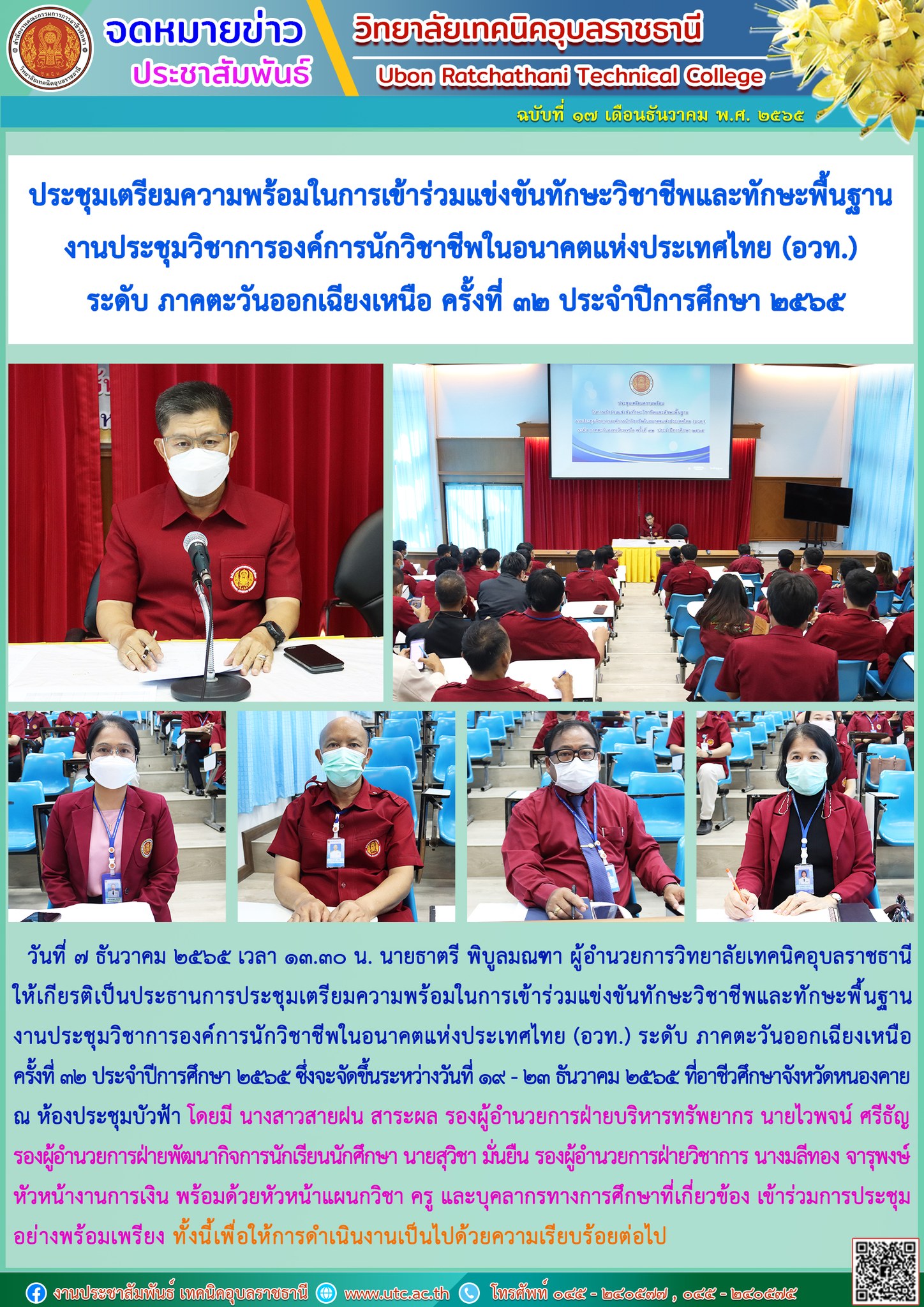 วันที่ ๗ ธันวาคม ๒๕๖๕ เวลา ๑๓.๓๐ น. นายธาตรี พิบูลมณฑาผู้อำนวยการวิทยาลัยเทคนิคอุบลราชธานี ให้เกียรติเป็นประธานการประชุมเตรียมความพร้อมในการเข้าร่วมแข่งขันทักษะวิชาชีพและทักษะพื้นฐาน งานประชุมวิชาการองค์การนักวิชาชีพในอนาคตแห่งประเทศไทย (อวท.) ระดับ ภาคตะวันออกเฉียงเหนือ ครั้งที่ ๓๒ ประจำปีการศึกษา ๒๕๖๕ ซึ่งจะจัดขึ้นระหว่างวันที่ ๑๙ – ๒๓ ธันวาคม ๒๕๖๕ ที่อาชีวศึกษาจังหวัดหนองคาย ณ ห้องประชุมบัวฟ้า โดยมี นางสาวสายฝน สาระผล รองผู้อำนวยการฝ่ายบริหารทรัพยากร นายไวพจน์ ศรีธัญ รองผู้อำนวยการฝ่ายพัฒนากิจการนักเรียนนักศึกษา นายสุวิชา มั่นยืน รองผู้อำนวยการฝ่ายวิชาการ นางมลีทอง จารุพงษ์ หัวหน้างานการเงิน พร้อมด้วยหัวหน้าแผนกวิชา ครู และบุคลากรทางการศึกษาที่เกี่ยวข้อง เข้าร่วมการประชุมอย่างพร้อมเพรียง ทั้งนี้เพื่อให้การดำเนินงานเป็นไปด้วยความเรียบร้อยต่อไป
