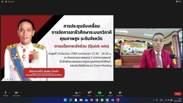 ประชุมขับเคลื่อนการจัดการอาชีวศึกษาระบบทวิภาคีคุณภาพสูง ระดับจังหวัด ตามนโยบายเร่งด่วน (Quick win) รูปแบบออนไลน์ผ่านระบบ Zoom Meeting