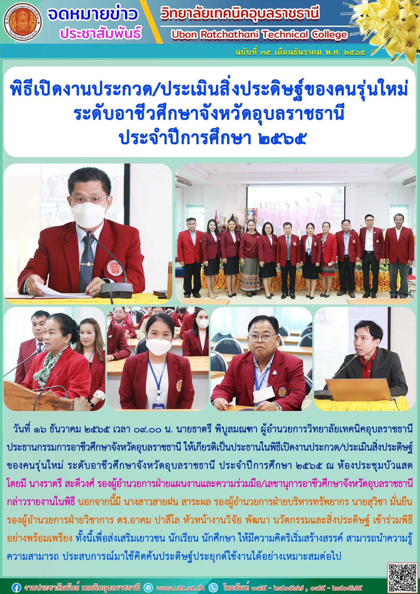 วันที่ ๑๖ ธันวาคม ๒๕๖๕ เวลา ๐๙.๐๐ น. นายธาตรี พิบูลมณฑา ผู้อำนวยการวิทยาลัยเทคนิคอุบลราชธานีประธานกรรมการอาชีวศึกษาจังหวัดอุบลราชธานี ให้เกียรติเป็นประธานในพิธีเปิดงานประกวด/ประเมินสิ่งประดิษฐ์ของคนรุ่นใหม่ ระดับอาชีวศึกษาจังหวัดอุบลราชธานี ประจำปีการศึกษา ๒๕๖๕ โดยมี นางราตรี สะดีวงศ์ รองผู้อำนวยการฝ่ายแผนงานและความร่วมมือ/เลขานุการอาชีวศึกษาจังหวัดอุบลราชธานี กล่าวรายงานในพิธี นอกจากนี้มี นางสาวสายฝน สาระผล รองผู้อำนวยการฝ่ายบริหารทรัพยากร นายสุวิชา มั่นยืน รองผู้อำนวยการฝ่ายวิชาการ ดร.อาคม ปาสีโล หัวหน้างานวิจัย พัฒนา นวัตกรรมและสิ่งประดิษฐ์ เข้าร่วมพิธีอย่างพร้อมเพรียง ทั้งนี้เพื่อส่งเสริมเยาวชน นักเรียน นักศึกษา ให้มีความคิดริเริ่มสร้างสรรค์ สามารถนำความรู้ ความสามารถ ประสบการณ์มาใช้คิดค้นประดิษฐ์ประยุกต์ใช้งานได้อย่างเหมาะสมต่อไป