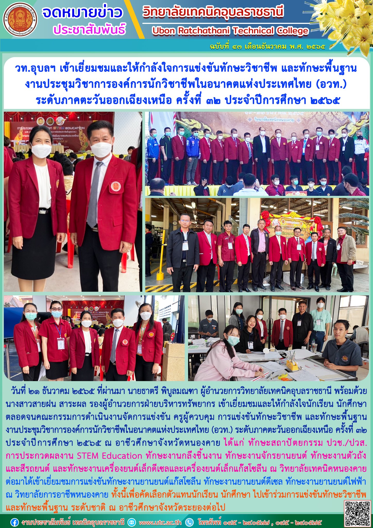 วันที่ ๒๑ ธันวาคม ๒๕๖๕ ที่ผ่านมา นายธาตรี พิบูลมณฑา ผู้อำนวยการวิทยาลัยเทคนิคอุบลราชธานี พร้อมด้วย นางสาวสายฝน สาระผล รองผู้อำนวยการฝ่ายบริหารทรัพยากร เข้าเยี่ยมชมและให้กำลังใจนักเรียน นักศึกษา ตลอดจนคณะกรรมการดำเนินงานจัดการแข่งขัน ครูผู้ควบคุม การแข่งขันทักษะวิชาชีพ และทักษะพื้นฐาน งานประชุมวิชาการองค์การนักวิชาชีพในอนาคตแห่งประเทศไทย (อวท.) ระดับภาคตะวันออกเฉียงเหนือ ครั้งที่ ๓๒ ประจำปีการศึกษา ๒๕๖๕ ณ อาชีวศึกษาจังหวัดหนองคาย ได้แก่ ทักษะสถาปัตยกรรม ปวช./ปวส. การประกวดผลงาน STEM Education ทักษะงานกลึงชิ้นงาน ทักษะงานจักรยานยนต์ ทักษะงานตัวถังและสีรถยนต์ และทักษะงานเครื่องยนต์เล็กดีเซลและเครื่องยนต์เล็กแก๊สโซลีน ณ วิทยาลัยเทคนิคหนองคาย ต่อมาได้เข้าเยี่ยมชมการแข่งขันทักษะงานยานยนต์แก๊สโซลีน ทักษะงานยานยนต์ดีเซล ทักษะงานยานยนต์ไฟฟ้า ณ วิทยาลัยการอาชีพหนองคาย ทั้งนี้เพื่อคัดเลือกตัวแทนนักเรียน นักศึกษา ไปเข้าร่วมการแข่งขันทักษะวิชาชีพ และทักษะพื้นฐาน ระดับชาติ ณ อาชีวศึกษาจังหวัดระยองต่อไป