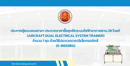 ประกาศผู้ชนะการเสนอราคา ประกวดราคาซื้อชุดฝึกระบบไฟฟ้าอากาศยาน ๒๔ โวลต์ (Aircraft Dual Electrical System Trainer ) จำนวน ๑ ชุด ด้วยวิธีประกวดราคาอิเล็กทรอนิกส์ (e-bidding)