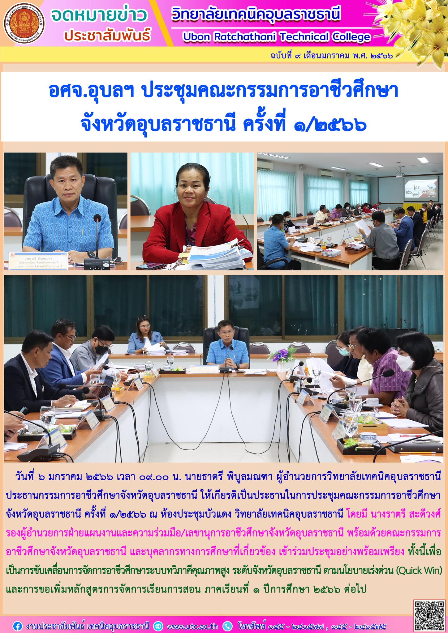 วันที่ ๖ มกราคม ๒๕๖๖ เวลา ๐๙.๐๐ น. นายธาตรี พิบูลมณฑา ผู้อำนวยการวิทยาลัยเทคนิคอุบลราชธานีประธานกรรมการอาชีวศึกษาจังหวัดอุบลราชธานี ให้เกียรติเป็นประธานในการประชุมคณะกรรมการอาชีวศึกษาจังหวัดอุบลราชธานี ครั้งที่ ๑/๒๕๖๖ ณ ห้องประชุมบัวแดง วิทยาลัยเทคนิคอุบลราชธานี โดยมี นางราตรี สะดีวงศ์ รองผู้อำนวยการฝ่ายแผนงานและความร่วมมือ เลขานุการอาชีวศึกษาจังหวัดอุบลราชธานี พร้อมด้วยคณะกรรมการอาชีวศึกษาจังหวัดอุบลราชธานี และบุคลากรทางการศึกษาที่เกี่ยวข้อง เข้าร่วมประชุมอย่างพร้อมเพรียง ทั้งนี้เพื่อเป็นการขับเคลื่อนการจัดการอาชีวศึกษาระบบทวิภาคีคุณภาพสูง ระดับจังหวัดอุบลราชธานี ตามนโยบายเร่งด่วน (Quick Win) และการขอเพิ่มหลักสูตรการจัดการเรียนการสอน ภาคเรียนที่ ๑ ปีการศึกษา ๒๕๖๖ ต่อไป