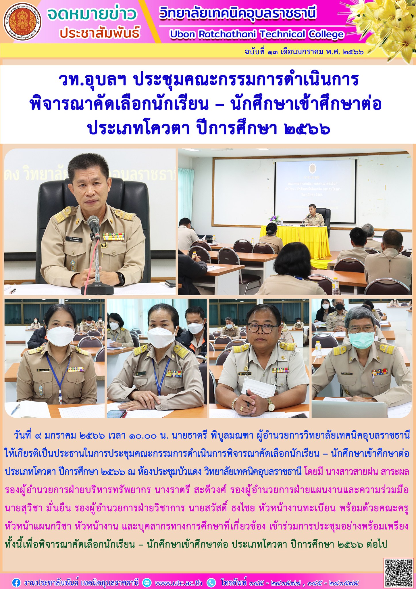 วันที่ ๙ มกราคม ๒๕๖๖ เวลา ๑๐.๐๐ น. นายธาตรี พิบูลมณฑาผู้อำนวยการวิทยาลัยเทคนิคอุบลราชธานี ให้เกียรติเป็นประธานในการประชุมคณะกรรมการดำเนินการพิจารณาคัดเลือกนักเรียน – นักศึกษาเข้าศึกษาต่อ ประเภทโควตา ปีการศึกษา ๒๕๖๖ ณ ห้องประชุมบัวแดง วิทยาลัยเทคนิคอุบลราชธานี โดยมี นางสาวสายฝน สาระผล รองผู้อำนวยการฝ่ายบริหารทรัพยากร นางราตรี สะดีวงศ์ รองผู้อำนวยการฝ่ายแผนงานและความร่วมมือ นายสุวิชา มั่นยืน รองผู้อำนวยการฝ่ายวิชาการ นายสวัสดิ์ ธงไชย หัวหน้างานทะเบียน พร้อมด้วยคณะครูหัวหน้าแผนกวิชา หัวหน้างาน และบุคลากรทางการศึกษาที่เกี่ยวข้อง เข้าร่วมการประชุมอย่างพร้อมเพรียง ทั้งนี้เพื่อพิจารณาคัดเลือกนักเรียน – นักศึกษาเข้าศึกษาต่อ ประเภทโควตา ปีการศึกษา ๒๕๖๖ ต่อไป