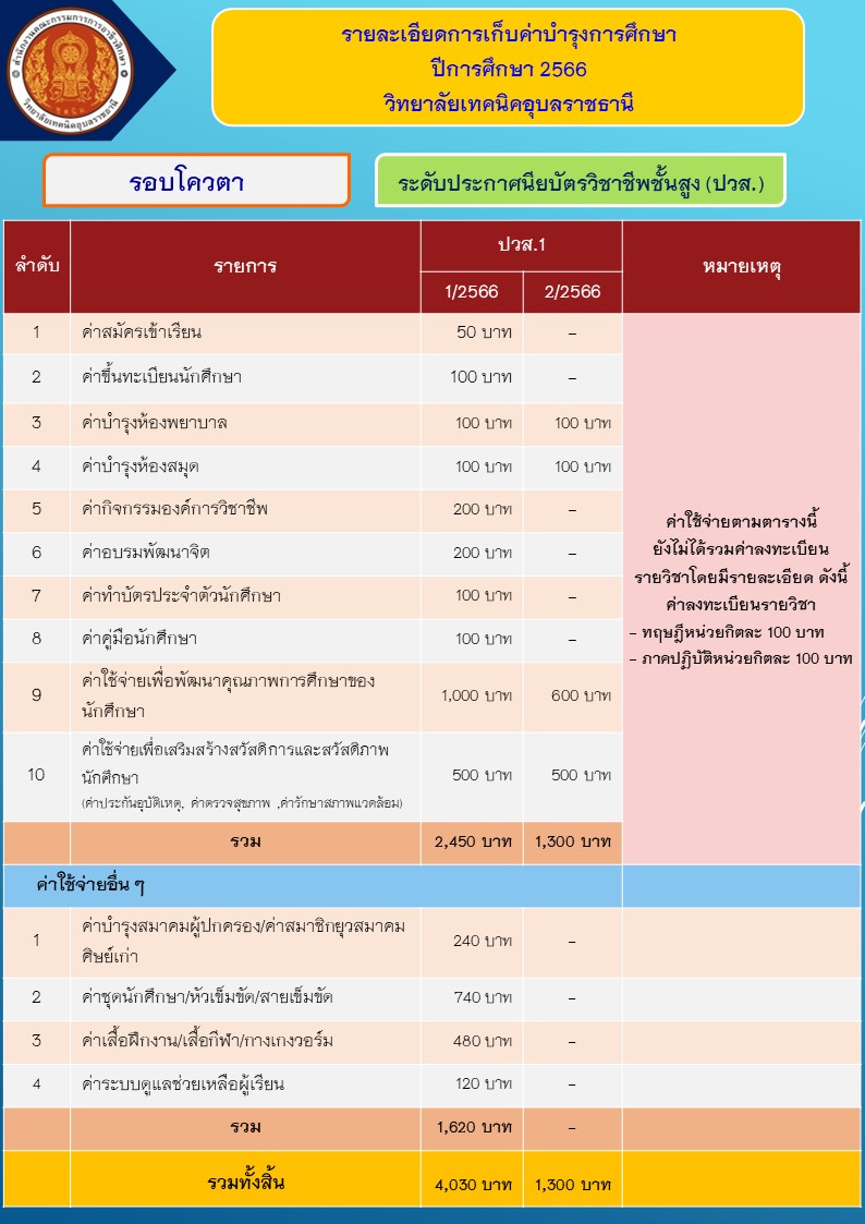 รายละเอียดค่าบำรุงการศึกษา ปีการศึกษา 2566 วิทยาลัยเทคนิคอุบลราชธานี