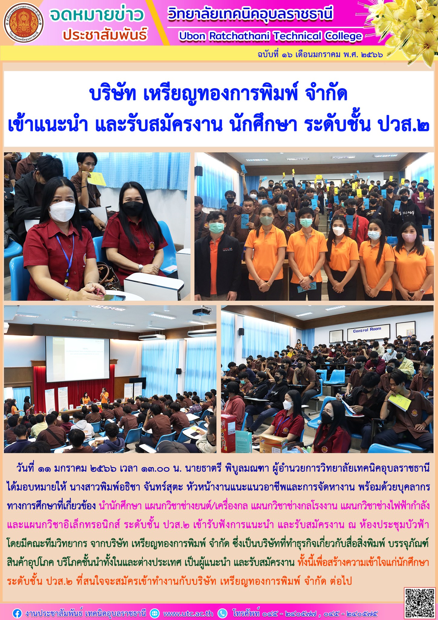 วันที่ ๑๑ มกราคม ๒๕๖๖ เวลา ๑๓.๐๐ น. นายธาตรี พิบูลมณฑา ผู้อำนวยการวิทยาลัยเทคนิคอุบลราชธานี ได้มอบหมายให้ นางสาวพิมพ์อธิชา จันทร์สุตะ หัวหน้างานแนะแนวอาชีพและการจัดหางาน พร้อมด้วยบุคลากรทางการศึกษาที่เกี่ยวข้อง นำนักศึกษา แผนกวิชาช่างยนต์/เครื่องกล แผนกวิชาช่างกลโรงงาน แผนกวิชาช่างไฟฟ้ากำลัง และแผนกวิชาอิเล็กทรอนิกส์ ระดับชั้น ปวส.๒ เข้ารับฟังการแนะนำ และรับสมัครงาน ณ ห้องประชุมบัวฟ้า โดยมีคณะทีมวิทยากร จากบริษัท เหรียญทองการพิมพ์ จำกัด ซึ่งเป็นบริษัทที่ทำธุรกิจเกี่ยวกับสื่อสิ่งพิมพ์ บรรจุภัณฑ์ สินค้าอุปโภค บริโภคชั้นนำทั้งในและต่างประเทศ เป็นผู้แนะนำ และรับสมัครงาน ทั้งนี้เพื่อสร้างความเข้าใจแก่นักศึกษา ระดับชั้น ปวส.๒ ที่สนใจจะสมัครเข้าทำงานกับบริษัท เหรียญทองการพิมพ์ จำกัด ต่อไป
