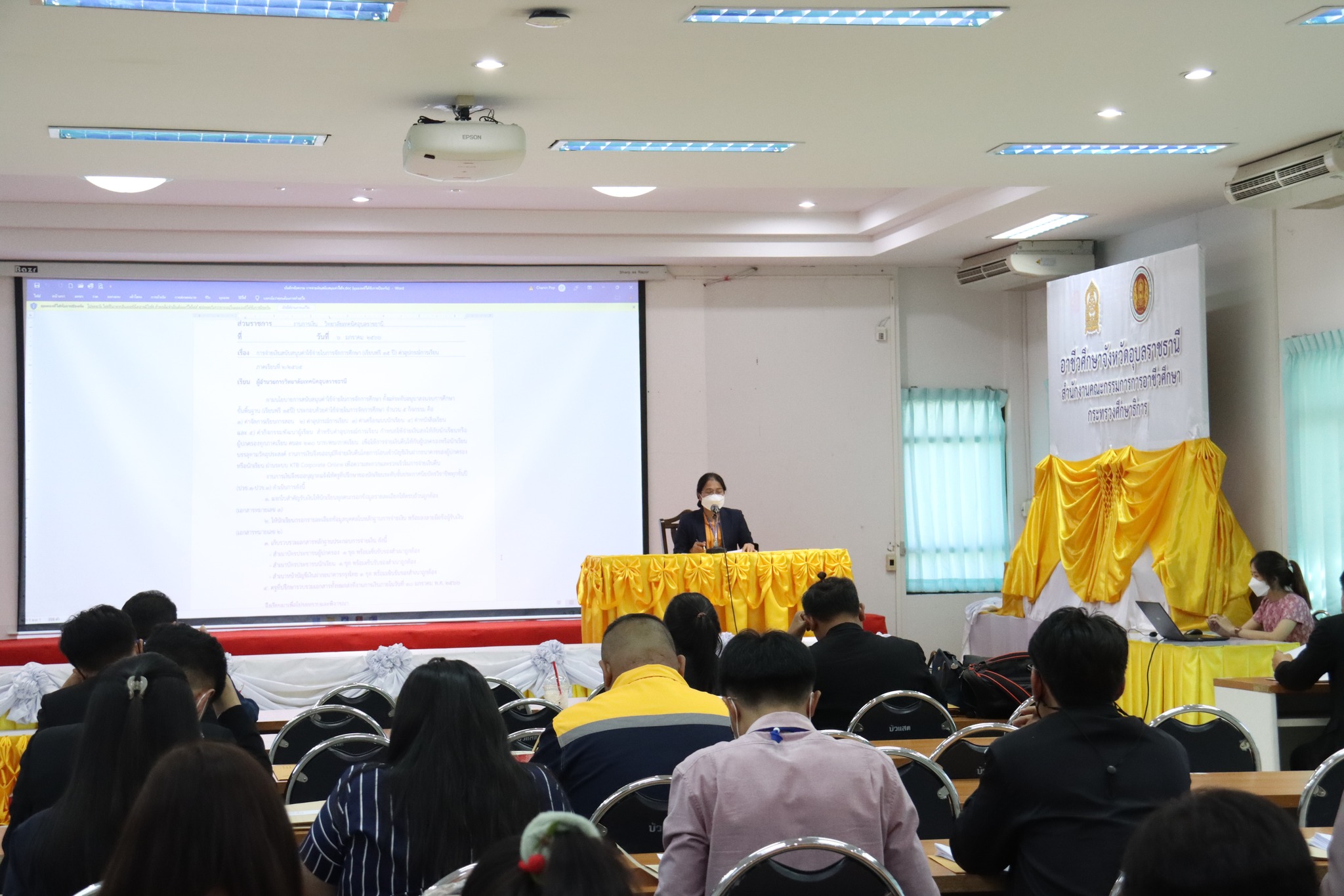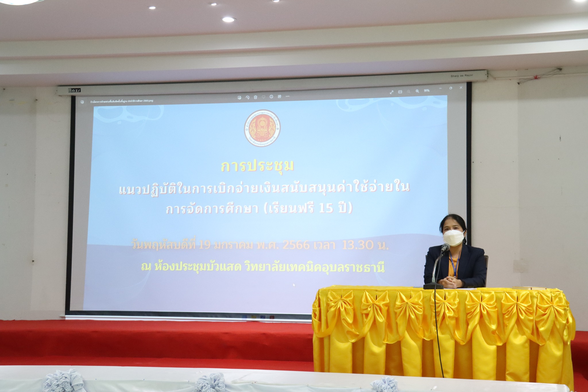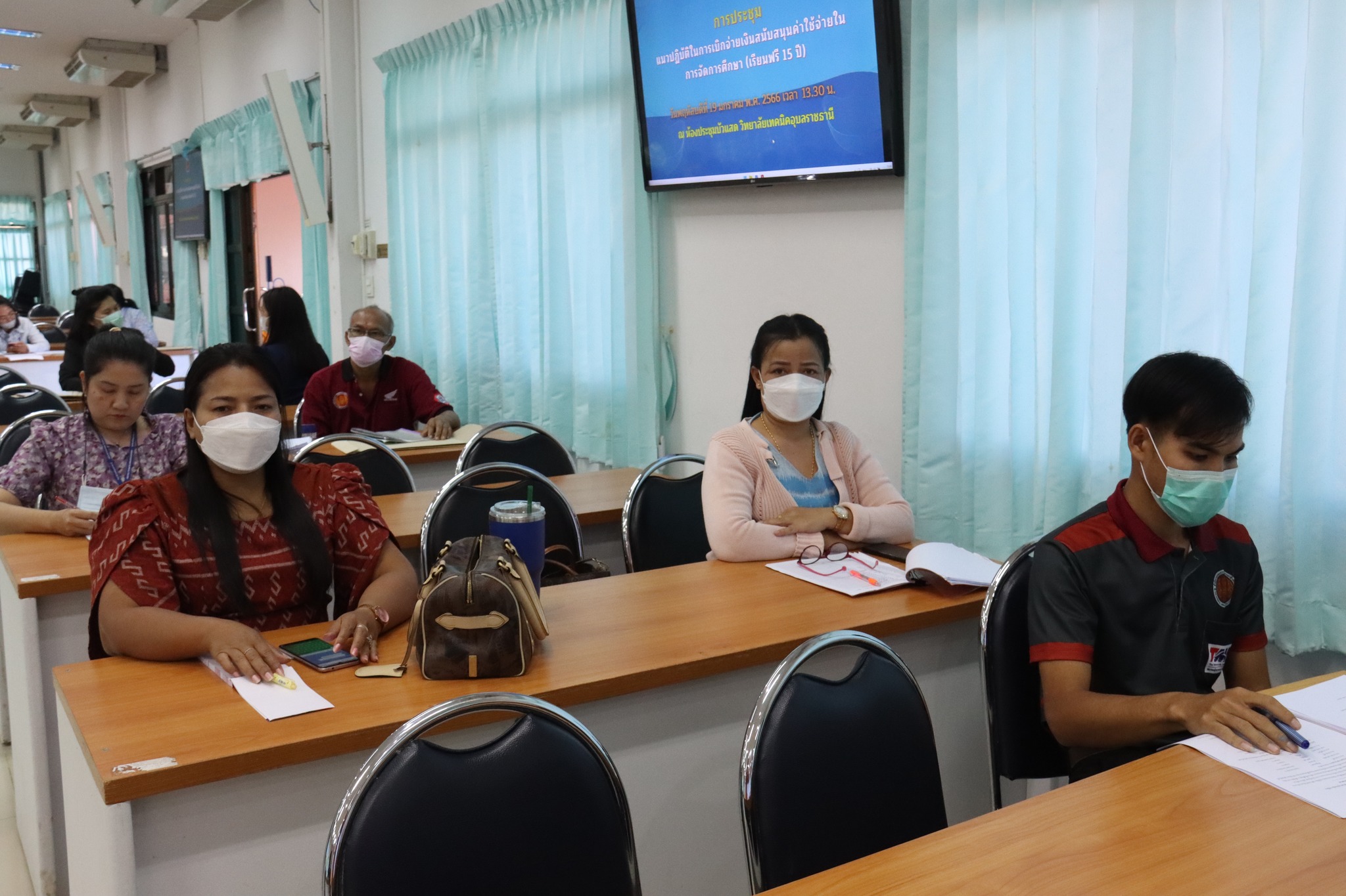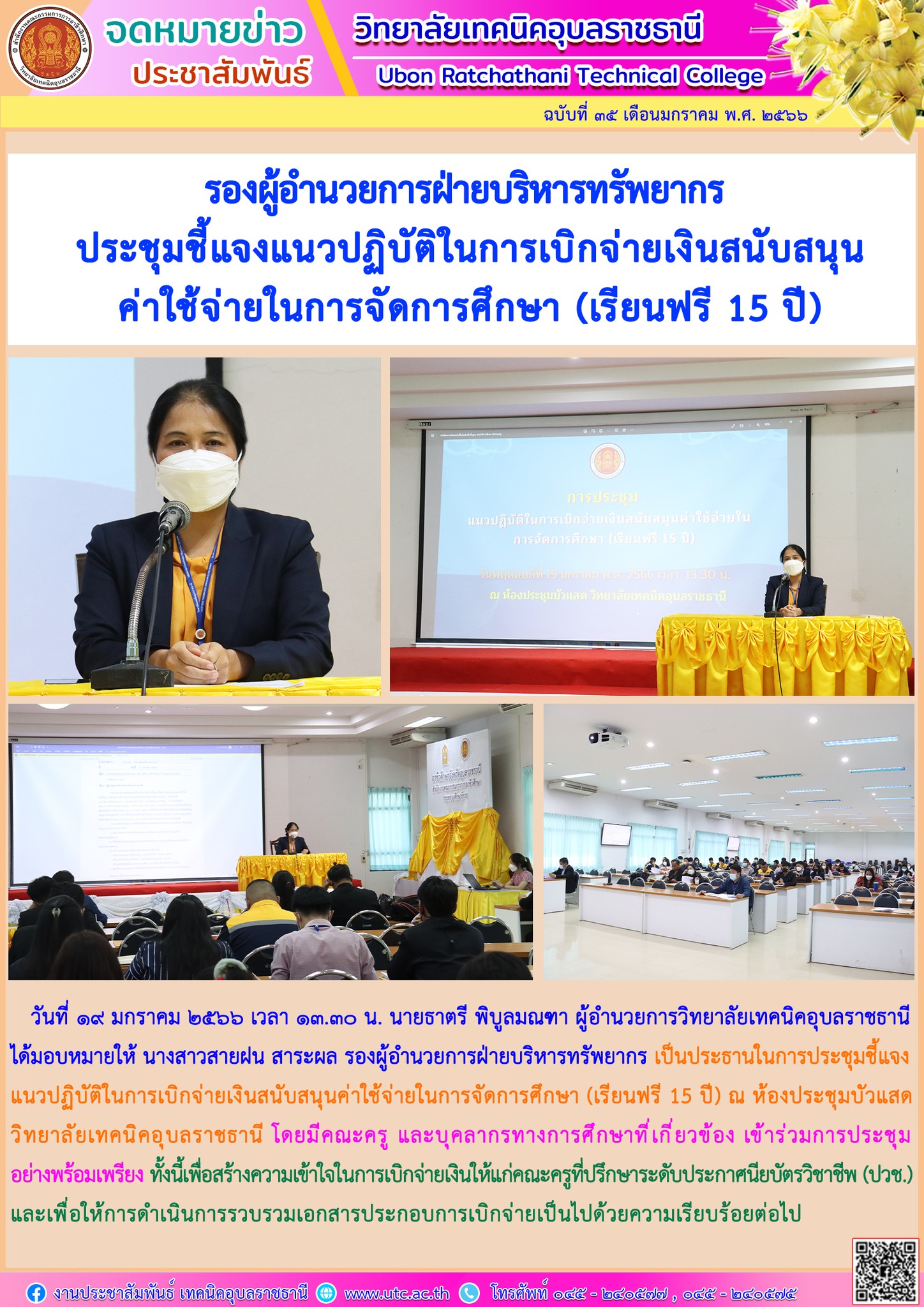 วันที่ ๑๙ มกราคม ๒๕๖๖ เวลา ๑๓.๓๐ น. นายธาตรี พิบูลมณฑา ผู้อำนวยการวิทยาลัยเทคนิคอุบลราชธานี ได้มอบหมายให้ นางสาวสายฝน สาระผล รองผู้อำนวยการฝ่ายบริหารทรัพยากร เป็นประธานในการประชุมชี้แจงแนวปฏิบัติในการเบิกจ่ายเงินสนับสนุนค่าใช้จ่ายในการจัดการศึกษา (เรียนฟรี 15 ปี) ณ ห้องประชุมบัวแสด วิทยาลัยเทคนิคอุบลราชธานี โดยมีคณะครู และบุคลากรทางการศึกษาที่เกี่ยวข้อง เข้าร่วมการประชุมอย่างพร้อมเพรียง ทั้งนี้เพื่อสร้างความเข้าใจในการเบิกจ่ายเงินให้แก่คณะครูที่ปรึกษาระดับประกาศนียบัตรวิชาชีพ (ปวช.) และเพื่อให้การดำเนินการรวบรวมเอกสารประกอบการเบิกจ่ายเป็นไปด้วยความเรียบร้อยต่อไป