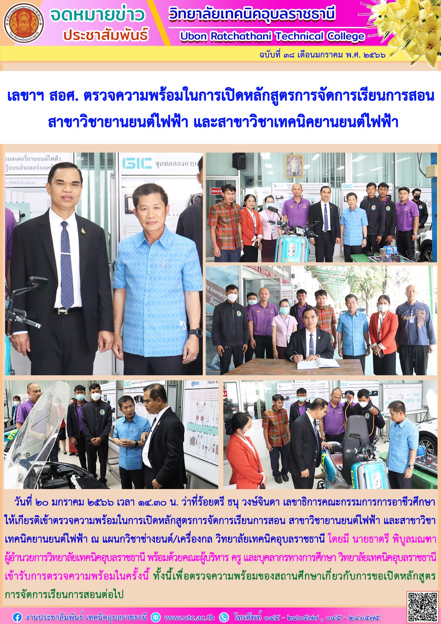 วันที่ ๒๐ มกราคม ๒๕๖๖ เวลา ๑๔.๓๐ น. ว่าที่ร้อยตรี ธนุ วงษ์จินดา เลขาธิการคณะกรรมการการอาชีวศึกษา ให้เกียรติเข้าตรวจความพร้อมในการเปิดหลักสูตรการจัดการเรียนการสอน สาขาวิชายานยนต์ไฟฟ้า และสาขาวิชาเทคนิคยานยนต์ไฟฟ้า ณ แผนกวิชาช่างยนต์/เครื่องกล วิทยาลัยเทคนิคอุบลราชธานี โดยมี นายธาตรี พิบูลมณฑา ผู้อำนวยการวิทยาลัยเทคนิคอุบลราชธานี พร้อมด้วยคณะผู้บริหาร ครู และบุคลากรทางการศึกษา วิทยาลัยเทคนิคอุบลราชธานี เข้ารับการตรวจความพร้อมในครั้งนี้ ทั้งนี้เพื่อตรวจความพร้อมของสถานศึกษาเกี่ยวกับการขอเปิดหลักสูตรการจัดการเรียนการสอนต่อไป