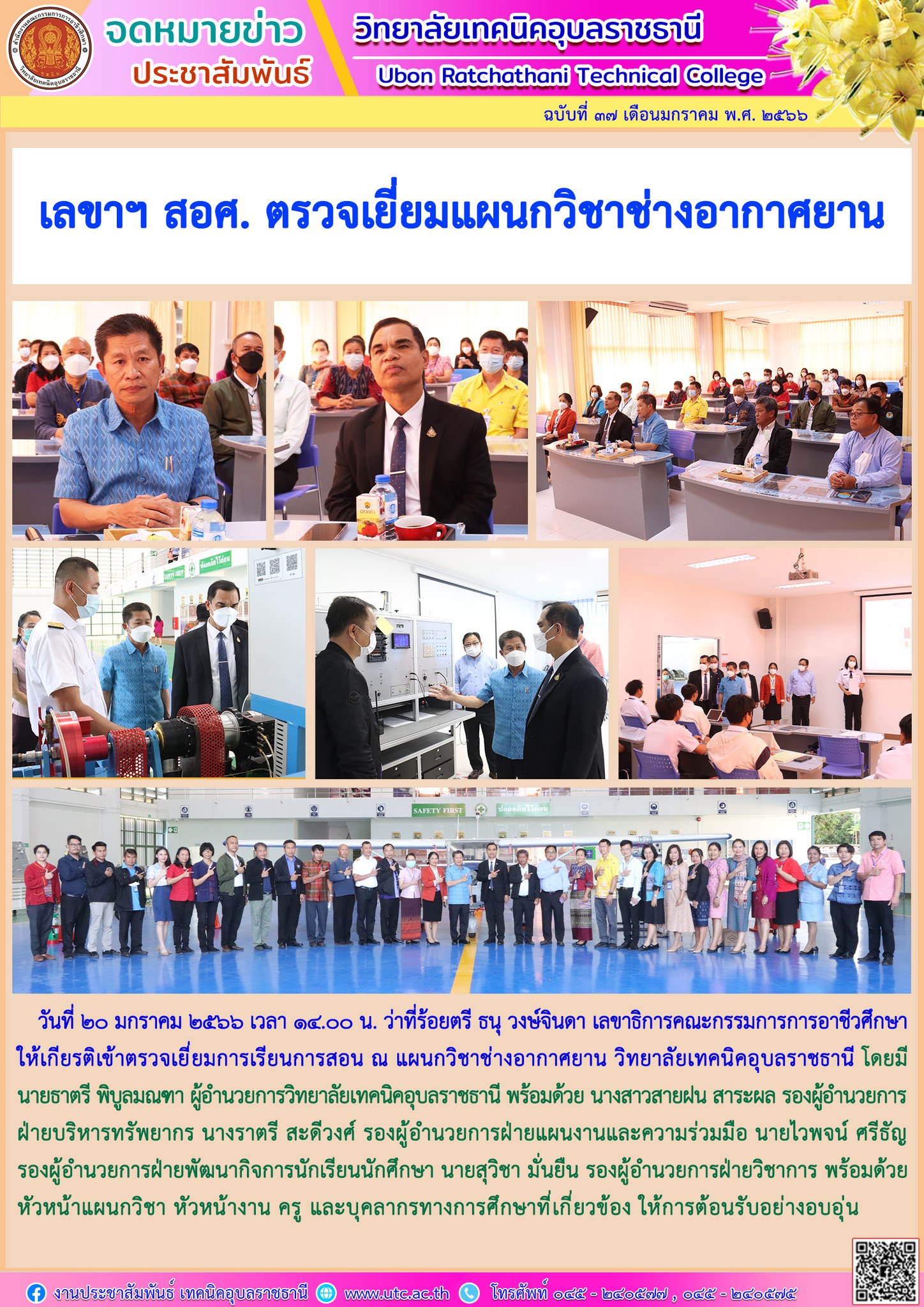 วันที่ ๒๐ มกราคม ๒๕๖๖ เวลา ๑๔.๐๐ น. ว่าที่ร้อยตรี ธนุ วงษ์จินดา เลขาธิการคณะกรรมการการอาชีวศึกษาให้เกียรติเข้าตรวจเยี่ยมการเรียนการสอน ณ แผนกวิชาช่างอากาศยาน วิทยาลัยเทคนิคอุบลราชธานี โดยมี นายธาตรี พิบูลมณฑา ผู้อำนวยการวิทยาลัยเทคนิคอุบลราชธานี พร้อมด้วย นางสาวสายฝน สาระผล รองผู้อำนวยการฝ่ายบริหารทรัพยากร นางราตรี สะดีวงศ์ รองผู้อำนวยการฝ่ายแผนงานและความร่วมมือ นายไวพจน์ ศรีธัญ รองผู้อำนวยการฝ่ายพัฒนากิจการนักเรียนนักศึกษา นายสุวิชา มั่นยืน รองผู้อำนวยการฝ่ายวิชาการ พร้อมด้วยหัวหน้าแผนกวิชา หัวหน้างาน ครู และบุคลากรทางการศึกษาที่เกี่ยวข้อง ให้การต้อนรับอย่างอบอุ่น