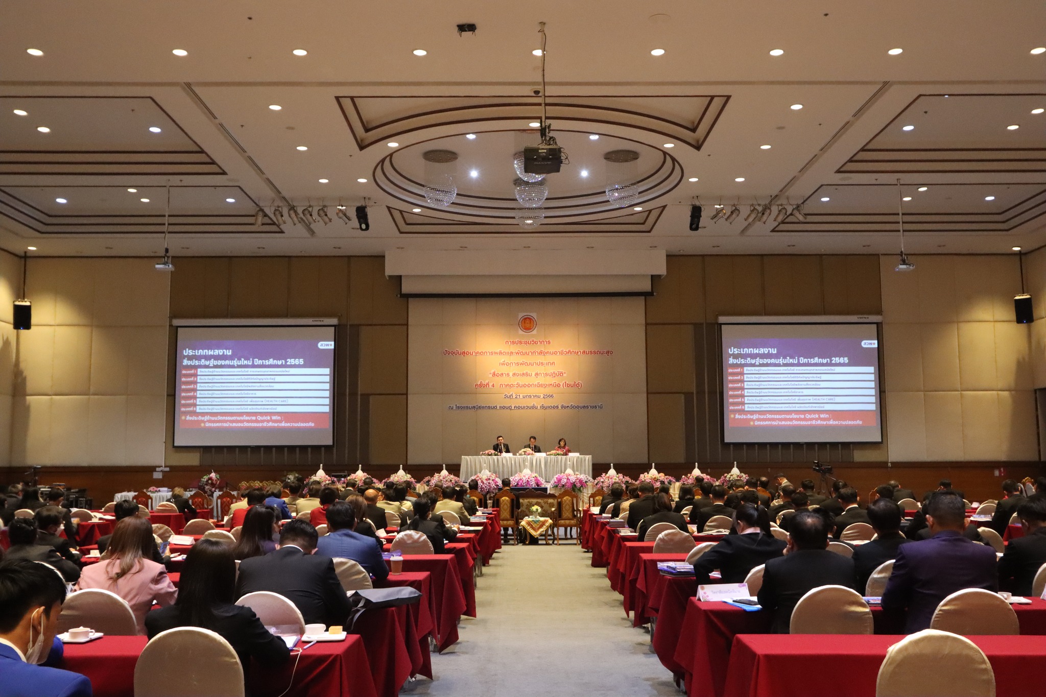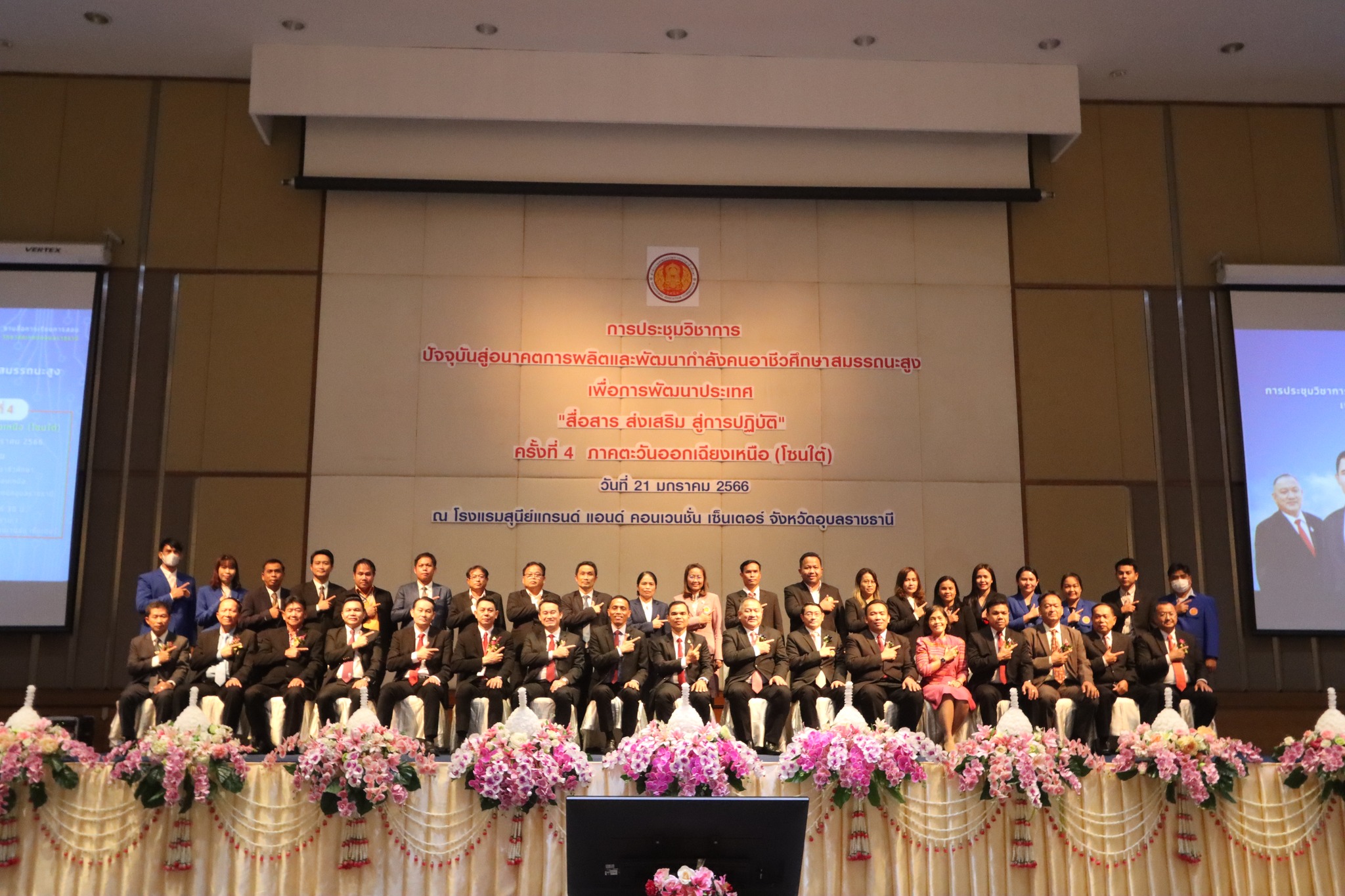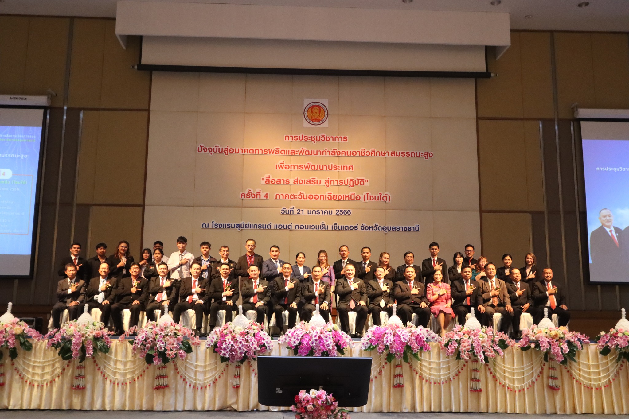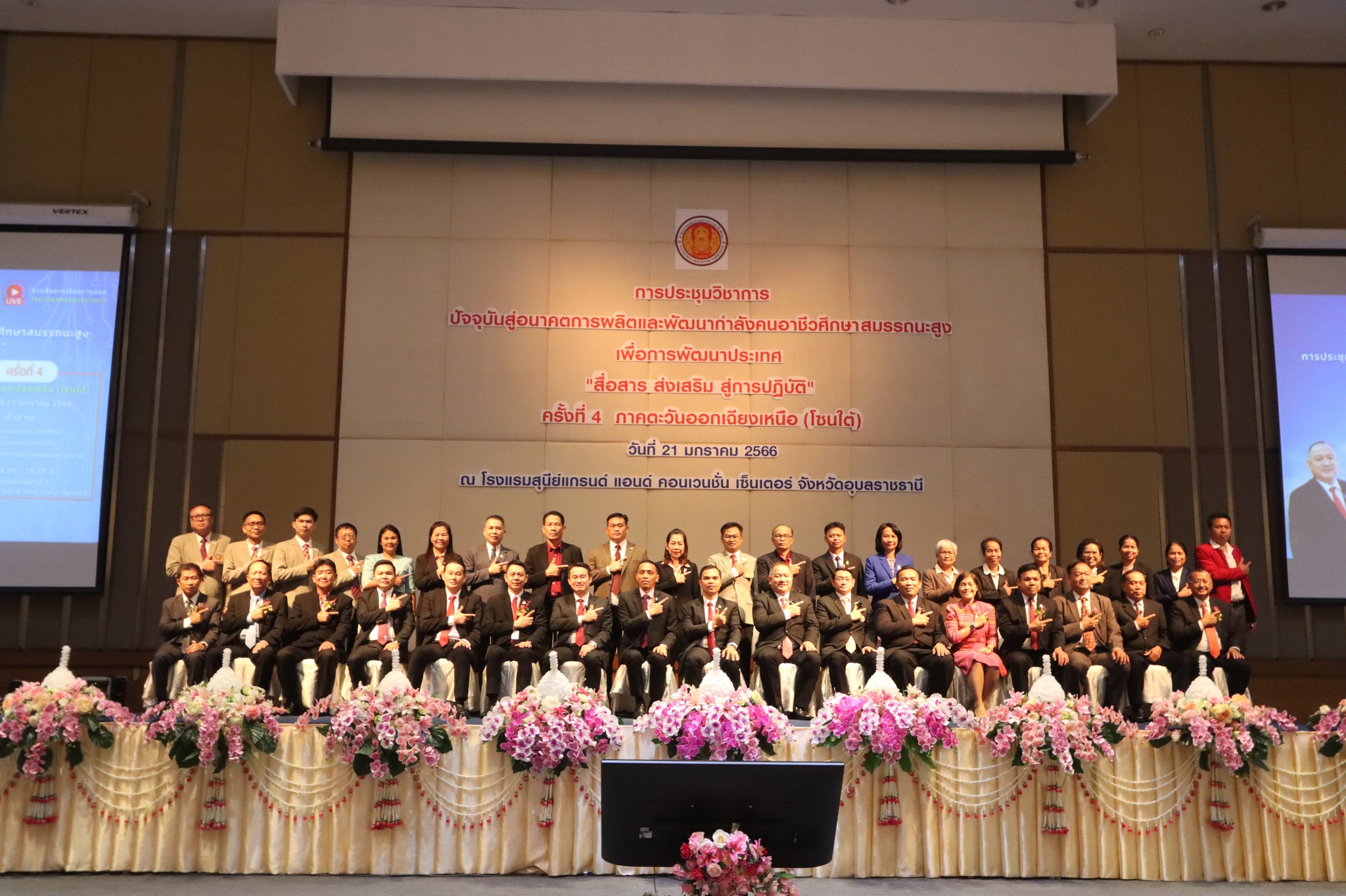 วันที่ ๒๑ มกราคม ๒๕๖๖ เวลา ๐๙.๐๐ น. ว่าที่ร้อยตรี ธนุวงษ์จินดา เลขาธิการคณะกรรมการการอาชีวศึกษา ให้เกียรติเป็นประธานในการประชุมวิชาการ : ปัจจุบันสู่อนาคตการผลิตและพัฒนากำลังคนอาชีวศึกษาสมรรถนะสูง เพื่อการพัฒนาประเทศ “สื่อสาร ส่งเสริม สู่การปฏิบัติ” ครั้งที่ ๔ ภาคตะวันออกเฉียงเหนือ (โซนใต้) โดยมี นายยศพล เวณุโกเศศ เรืออากาศโท สมพร ปานดำ รองเลขาธิการคณะกรรมการการอาชีวศึกษา นายวิทวัต ปัญจมะวัต ที่ปรึกษาด้านนโยบายและแผน ดร.นิติ นาชิต ที่ปรึกษาด้านมาตรฐานอาชีวศึกษาธุรกิจและบริการ นายสง่า แต่เชื้อสาย ผู้ช่วยเลขาธิการคณะกรรมการการอาชีวศึกษา ผู้อำนวยการสำนัก ผู้อำนวยการศูนย์ พร้อมด้วยคณะร่วมบรรยายพิเศษ ณ โรงแรมสุนีย์แกรนด์ แอน คอนเวนชั่น เซ็นเตอร์ จังหวัดอุบลราชธานี ในการนี้นายอาคม จันทร์นาม ผู้อำนวยการวิทยาลัยเทคนิคร้อยเอ็ด ประธานกรรมการอาชีวศึกษาภาคตะวันออกเฉียงเหนือ กล่าวรายงาน และนายธาตรี พิบูลมณฑา ผู้อำนวยการวิทยาลัยเทคนิคอุบลราชธานี ประธานกรรมการอาชีวศึกษาจังหวัดอุบลราชธานี กล่าวต้อนรับ มีผู้บริหารสถาบันการอาชีวศึกษาภาคตะวันออกเฉียงเหนือ ๔ และ ๕ สถานศึกษาภาครัฐ ๕๔ แห่ง และภาคเอกชน ๑๘ แห่ง เจ้าหน้าที่ และผู้เกี่ยวข้อง เข้าร่วมการประชุมอย่างพร้อมเพรียง ทั้งนี้เพื่อขับเคลื่อนการปฏิบัติราชการของ สำนักงานคณะกรรมการการอาชีวศึกษา ประจำปีงบประมาณ ๒๕๖๖ ให้สอดคล้องกับ ๙ นโยบายเร่งด่วน Quick win และ ๕ นโยบายหลัก รวมถึงสอดคล้องและสนับสนุนต่อนโยบายของรัฐบาล ยุทธศาสตร์ชาติ แผนแม่บทภายใต้ยุทธศาสตร์ชาติ แผนปฏิรูปประเทศ แผนพัฒนาเศรษฐกิจและสังคมแห่งชาติ และแผนระดับชาติต่าง ๆ ที่เกี่ยวข้องต่อไป