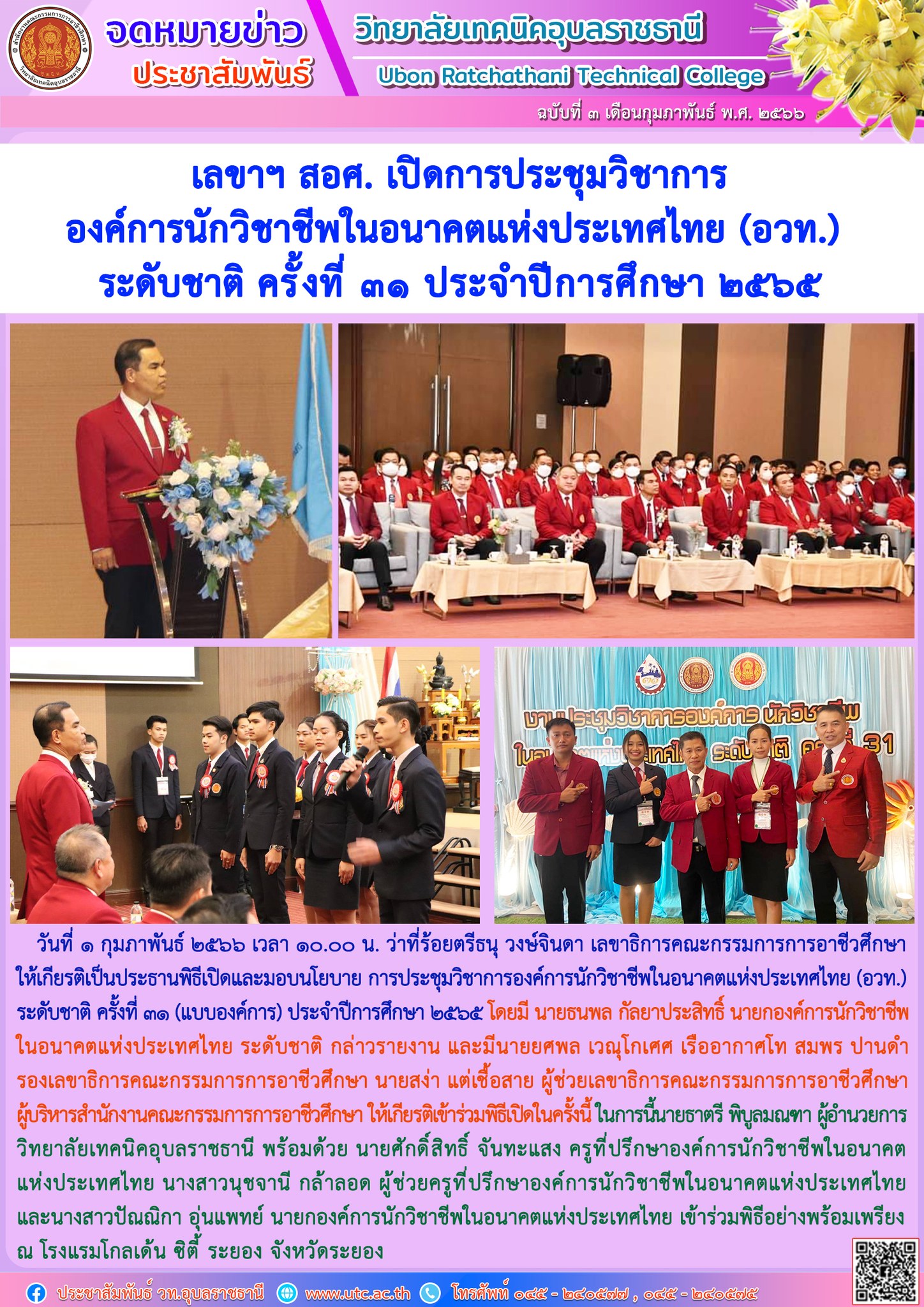 วันที่ ๑ กุมภาพันธ์ ๒๕๖๖เวลา ๑๐.๐๐ น. ว่าที่ร้อยตรีธนุ วงษ์จินดา เลขาธิการคณะกรรมการกาอาชีวศึกษา ให้เกียรติเป็นประธานพิธีเปิดและมอบนโยบาย การประชุมวิชาการองค์การนักวิชาชีพในอนาคตแห่งประเทศไทย (อวท.) ระดับชาติ ครั้งที่ ๓๑ (แบบองค์การ) ประจำปีการศึกษา ๒๕๖๕ โดยมี นายธนพล กัลยาประสิทธิ์ นายกองค์การนักวิชาชีพในอนาคตแห่งประเทศไทย ระดับชาติ กล่าวรายงาน และมีนายยศพล เวณุโกเศศ เรืออากาศโท สมพร ปานดำ รองเลขาธิการคณะกรรมการการอาชีวศึกษา นายสง่า แต่เชื้อสาย ผู้ช่วยเลขาธิการคณะกรรมการการอาชีวศึกษา ผู้บริหารสำนักงานคณะกรรมการการอาชีวศึกษา ให้เกียรติเข้าร่วมพิธีเปิดในครั้งนี้ ในการนี้นายธาตรี พิบูลมณฑา ผู้อำนวยการวิทยาลัยเทคนิคอุบลราชธานี พร้อมด้วย นายศักดิ์สิทธิ์ จันทะแสง ครูที่ปรึกษาองค์การนักวิชาชีพในอนาคตแห่งประเทศไทย นางสาวนุชจานี กล้าลอด ผู้ช่วยครูที่ปรึกษาองค์การนักวิชาชีพในอนาคตแห่งประเทศไทย และนางสาวปัณณิกา อุ่นแพทย์ นายกองค์การนักวิชาชีพในอนาคตแห่งประเทศไทย เข้าร่วมพิธีอย่างพร้อมเพรียง ณ โรงแรมโกลเด้น ซิตี้ ระยอง จังหวัดระยอง