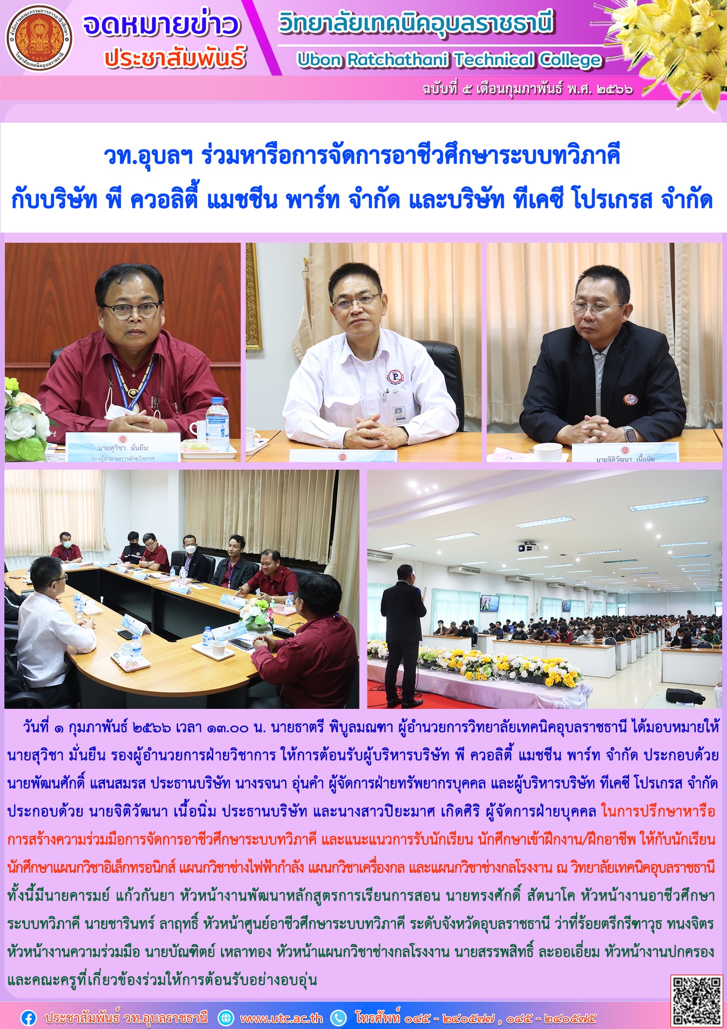 วันที่ ๑ กุมภาพันธ์ ๒๕๖๖ เวลา ๑๓.๐๐ น. นายธาตรี พิบูลมณฑาผู้อำนวยการวิทยาลัยเทคนิคอุบลราชธานี ได้มอบหมายให้นายสุวิชา มั่นยืน รองผู้อำนวยการฝ่ายวิชาการ ให้การต้อนรับผู้บริหารบริษัท พี ควอลิตี้ แมชชีน พาร์ท จำกัด ประกอบด้วย นายพัฒนศักดิ์ แสนสมรส ประธานบริษัท นางรจนา อุ่นคำ ผู้จัดการฝ่ายทรัพยากรบุคคล และผู้บริหารบริษัท ทีเคซี โปรเกรส จำกัด ประกอบด้วย นายจิติวัฒนา เนื้อนิ่ม ประธานบริษัท และนางสาวปิยะมาศ เกิดศิริ ผู้จัดการฝ่ายบุคคล ในการปรึกษาหารือการสร้างความร่วมมือการจัดการอาชีวศึกษาระบบทวิภาคี และแนะแนวการรับนักเรียน นักศึกษาเข้าฝึกงาน/ฝึกอาชีพ ให้กับนักเรียน นักศึกษาแผนกวิชาอิเล็กทรอนิกส์ แผนกวิชาช่างไฟฟ้ากำลัง แผนกวิชาเครื่องกล และแผนกวิชาช่างกลโรงงาน ณ วิทยาลัยเทคนิคอุบลราชธานี ทั้งนี้มีนายคารมย์ แก้วกันยา หัวหน้างานพัฒนาหลักสูตรการเรียนการสอน นายทรงศักดิ์ สัตนาโค หัวหน้างานอาชีวศึกษาระบบทวิภาคี นายชารินทร์ ลาฤทธิ์ หัวหน้าศูนย์อาชีวศึกษาระบบทวิภาคี ระดับจังหวัดอุบลราชธานี ว่าที่ร้อยตรีกรีฑาวุธ ทนงจิตร หัวหน้างานความร่วมมือ นายบัณฑิตย์ เหลาทอง หัวหน้าแผนกวิชาช่างกลโรงงาน นายสรรพสิทธิ์ ละออเอี่ยม หัวหน้างานปกครอง และคณะครูที่เกี่ยวข้องร่วมให้การต้อนรับอย่างอบอุ่น