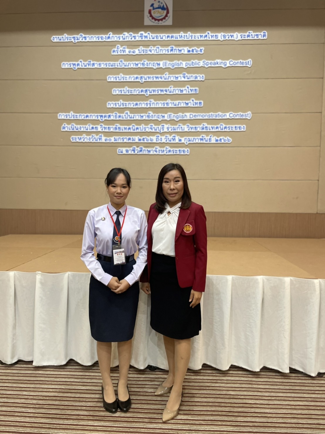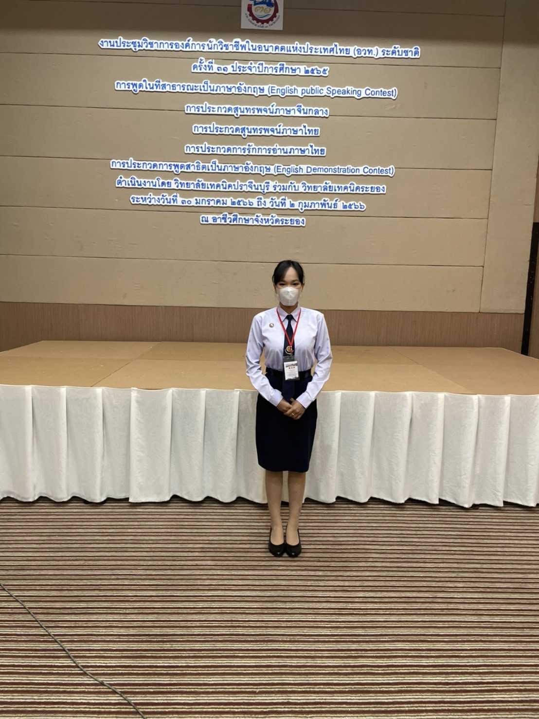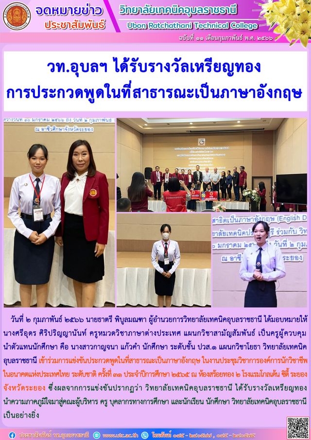 วันที่ ๒ กุมภาพันธ์ ๒๕๖๖ นายธาตรี พิบูลมณฑา ผู้อำนวยการวิทยาลัยเทคนิคอุบลราชธานี ได้มอบหมายให้ นางศรีอุดร ศิริปริญญานันท์ครูหมวดวิชาภาษาต่างประเทศ แผนกวิชาสามัญสัมพันธ์ เป็นครูผู้ควบคุม นำตัวแทนนักศึกษา คือ นางสาวกาญจนา แก้วคำ นักศึกษาระดับชั้น ปวส.๑ แผนกวิชาโยธา วิทยาลัยเทคนิคอุบลราชธานี เข้าร่วมการแข่งขันประกวดพูดในที่สาธารณะเป็นภาษาอังกฤษ ในงานประชุมวิชาการองค์การนักวิชาชีพในอนาคตแห่งประเทศไทย ระดับชาติ ครั้งที่ ๓๑ ประจำปีการศึกษา ๒๕๖๕ ณ ห้องสร้อยทอง ๒ โรงแรมโกลเด้น ซิตี้ ระยอง จังหวัดระยอง ซึ่งผลจากการแข่งขันปรากฏว่า วิทยาลัยเทคนิคอุบลราชธานี ได้รับรางวัลเหรียญทอง นำความภาคภูมิใจมาสู่คณะผู้บริหาร ครู บุคลากรทางการศึกษา และนักเรียน นักศึกษา วิทยาลัยเทคนิคอุบลราชธานี เป็นอย่างยิ่ง