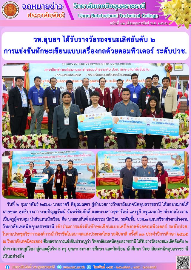 วันที่ ๒ กุมภาพันธ์ ๒๕๖๖ นายธาตรี พิบูลมณฑา ผู้อำนวยการวิทยาลัยเทคนิคอุบลราชธานีได้มอบหมายให้ นายชนะ สุทธิประภา นายปัญญวัฒน์ จันทร์ชัยภักดิ์ และนางสาวจุฑารัตน์ แสงรูจี ครูแผนกวิชาช่างกลโรงงาน เป็นครูผู้ควบคุม นำตัวแทนนักเรียน คือ นายธนกันฑ์ แห่งธรรม นักเรียนระดับชั้น ปวช.๓ แผนกวิชาช่างกลโรงงาน วิทยาลัยเทคนิคอุบลราชธานี เข้าร่วมการแข่งขันทักษะเขียนแบบเครื่องกลด้วยคอมพิวเตอร์ ระดับปวช. ในงานประชุมวิชาการองค์การนักวิชาชีพในอนาคตแห่งประเทศไทย ระดับชาติ ครั้งที่ ๓๑ ประจำปีการศึกษา ๒๕๖๕ ณ วิทยาลัยเทคนิคระยอง ซึ่งผลจากการแข่งขันปรากฏว่า วิทยาลัยเทคนิคอุบลราชธานี ได้รับรางวัลรองชนะเลิศอันดับ ๒ นำความภาคภูมิใจมาสู่คณะผู้บริหาร ครู บุคลากรทางการศึกษา และนักเรียน นักศึกษา วิทยาลัยเทคนิคอุบลราชธานี เป็นอย่างยิ่ง