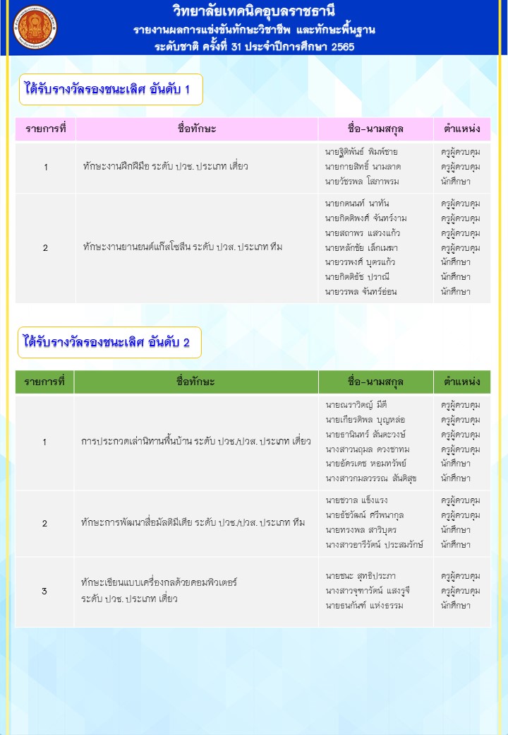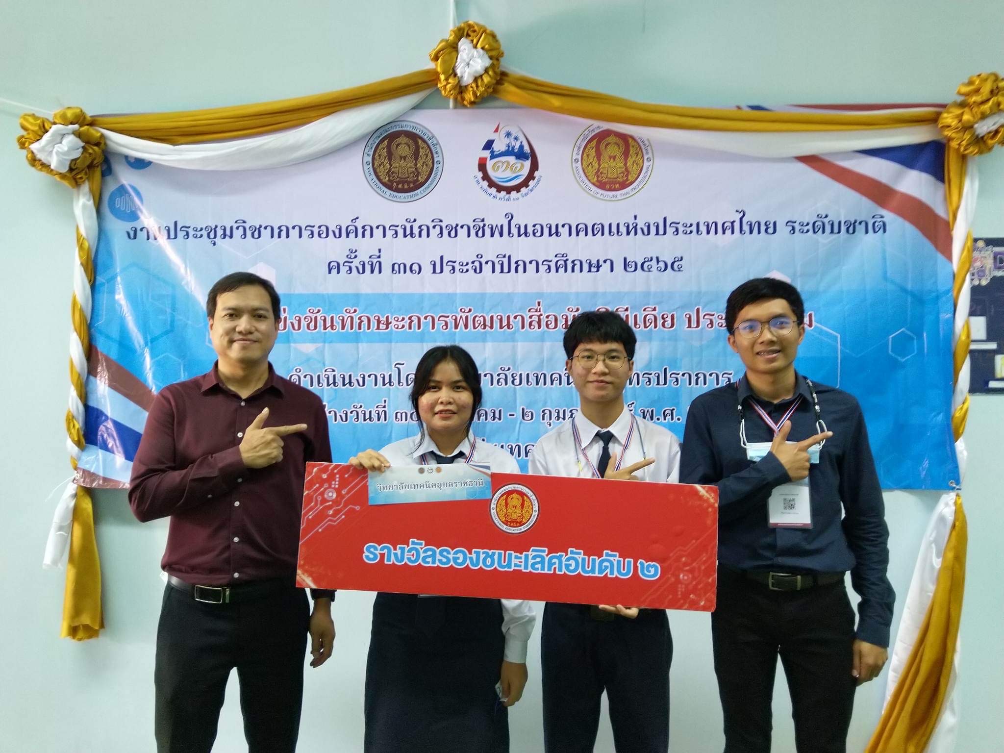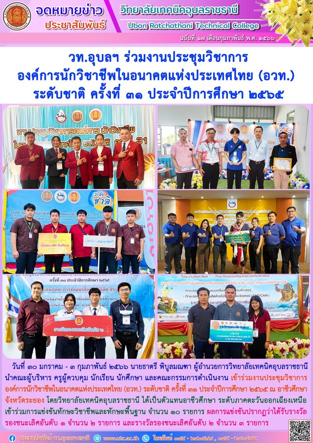 วันที่ ๓๐ มกราคม – ๓ กุมภาพันธ์ ๒๕๖๖ นายธาตรีพิบูลมณฑา ผู้อำนวยการวิทยาลัยเทคนิคอุบลราชธานี นำคณะผู้บริหาร ครูผู้ควบคุม นักเรียน นักศึกษา และคณะกรรมการดำเนินงาน เข้าร่วมงานประชุมวิชาการองค์การนักวิชาชีพในอนาคตแห่งประเทศไทย (อวท.) ระดับชาติ ครั้งที่ ๓๑ ประจำปีการศึกษา ๒๕๖๕ ณ อาชีวศึกษาจังหวัดระยอง โดยวิทยาลัยเทคนิคอุบลราชธานี ได้เป็นตัวแทนอาชีวศึกษา ระดับภาคตะวันออกเฉียงเหนือ เข้าร่วมการแข่งขันทักษะวิชาชีพและทักษะพื้นฐาน จำนวน ๑๐ รายการ ผลการแข่งขันปรากฏว่าได้รับรางวัลรองชนะเลิศอันดับ ๑ จำนวน ๒ รายการ และรางวัลรองชนะเลิศอันดับ ๒ จำนวน ๓ รายการ