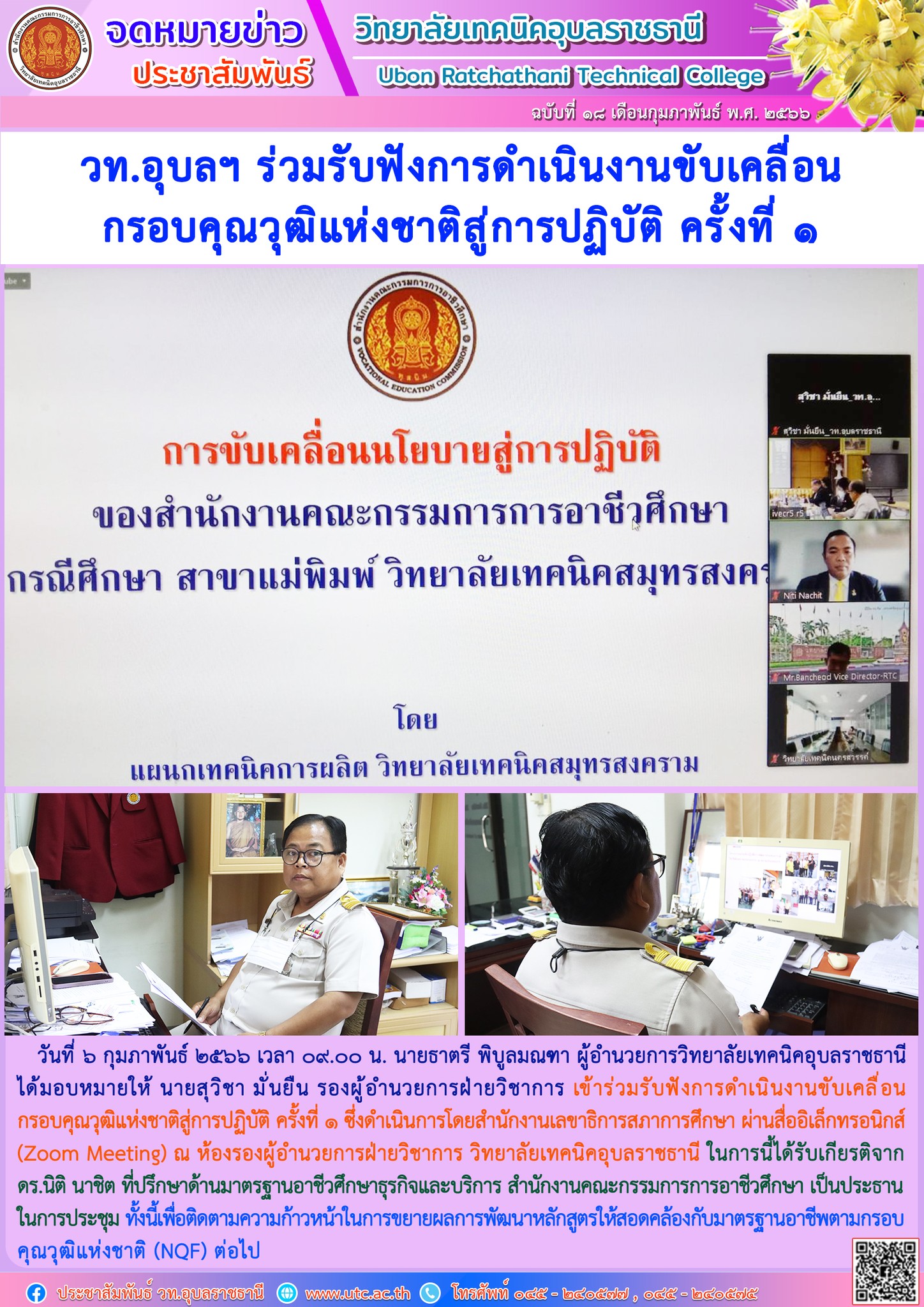 วันที่ ๖ กุมภาพันธ์ ๒๕๖๖ เวลา ๐๙.๐๐ น. นายธาตรี พิบูลมณฑา ผู้อำนวยการวิทยาลัยเทคนิคอุบลราชธานี ได้มอบหมายให้ นายสุวิชา มั่นยืนรองผู้อำนวยการฝ่ายวิชาการ เข้าร่วมรับฟังการดำเนินงานขับเคลื่อนกรอบคุณวุฒิแห่งชาติสู่การปฏิบัติ ครั้งที่ ๑ ซึ่งดำเนินการโดยสำนักงานเลขาธิการสภาการศึกษา ผ่านสื่ออิเล็กทรอนิกส์ (Zoom Meeting) ณ ห้องรองผู้อำนวยการฝ่ายวิชาการ วิทยาลัยเทคนิคอุบลราชธานี ในการนี้ได้รับเกียรติจาก ดร.นิติ นาชิต ที่ปรึกษาด้านมาตรฐานอาชีวศึกษาธุรกิจและบริการ สำนักงานคณะกรรมการการอาชีวศึกษา เป็นประธานในการประชุม ทั้งนี้เพื่อติดตามความก้าวหน้าในการขยายผลการพัฒนาหลักสูตรให้สอดคล้องกับมาตรฐานอาชีพตามกรอบคุณวุฒิแห่งชาติ (NQF) ต่อไป