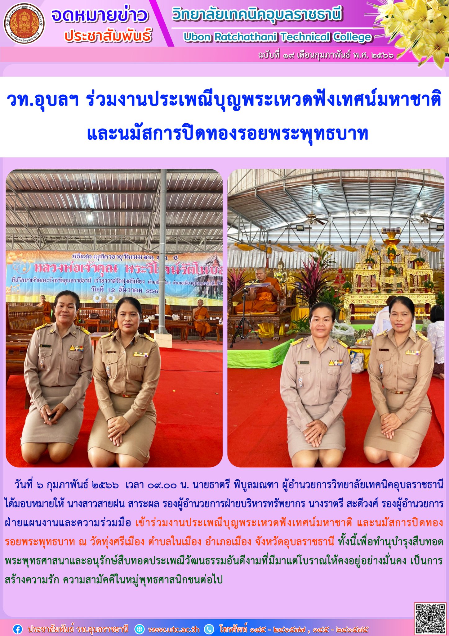 วันที่ ๖ กุมภาพันธ์ ๒๕๖๖ เวลา ๐๙.๐๐ น. นายธาตรี พิบูลมณฑา ผู้อำนวยการวิทยาลัยเทคนิคอุบลราชธานี ได้มอบหมายให้ นางสาวสายฝน สาระผล รองผู้อำนวยการฝ่ายบริหารทรัพยากร นางราตรี สะดีวงศ์ รองผู้อำนวยการฝ่ายแผนงานและความร่วมมือ เข้าร่วมงานประเพณีบุญพระเหวดฟังเทศน์มหาชาติ และนมัสการปิดทองรอยพระพุทธบาท ณ วัดทุ่งศรีเมือง ตำบลในเมือง อำเภอเมือง จังหวัดอุบลราชธานี ทั้งนี้เพื่อทำนุบำรุงสืบทอดพระพุทธศาสนาและอนุรักษ์สืบทอดประเพณีวัฒนธรรมอันดีงามที่มีมาแต่โบราณให้คงอยู่อย่างมั่นคง เป็นการสร้างความรัก ความสามัคคีในหมู่พุทธศาสนิกชน ต่อไป