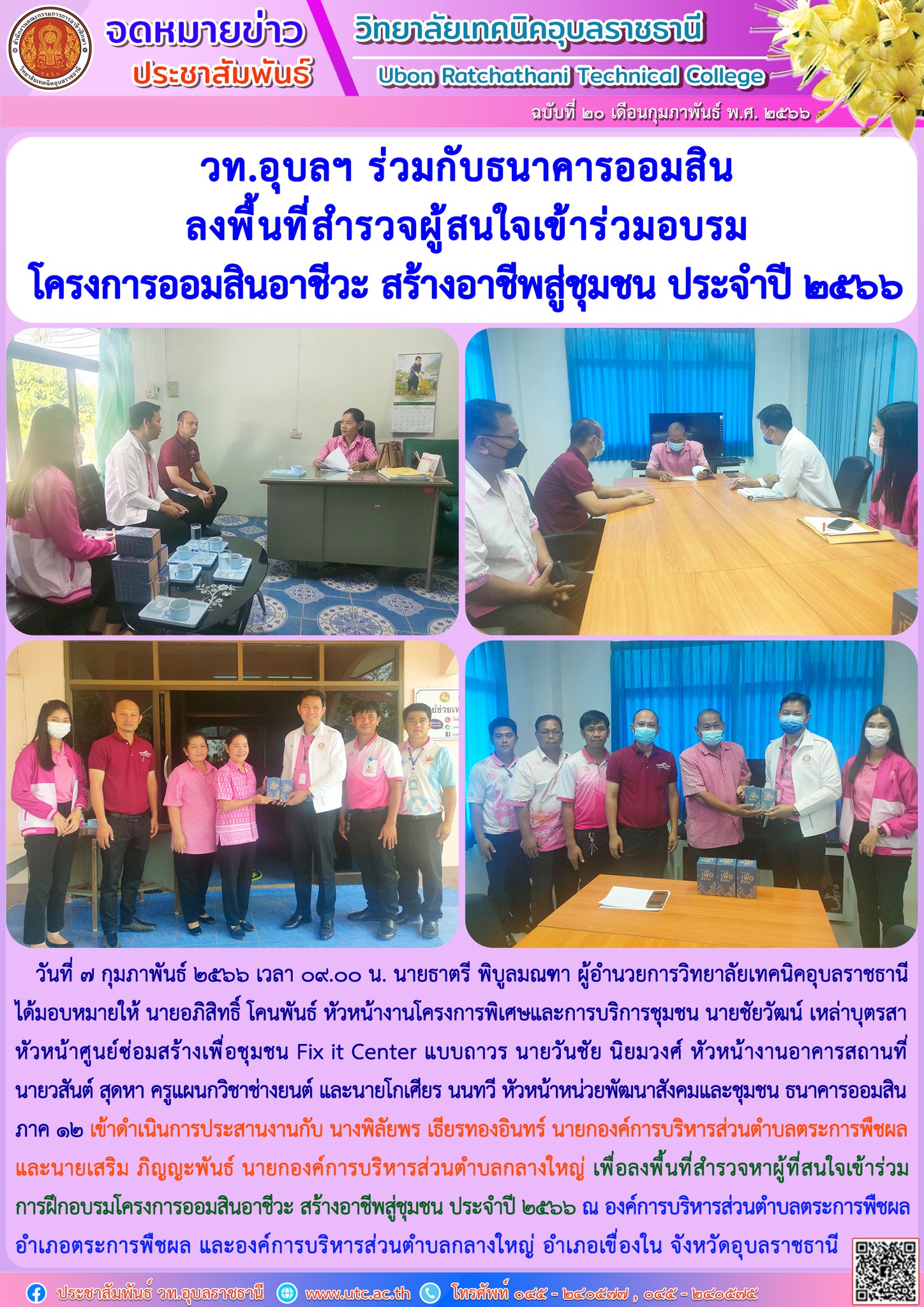 วันที่ ๗ กุมภาพันธ์ ๒๕๖๖ เวลา ๐๙.๐๐ น. นายธาตรี พิบูลมณฑาผู้อำนวยการวิทยาลัยเทคนิคอุบลราชธานี ได้มอบหมายให้ นายอภิสิทธิ์ โคนพันธ์ หัวหน้างานโครงการพิเศษและการบริการชุมชน นายชัยวัฒน์ เหล่าบุตรสา หัวหน้าศูนย์ซ่อมสร้างเพื่อชุมชน Fix it Center แบบถาวร นายวันชัย นิยมวงศ์ หัวหน้างานอาคารสถานที่ นายวสันต์ สุดหา ครูแผนกวิชาช่างยนต์ และนายโกเศียร นนทวี หัวหน้าหน่วยพัฒนาสังคมและชุมชน ธนาคารออมสินภาค ๑๒ เข้าดำเนินการประสานงานกับ นางพิลัยพร เธียรทองอินทร์ นายกองค์การบริหารส่วนตำบลตระการพืชผล และนายเสริม ภิญญะพันธ์ นายกองค์การบริหารส่วนตำบลกลางใหญ่ เพื่อลงพื้นที่สำรวจหาผู้ที่สนใจเข้าร่วมการฝึกอบรมโครงการออมสินอาชีวะ สร้างอาชีพสู่ชุมชน ประจำปี ๒๕๖๖ ณ องค์การบริหารส่วนตำบลตระการพืชผล อำเภอตระการพืชผล และองค์การบริหารส่วนตำบลกลางใหญ่ อำเภอเขื่องใน จังหวัดอุบลราชธานี
