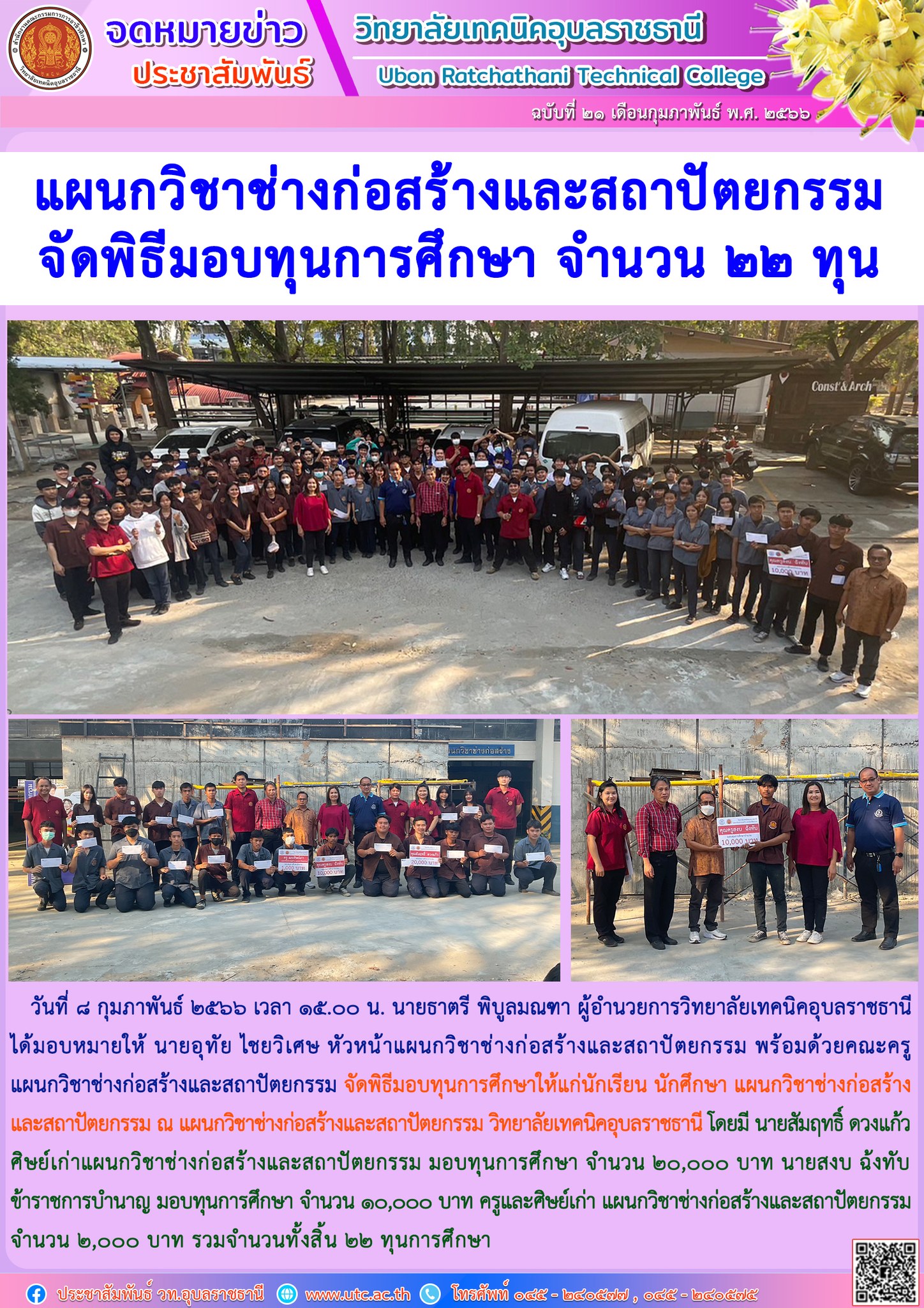 วันที่ ๘ กุมภาพันธ์ ๒๕๖๖ เวลา ๑๕.๐๐ น. นายธาตรี พิบูลมณฑา ผู้อำนวยการวิทยาลัยเทคนิคอุบลราชธานี ได้มอบหมายให้ นายอุทัยไชยวิเศษ หัวหน้าแผนกวิชาช่างก่อสร้างและสถาปัตยกรรม พร้อมด้วยคณะครู แผนกวิชาช่างก่อสร้างและสถาปัตยกรรม จัดพิธีมอบทุนการศึกษาให้แก่นักเรียน นักศึกษา แผนกวิชาช่างก่อสร้างและสถาปัตยกรรม ณ แผนกวิชาช่างก่อสร้างและสถาปัตยกรรม วิทยาลัยเทคนิคอุบลราชธานี โดยมี นายสัมฤทธิ์ ดวงแก้ว ศิษย์เก่าแผนกวิชาช่างก่อสร้างและสถาปัตยกรรม มอบทุนการศึกษา จำนวน ๒๐,๐๐๐ บาท นายสงบ ฉ้งทับ ข้าราชการบำนาญ มอบทุนการศึกษา จำนวน ๑๐,๐๐๐ บาท ครูและศิษย์เก่า แผนกวิชาช่างก่อสร้างและสถาปัตยกรรม จำนวน ๒,๐๐๐ บาท รวมจำนวนทั้งสิ้น ๒๒ ทุนการศึกษา
