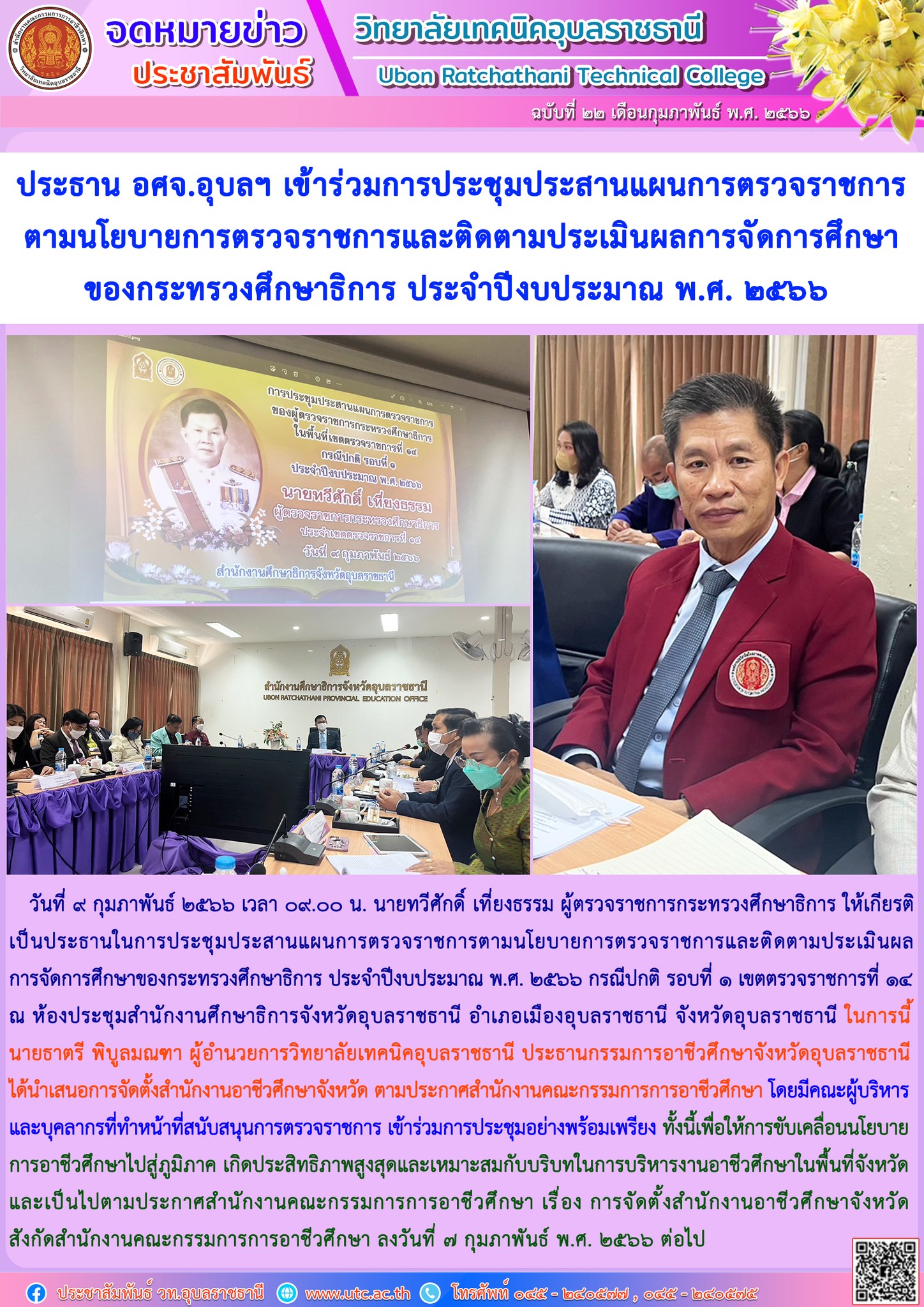 วันที่ ๙ กุมภาพันธ์๒๕๖๖ เวลา ๐๙.๐๐ น. นายทวีศักดิ์ เที่ยงธรรม ผู้ตรวจราชการกระทรวงศึกษาธิการ ให้เกียรติเป็นประธานในการประชุมประสานแผนการตรวจราชการตามนโยบายการตรวจราชการและติดตามประเมินผลการจัดการศึกษาของกระทรวงศึกษาธิการ ประจำปีงบประมาณ พ.ศ. ๒๕๖๖ กรณีปกติ รอบที่ ๑ เขตตรวจราชการที่ ๑๔ ณ ห้องประชุมสำนักงานศึกษาธิการจังหวัดอุบลราชธานี อำเภอเมืองอุบลราชธานี จังหวัดอุบลราชธานี ในการนี้นายธาตรี พิบูลมณฑา ผู้อำนวยการวิทยาลัยเทคนิคอุบลราชธานี ประธานกรรมการอาชีวศึกษาจังหวัดอุบลราชธานี ได้นำเสนอการจัดตั้งสำนักงานอาชีวศึกษาจังหวัด ตามประกาศสำนักงานคณะกรรมการการอาชีวศึกษา โดยมีคณะผู้บริหาร และบุคลากรที่ทำหน้าที่สนับสนุนการตรวจราชการ เข้าร่วมการประชุมอย่างพร้อมเพรียง ทั้งนี้เพื่อให้การขับเคลื่อนนโยบาย การอาชีวศึกษาไปสู่ภูมิภาค เกิดประสิทธิภาพสูงสุดและเหมาะสมกับบริบทในการบริหารงานอาชีวศึกษาในพื้นที่จังหวัด และเป็นไปตามประกาศสำนักงานคณะกรรมการการอาชีวศึกษา เรื่อง การจัดตั้งสำนักงานอาชีวศึกษาจังหวัด สังกัดสำนักงานคณะกรรมการการอาชีวศึกษา ลงวันที่ ๗ กุมภาพันธ์ พ.ศ. ๒๕๖๖ ต่อไป