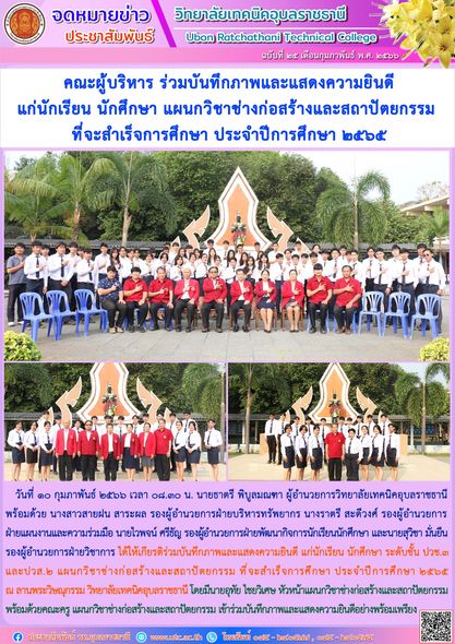 วันที่ ๑๐ กุมภาพันธ์ ๒๕๖๖ เวลา ๐๘.๓๐ น. นายธาตรี พิบูลมณฑา ผู้อำนวยการวิทยาลัยเทคนิคอุบลราชธานี พร้อมด้วย นางสาวสายฝน สาระผล รองผู้อำนวยการฝ่ายบริหารทรัพยากร นางราตรี สะดีวงศ์ รองผู้อำนวยการฝ่ายแผนงานและความร่วมมือ นายไวพจน์ ศรีธัญ รองผู้อำนวยการฝ่ายพัฒนากิจการนักเรียนนักศึกษา และนายสุวิชา มั่นยืน รองผู้อำนวยการฝ่ายวิชาการ ได้ให้เกียรติร่วมบันทึกภาพและแสดงความยินดี แก่นักเรียน นักศึกษา ระดับชั้น ปวช.๓ และปวส.๒ แผนกวิชาช่างก่อสร้างและสถาปัตยกรรม ที่จะสำเร็จการศึกษา ประจำปีการศึกษา ๒๕๖๕ ณ ลานพระวิษณุกรรม วิทยาลัยเทคนิคอุบลราชธานี โดยมีนายอุทัย ไชยวิเศษ หัวหน้าแผนกวิชาช่างก่อสร้างและสถาปัตยกรรม พร้อมด้วยคณะครู แผนกวิชาช่างก่อสร้างและสถาปัตยกรรม เข้าร่วมแสดงความยินดีอย่างพร้อมเพรียง