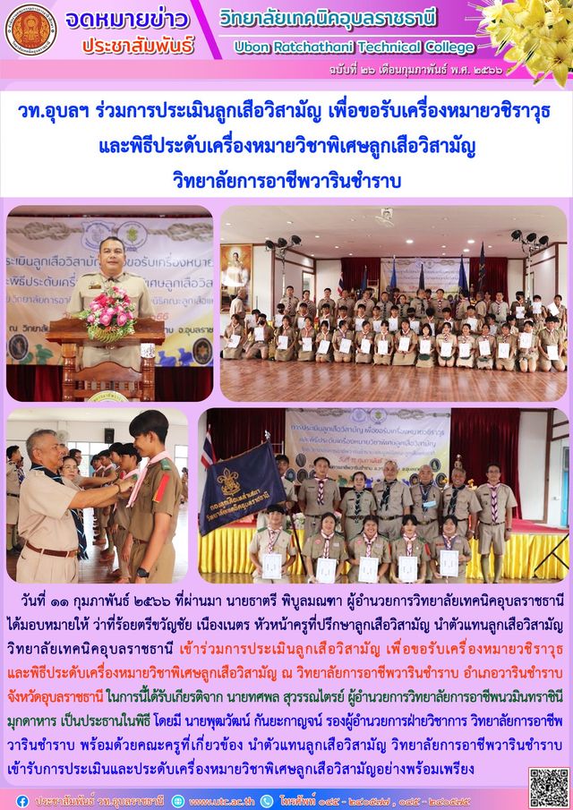 วันที่ ๑๑ กุมภาพันธ์๒๕๖๖ ที่ผ่านมา นายธาตรี พิบูลมณฑา ผู้อำนวยการวิทยาลัยเทคนิคอุบลราชธานี ได้มอบหมายให้ ว่าที่ร้อยตรีขวัญชัย เนืองเนตร หัวหน้าครูที่ปรึกษาลูกเสือวิสามัญ นำตัวแทนลูกเสือวิสามัญ วิทยาลัยเทคนิคอุบลราชธานี เข้าร่วมการประเมินลูกเสือวิสามัญ เพื่อขอรับเครื่องหมายวชิราวุธ และพิธีประดับเครื่องหมายวิชาพิเศษลูกเสือวิสามัญ ณ วิทยาลัยการอาชีพวารินชำราบ อำเภอวารินชำราบ จังหวัดอุบลราชธานี ในการนี้ได้รับเกียรติจาก นายทศพล สุวรรณไตรย์ ผู้อำนวยการวิทยาลัยการอาชีพนวมินทราชินีมุกดาหาร เป็นประธานในพิธี โดยมี นายพุฒวัฒน์ กันยะกาญจน์ รองผู้อำนวยการฝ่ายวิชาการ วิทยาลัยการอาชีพวารินชำราบ พร้อมด้วยคณะครูที่เกี่ยวข้อง นำตัวแทนลูกเสือวิสามัญ วิทยาลัยการอาชีพวารินชำราบ เข้ารับการประเมินและประดับเครื่องหมายวิชาพิเศษลูกเสือวิสามัญอย่างพร้อมเพรียง