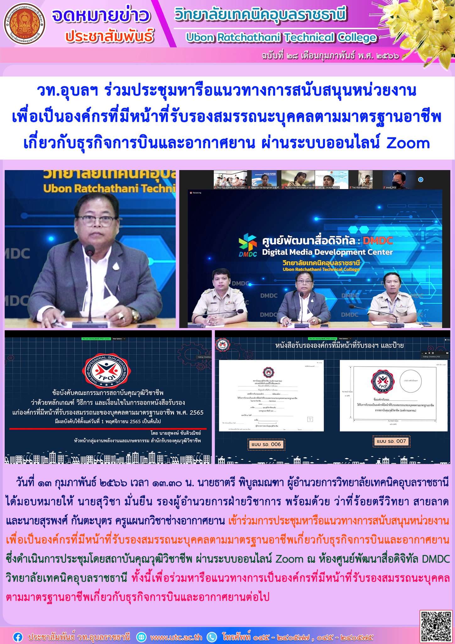 วันที่ ๑๓ กุมภาพันธ์ ๒๕๖๖ เวลา ๑๓.๓๐ น. นายธาตรี พิบูลมณฑา ผู้อำนวยการวิทยาลัยเทคนิคอุบลราชธานี ได้มอบหมายให้ นายสุวิชา มั่นยืน รองผู้อำนวยการฝ่ายวิชาการ พร้อมด้วย ว่าที่ร้อยตรีวิทยา สายลาด และนายสุรพงศ์ กันตะบุตร ครูแผนกวิชาช่างอากาศยาน เข้าร่วมการประชุมหารือแนวทางการสนับสนุนหน่วยงานเพื่อเป็นองค์กรที่มีหน้าที่รับรองสมรรถนะบุคคลตามมาตรฐานอาชีพเกี่ยวกับธุรกิจการบินและอากาศยาน ซึ่งดำเนินการประชุมโดยสถาบันคุณวุฒิวิชาชีพ ผ่านระบบออนไลน์ Zoom ณ ห้องศูนย์พัฒนาสื่อดิจิทัล DMDC วิทยาลัยเทคนิคอุบลราชธานี ทั้งนี้เพื่อร่วมหารือแนวทางการเป็นองค์กรที่มีหน้าที่รับรองสมรรถนะบุคคลตามมาตรฐานอาชีพเกี่ยวกับธุรกิจการบินและอากาศยานต่อไป