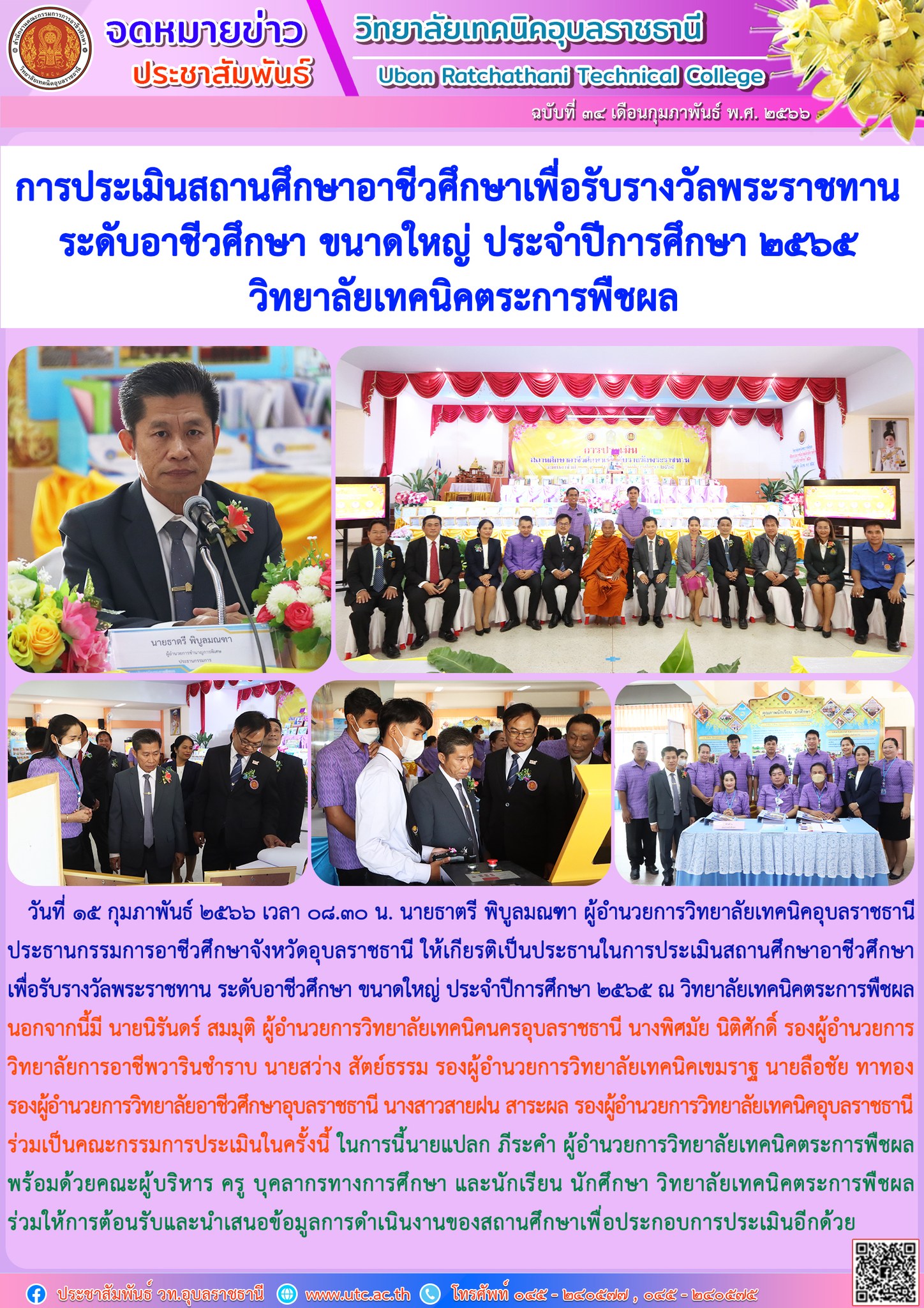 วันที่ ๑๕ กุมภาพันธ์ ๒๕๖๖ เวลา ๐๘.๓๐ น. นายธาตรีพิบูลมณฑา ผู้อำนวยการวิทยาลัยเทคนิคอุบลราชธานี ประธานกรรมการอาชีวศึกษาจังหวัดอุบลราชธานี ให้เกียรติเป็นประธานในการประเมินสถานศึกษาอาชีวศึกษาเพื่อรับรางวัลพระราชทาน ระดับอาชีวศึกษา ขนาดใหญ่ ประจำปีการศึกษา ๒๕๖๕ ณ วิทยาลัยเทคนิคตระการพืชผล นอกจากนี้มี นายนิรันดร์ สมมุติ ผู้อำนวยการวิทยาลัยเทคนิคนครอุบลราชธานี นางพิศมัย นิติศักดิ์ รองผู้อำนวยการวิทยาลัยการอาชีพวารินชำราบ นายสว่าง สัตย์ธรรม รองผู้อำนวยการวิทยาลัยเทคนิคเขมราฐ นายลือชัย ทาทอง รองผู้อำนวยการวิทยาลัยอาชีวศึกษาอุบลราชธานี นางสาวสายฝน สาระผล รองผู้อำนวยการวิทยาลัยเทคนิคอุบลราชธานี ร่วมเป็นคณะกรรมการประเมินในครั้งนี้ ในการนี้นายแปลก ภีระคํา ผู้อํานวยการวิทยาลัยเทคนิคตระการพืชผล พร้อมด้วยคณะผู้บริหาร ครู บุคลากรทางการศึกษา และนักเรียน นักศึกษา วิทยาลัยเทคนิคตระการพืชผล ร่วมให้การต้อนรับและนำเสนอข้อมูลการดำเนินงานของสถานศึกษาเพื่อประกอบการประเมินอีกด้วย