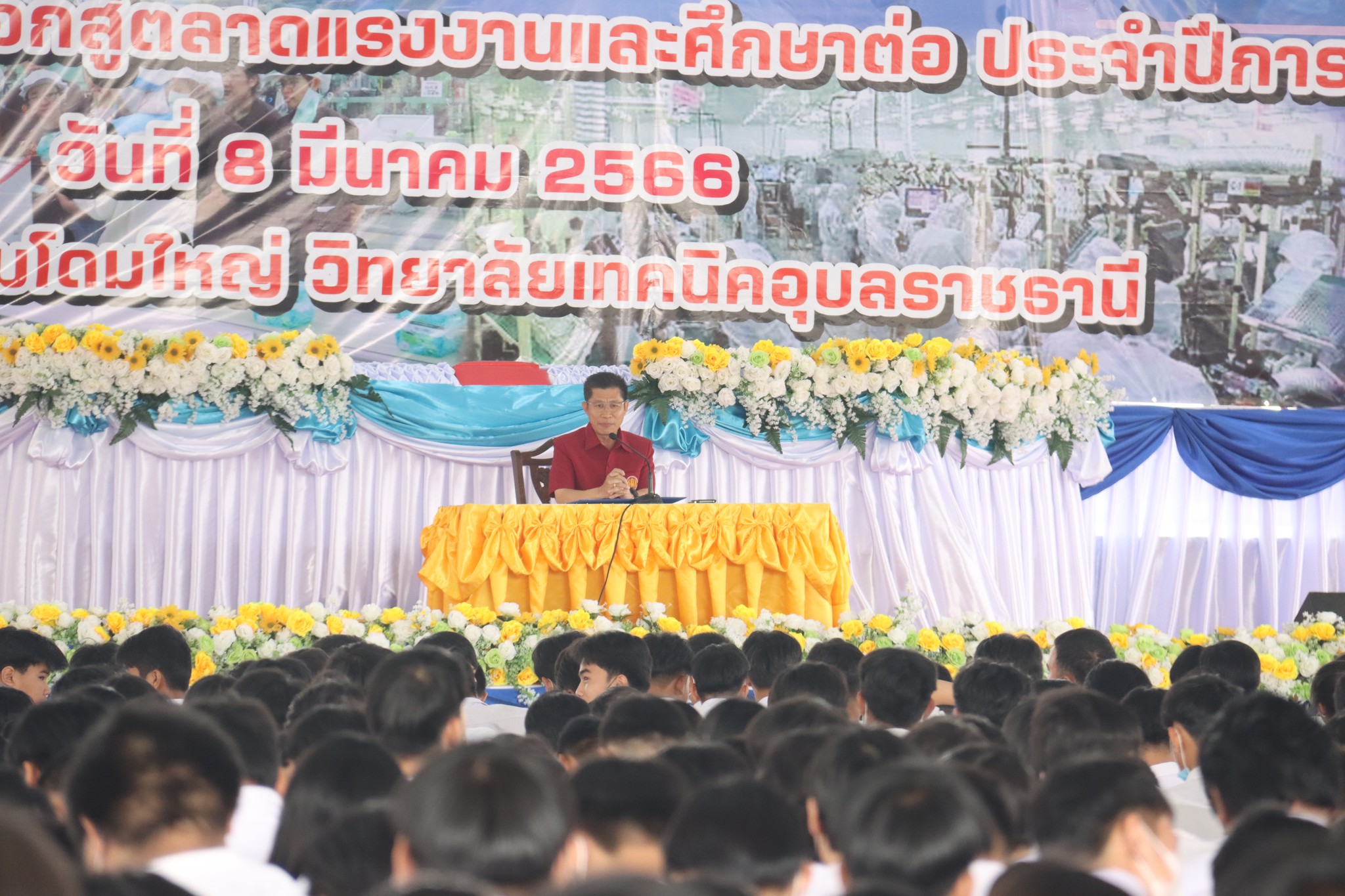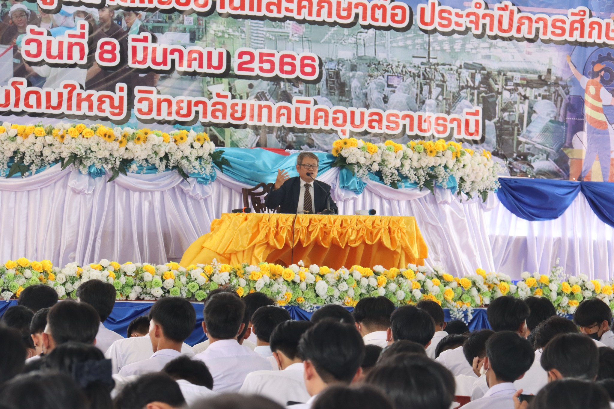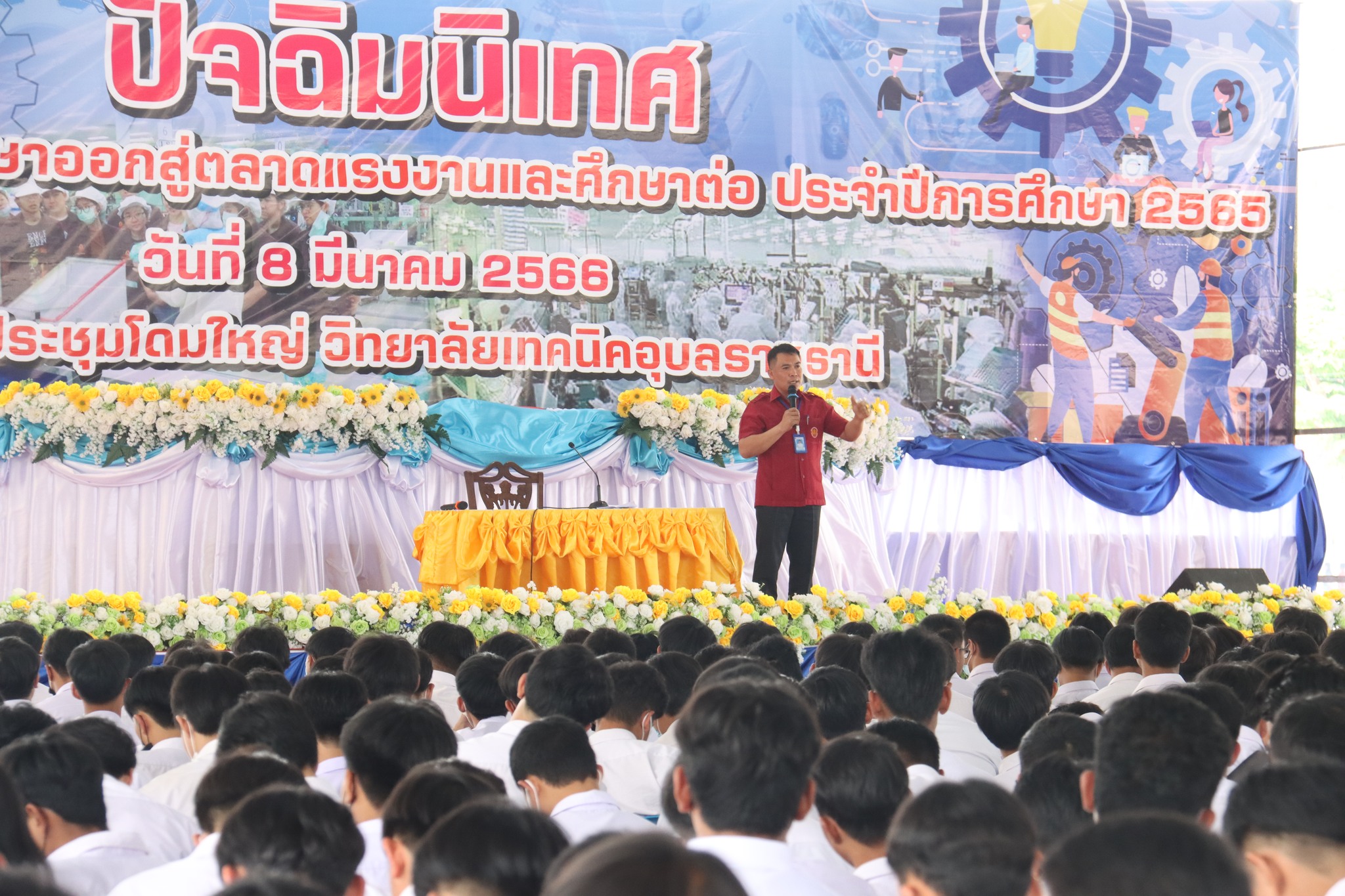 วันที่ ๘ มีนาคม ๒๕๖๖ เวลา ๐๘.๓๐ น. นายธาตรี พิบูลมณฑาผู้อำนวยการวิทยาลัยเทคนิคอุบลราชธานี ให้เกียรติเป็นประธานเปิดโครงการเตรียมความพร้อมผู้สำเร็จการศึกษาออกสู่ตลาดแรงงานและศึกษาต่อ (ปัจฉิมนิเทศ) ประจำปีการศึกษา ๒๕๖๕ ในการนี้มี นายไวพจน์ ศรีธัญ รองผู้อำนวยการฝ่ายพัฒนากิจการนักเรียนนักศึกษา เป็นผู้กล่าวรายงาน โดยมี นางสาวสายฝน สาระผล รองผู้อำนวยการฝ่ายบริหารทรัพยากร นางราตรี สะดีวงศ์ รองผู้อำนวยการฝ่ายแผนงานและความร่วมมือ พร้อมด้วยหัวหน้าแผนกวิชา หัวหน้างาน ครู และบุคลากรทางการศึกษาที่เกี่ยวข้อง นำนักเรียนระดับประกาศนียบัตรวิชาชีพ ชั้นปีที่ ๓ (ปวช.๓) และนักศึกษาระดับประกาศนียบัตรวิชาชีพชั้นสูง ชั้นปีที่ ๒ (ปวส.๒) เข้าร่วมพิธีอย่างพร้อมเพรียง ในการนี้ได้รับความอนุเคราะห์วิทยากรจากหน่วยงานต่างๆ ดังนี้ ๑.นายมงคล จุลทัศน์ ประธานหอการค้าจังหวัดอุบลราชธานี ๒.นายวินัย จันทรเกษม ผู้ช่วยผู้อำนวยการสถาบันการอาชีวศึกษาภาคตะวันออกเฉียงเหนือ ๔ ๓.รองศาสตราจารย์เอกรินทร์ วทัญญูเลิศสกุล อาจารย์คณะเทคโนโลยีอุตสาหกรรม มหาวิทยาลัยราชภัฏอุบลราชธานี ๔.นายพิชญุตม์ ทองปทุม นักวิชาการวัฒนธรรมปฏิบัติการ วัฒนธรรมจังหวัดอุบลราชธานี ให้เกียรติบรรยายให้ความรู้แก่นักเรียน นักศึกษา ณ หอประชุมโดมใหญ่ วิทยาลัยเทคนิคอุบลราชธานี