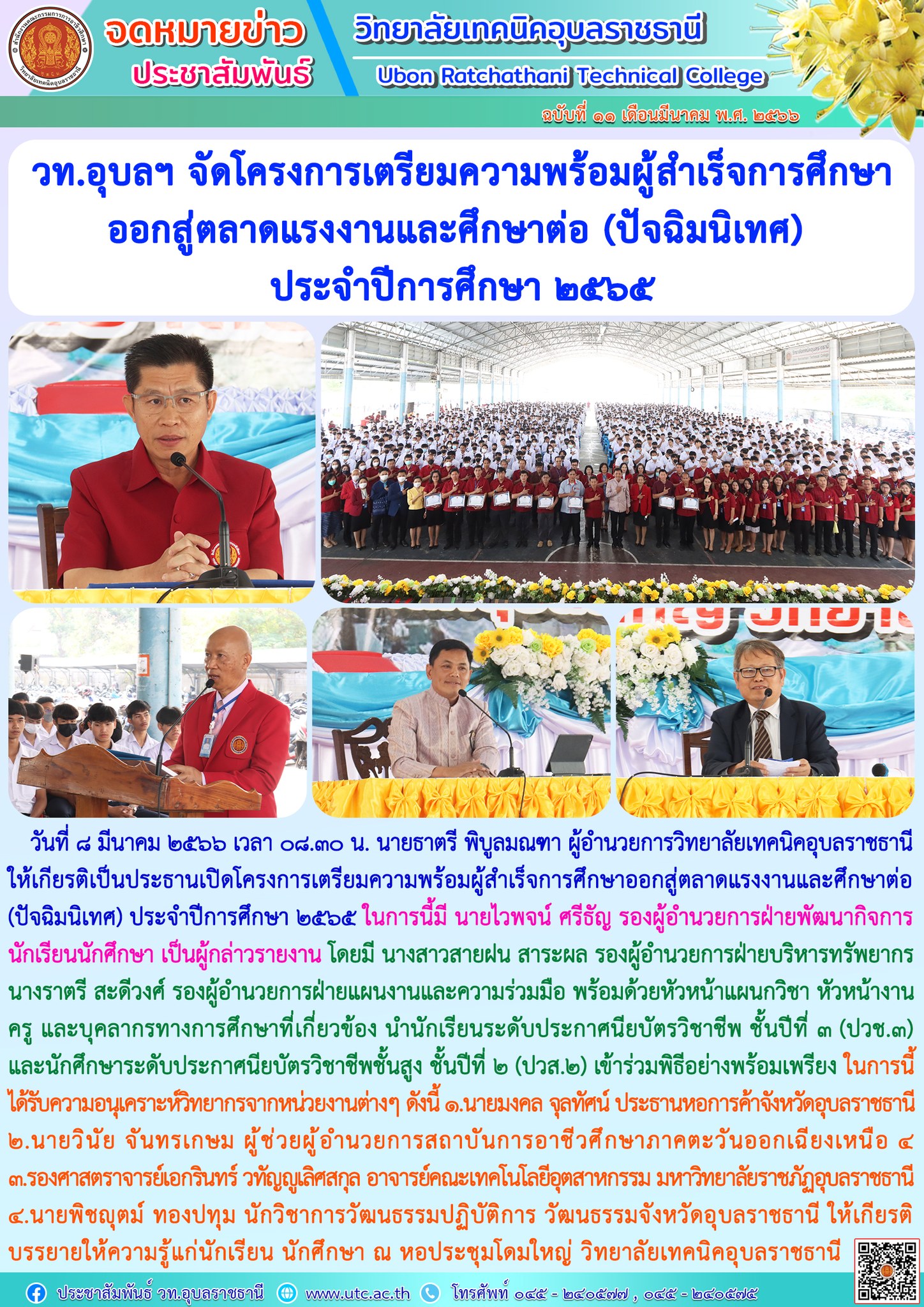 วท.อุบลฯ จัดโครงการเตรียมความพร้อมผู้สำเร็จการศึกษาออกสู่ตลาดแรงงานและศึกษาต่อ (ปัจฉิมนิเทศ) ประจำปีการศึกษา ๒๕๖๕